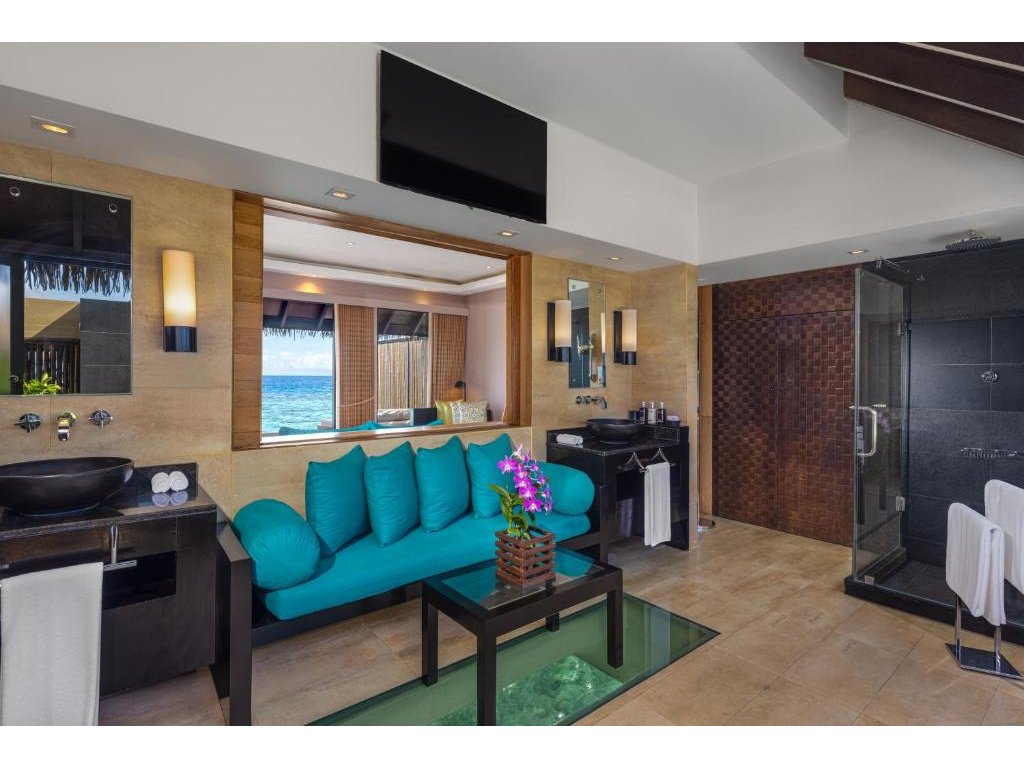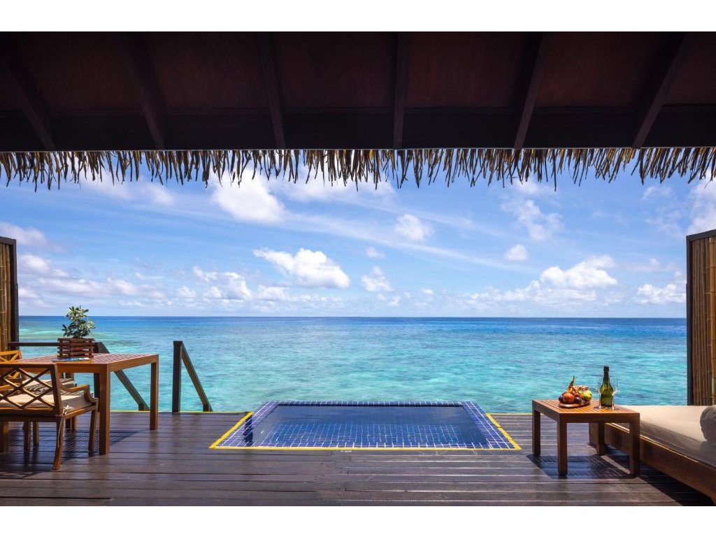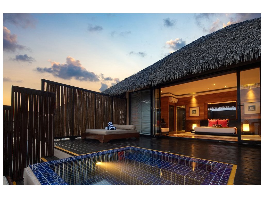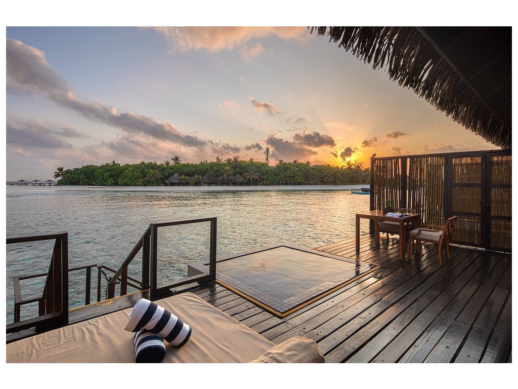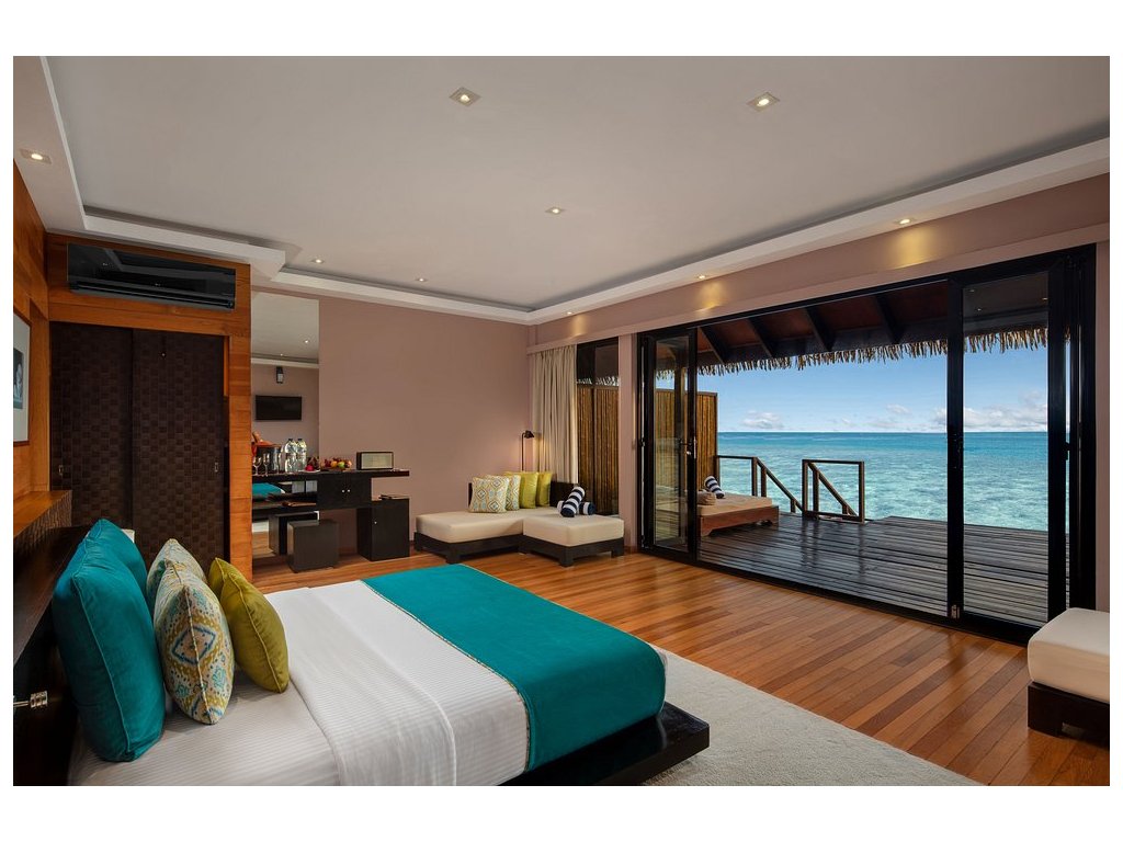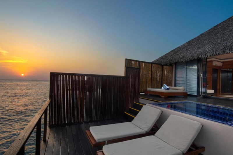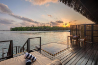 Nadvodní vila s prostornou terasou, soukromou jacuzzi, ložnicí s výhledem na oceán a přímým přístupem do laguny. Vybavena moderním nábytkem, venkovní sprchou a službami osobního komorníka.