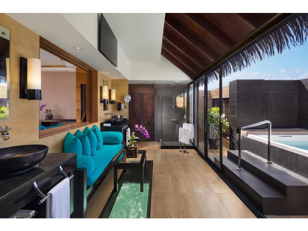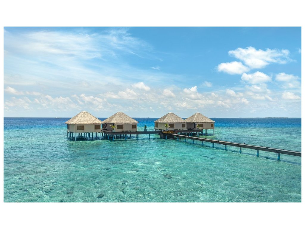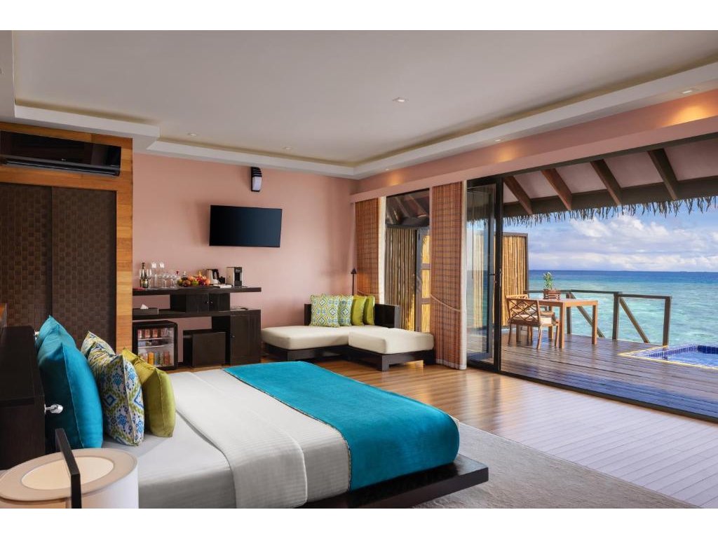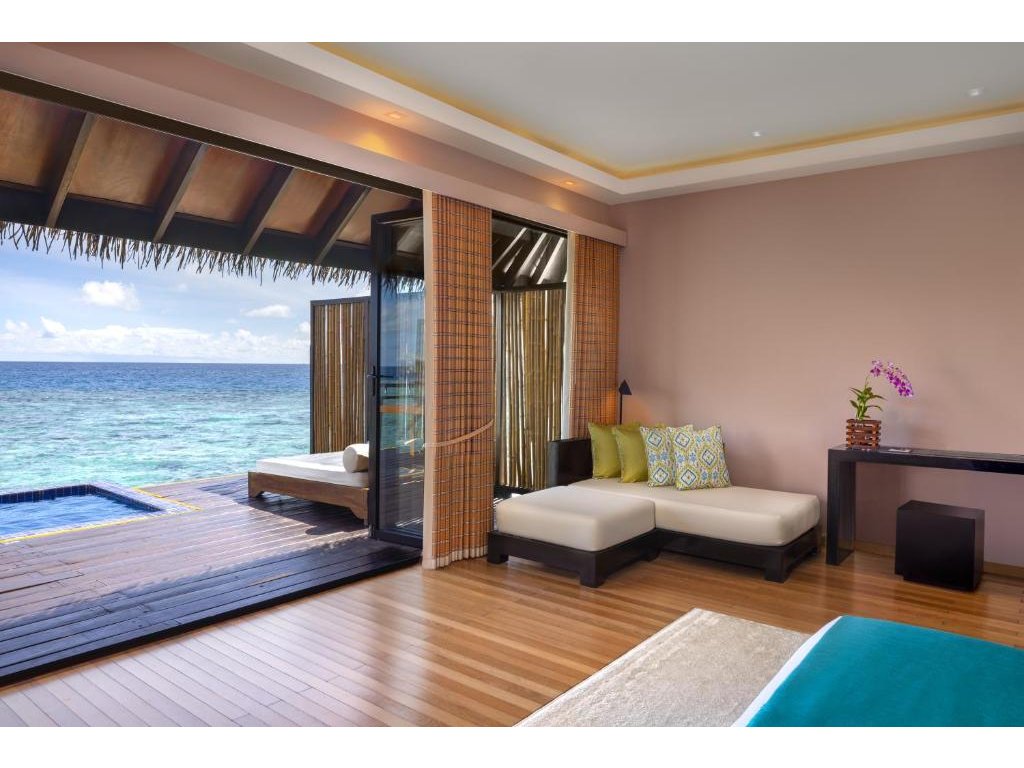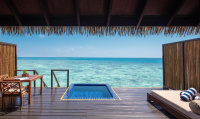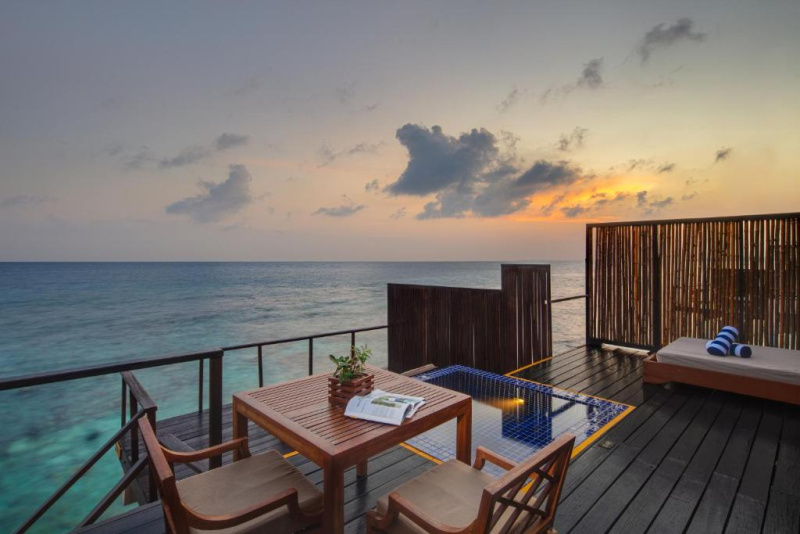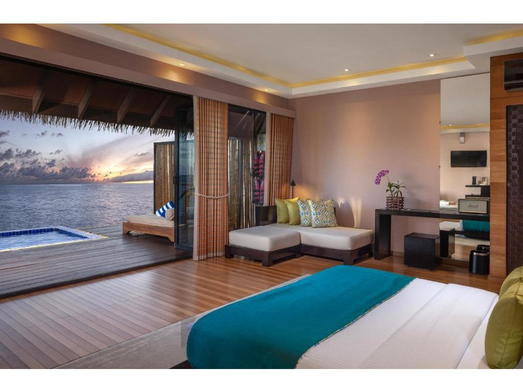 Nadvodní vila s prostornou terasou, soukromou jacuzzi, ložnicí s výhledem na oceán a přímým přístupem do laguny. Vybavena moderním nábytkem, venkovní sprchou a službami osobního komorníka.