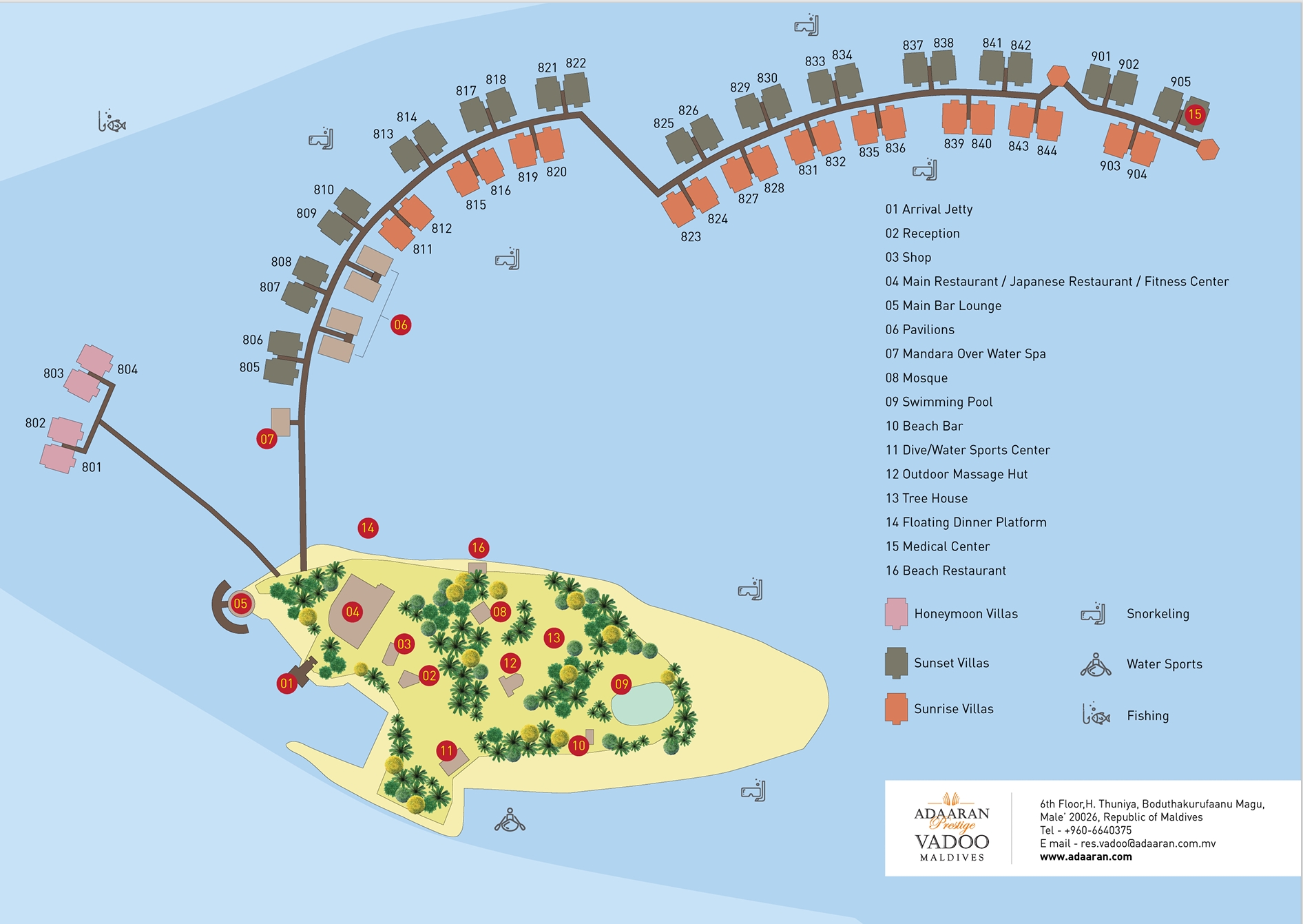 Adaaran Prestige Vadoo je menší, ale velmi dobře vybavený resort. Vily jsou plně nad vodou, mají vlastní bazén, jacuzzi a velké terasy. Soukromí je zajištěno, ale díky kompaktnímu rozměru ostrova je vše snadno dostupné. Služby jsou na vysoké úrovni, hostům se věnuje osobní komorník, a to od přivítání až po odjezd. Vhodné pro páry, líbánky a klidnou dovolenou. Výhodou je velmi rychlý transfer z letiště. Resort má skvělý house reef na šnorchl. Menší nevýhodou jsou občasné výlety na prohlídku resortu z lokálních ostrovů což plně vynahrazuje poměr cena/kvalita.