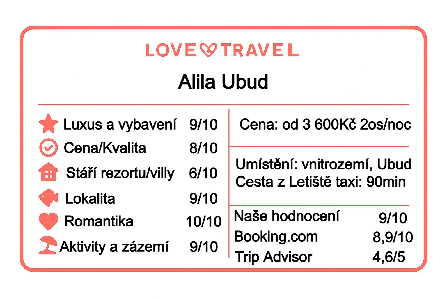 - Pokoje (Superior/Deluxe): 3 600–5 000 Kč/noc → skvělá volba pro „základnu” k objevování Ubudu.