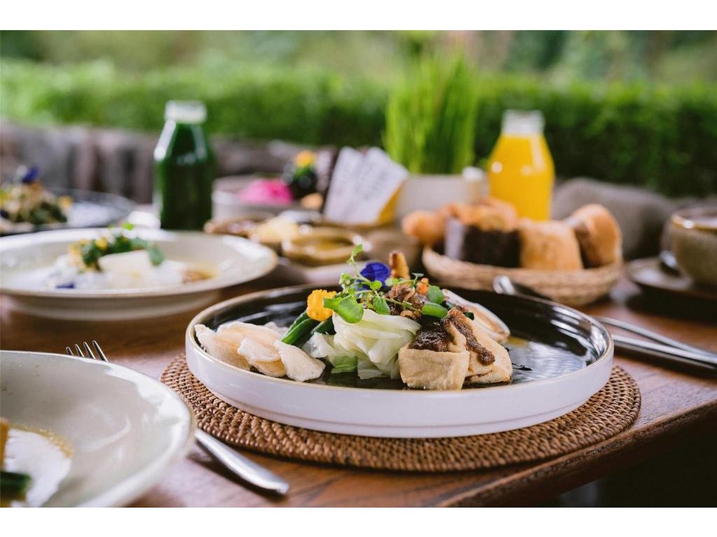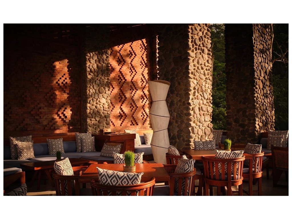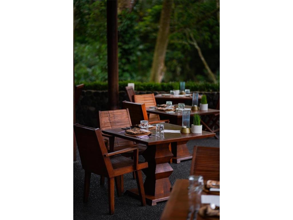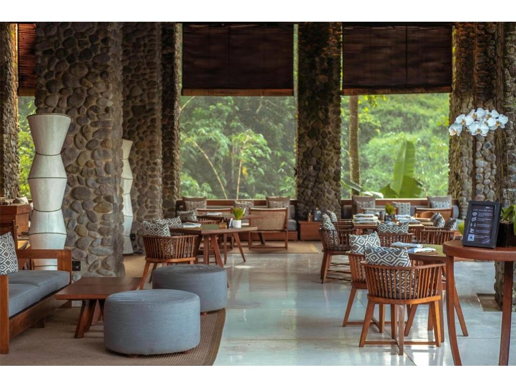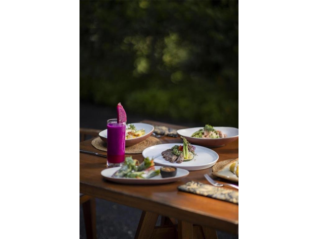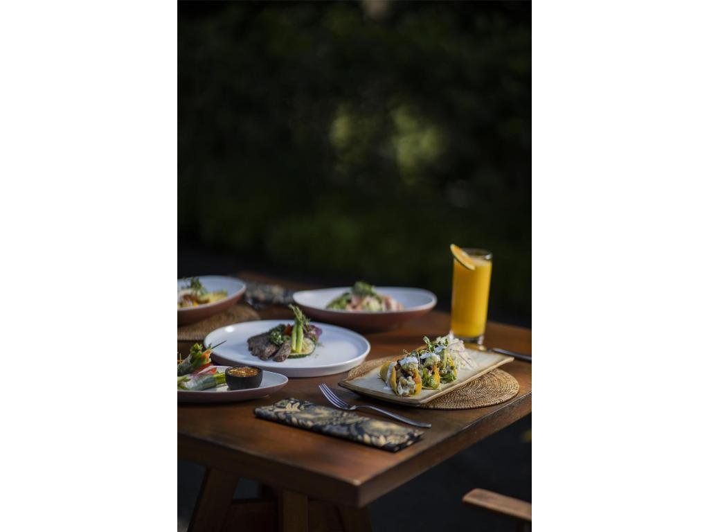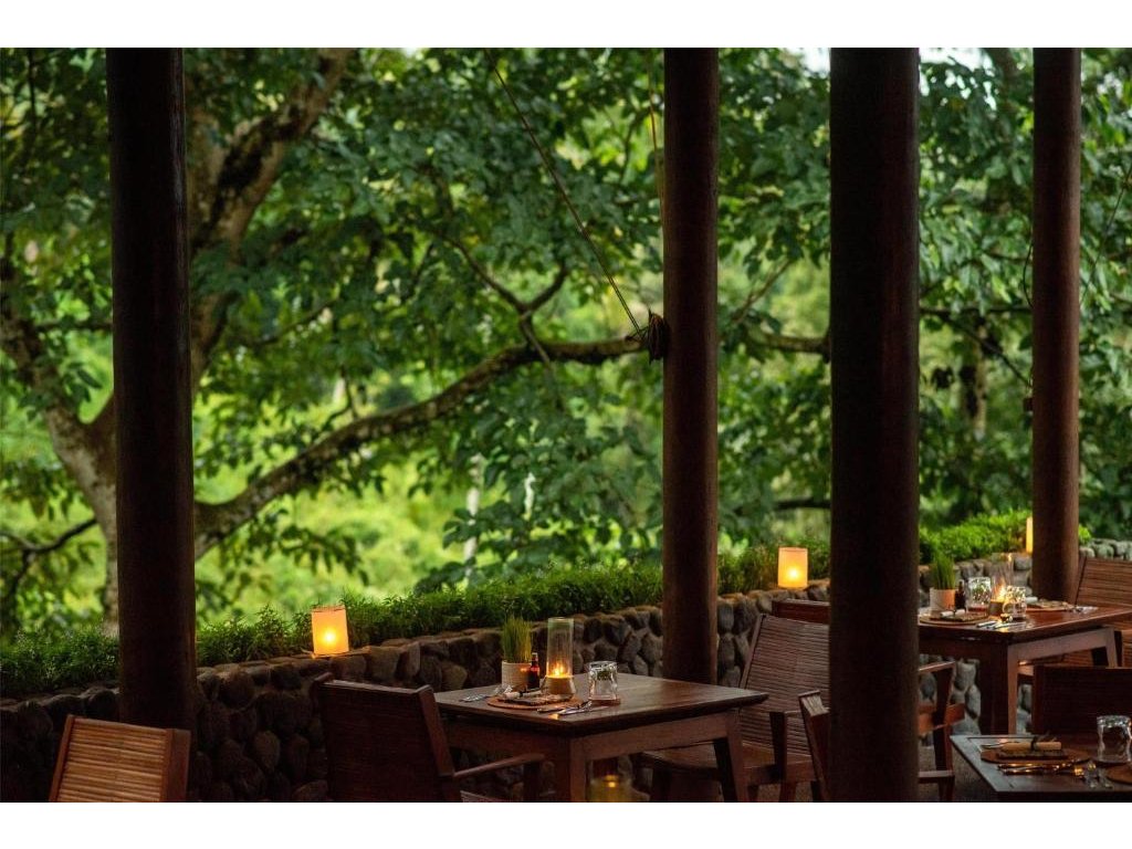 Hotelová restaurace (snídaně/oběd/večeře) s důrazem na sezónní a lokální suroviny, bar u bazénu pro odpolední koktejly. Možnost servírované snídaně s výhledem do džungle.