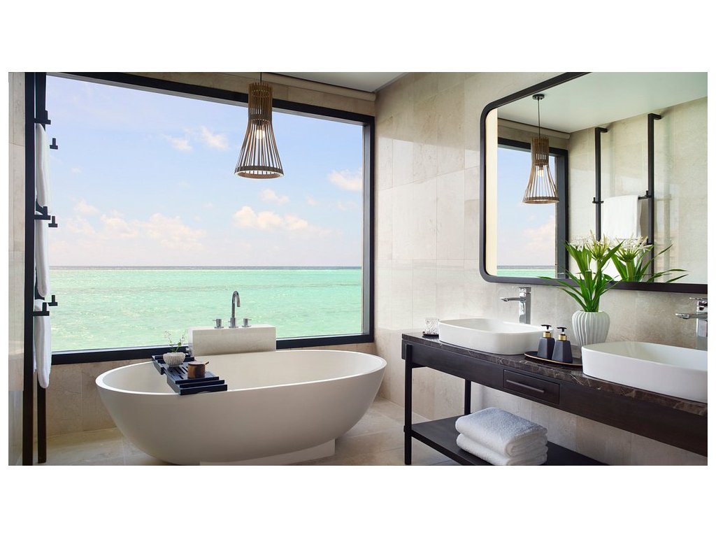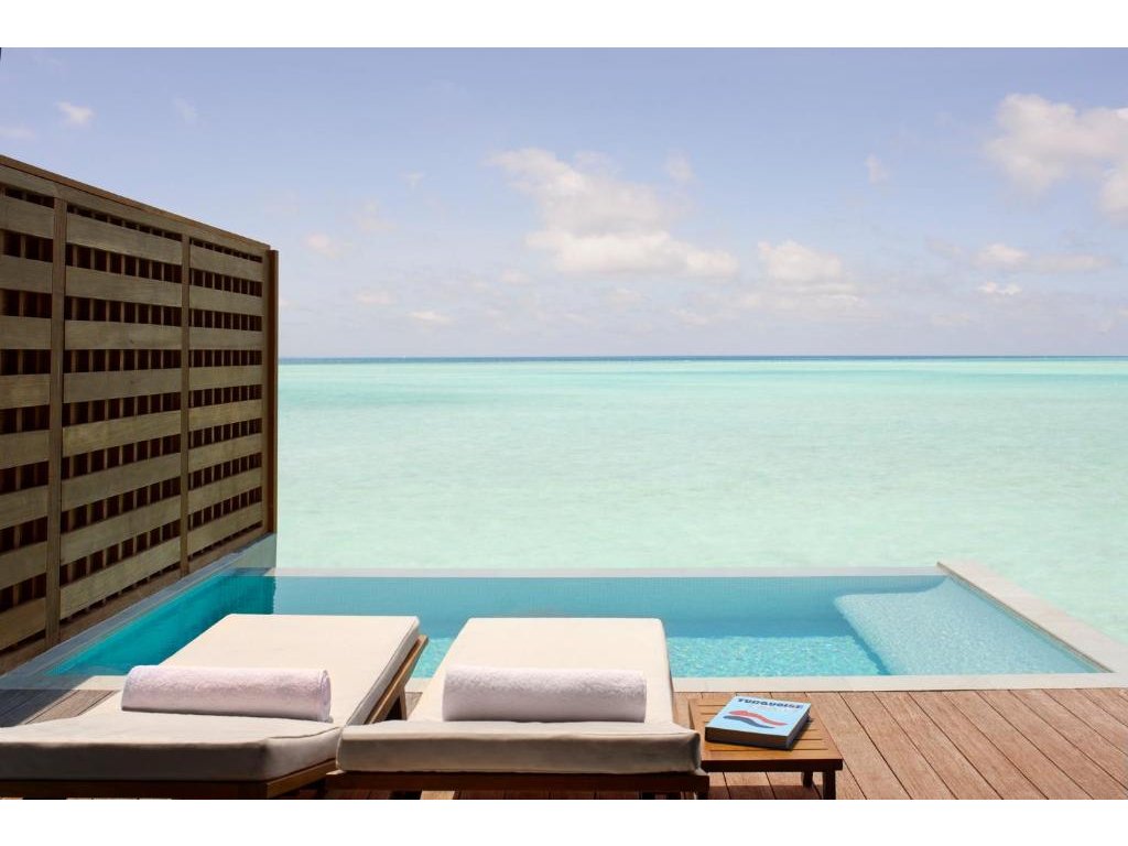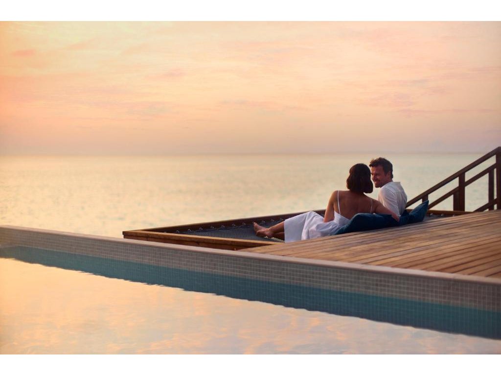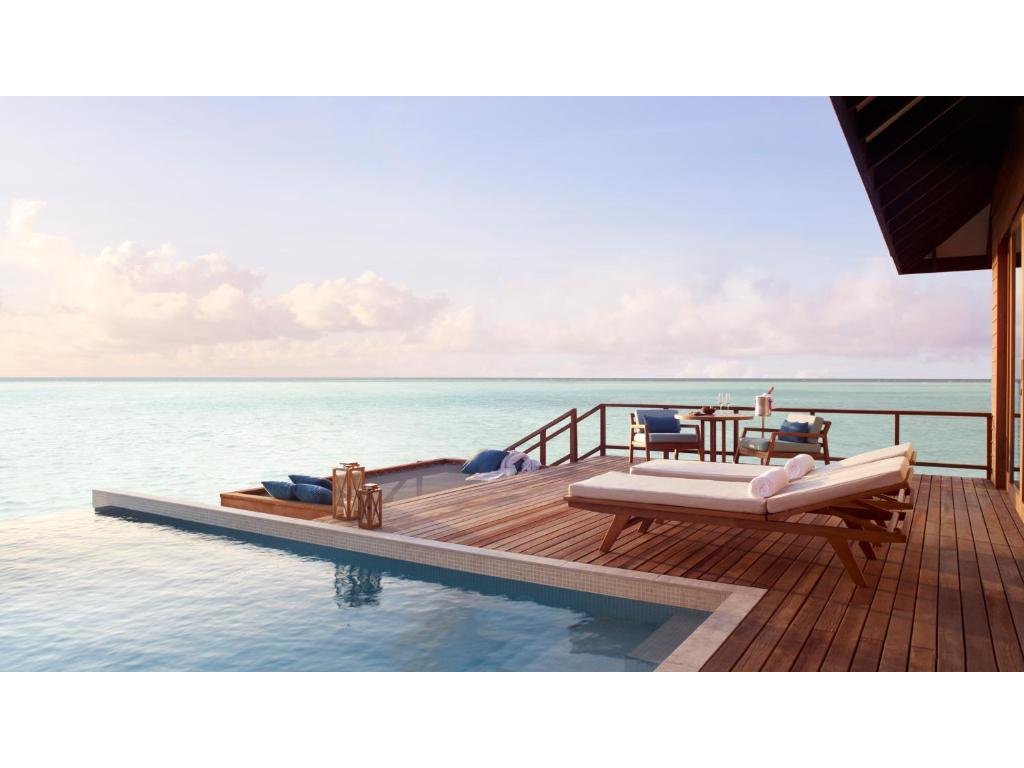 Vylepšený typ Over Water vily s větší terasou, samostatnou vanou, prostorným interiérem a dechberoucím výhledem na západ slunce.
