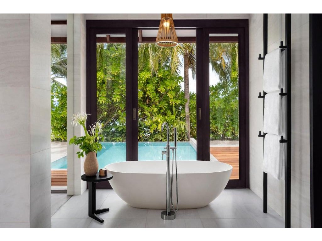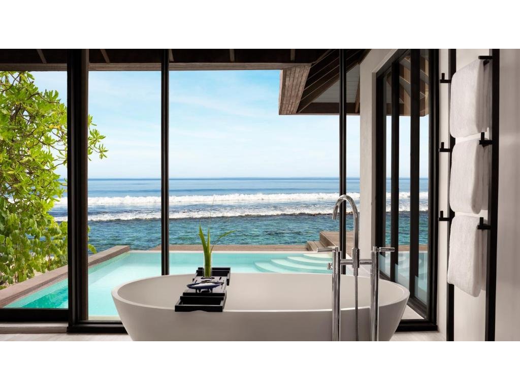 Stylová vila nad lagunou s přímým vstupem do moře, velkou terasou a prostornou ložnicí. Minimalistický interiér, výhled na oceán a koupelna s vanou i sprchou.