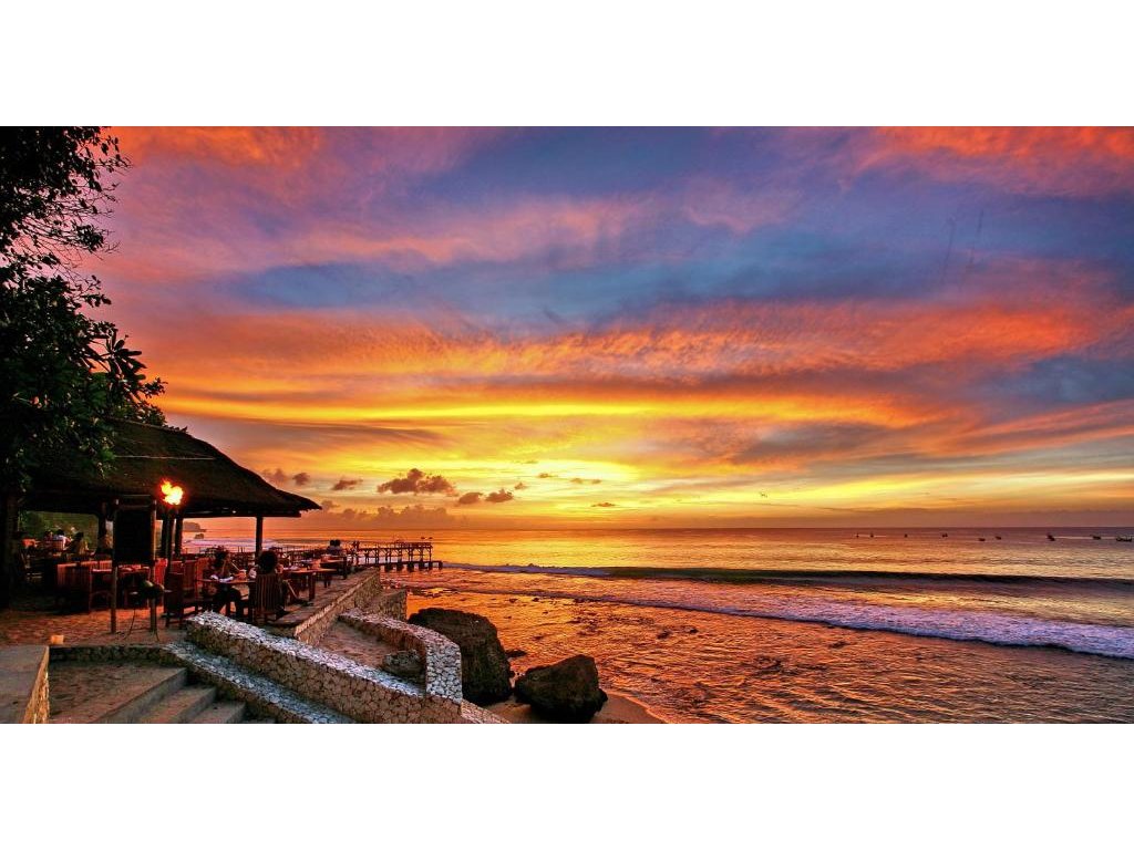 Jih Bali – Jimbaran Bay / útes nad oceánem. Klidnější oblast s vyhlášenými rybími restauracemi na pláži, skvělé západy slunce, dobré napojení na Uluwatu i Nusa Duu.