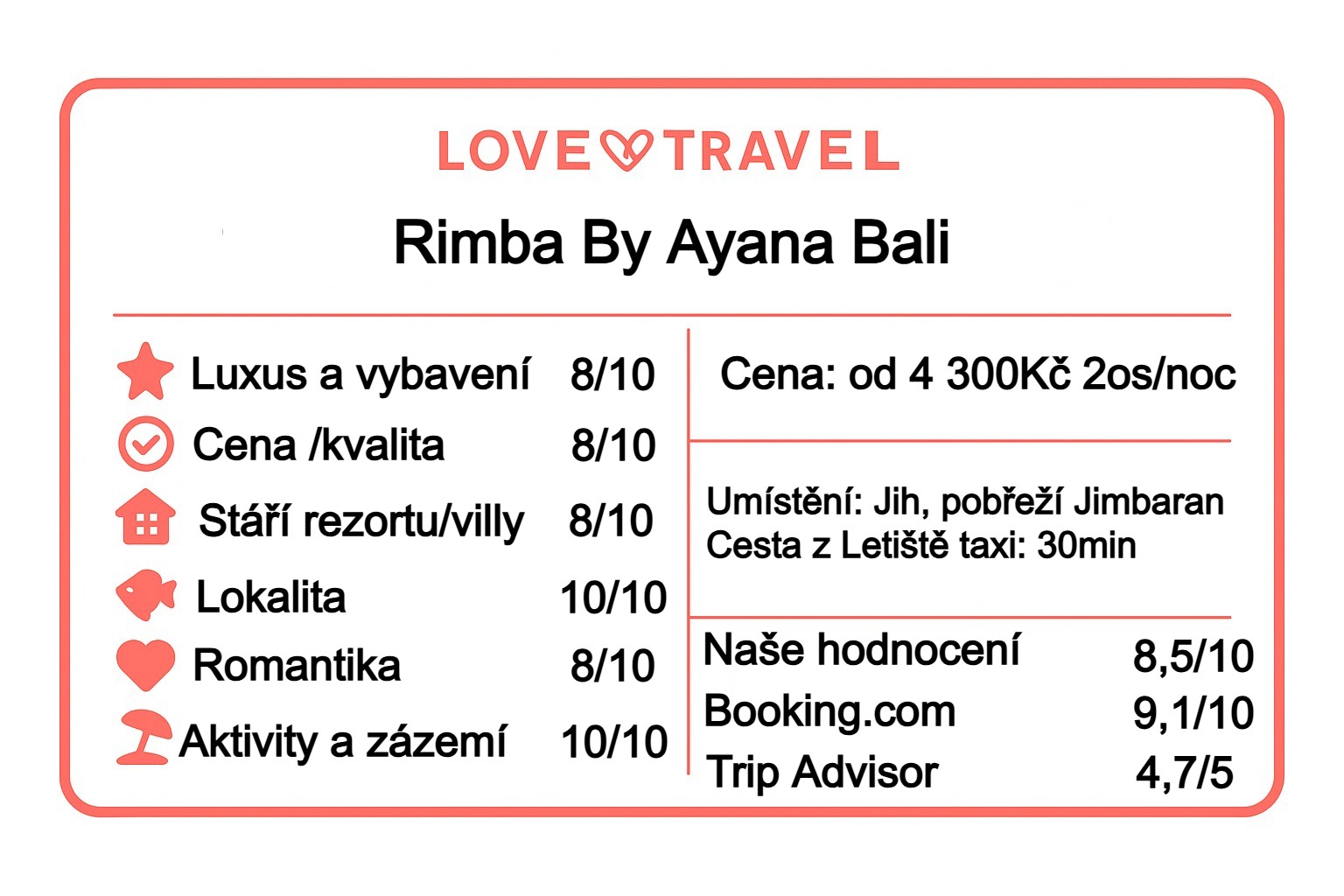 - Poměr cena/výkon: velmi dobrý v rámci 5★ pobřežní oblasti Jimbaran – výhodou je přístup k atrakcím celého AYANA Estate (pláž, Rock Bar, spa, desítky restaurací) v ceně ubytování.