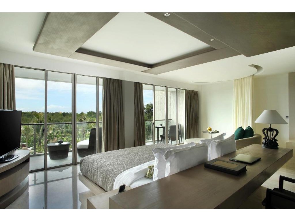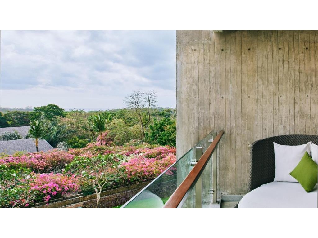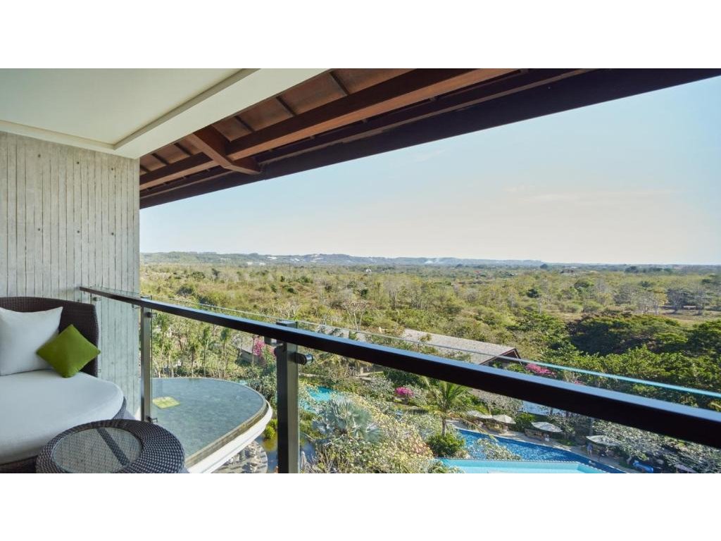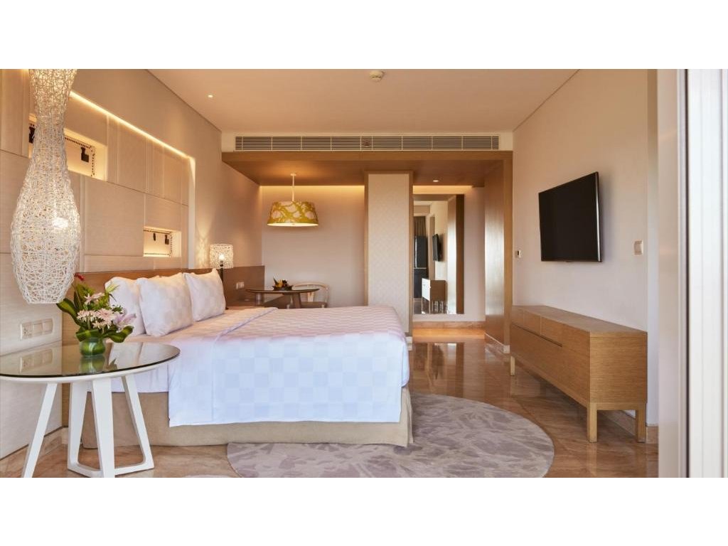 42 m² | Pokoj orientovaný směrem k Jimbaran Bay; vzdušný interiér, klidná zóna, balkon/terasa.