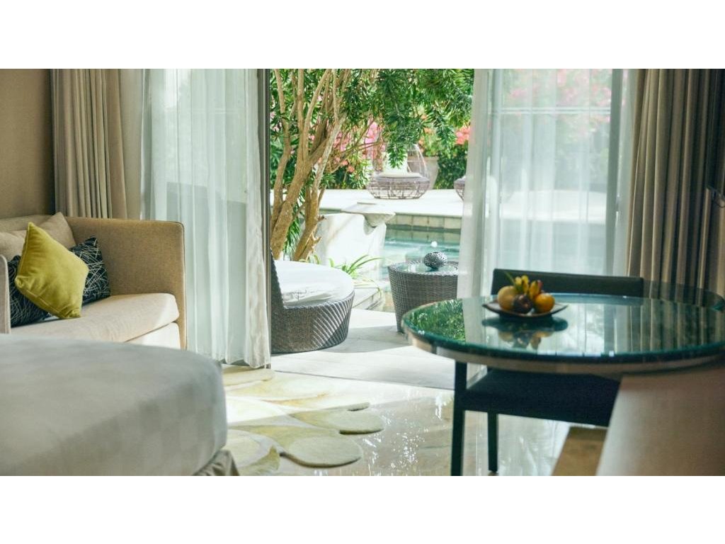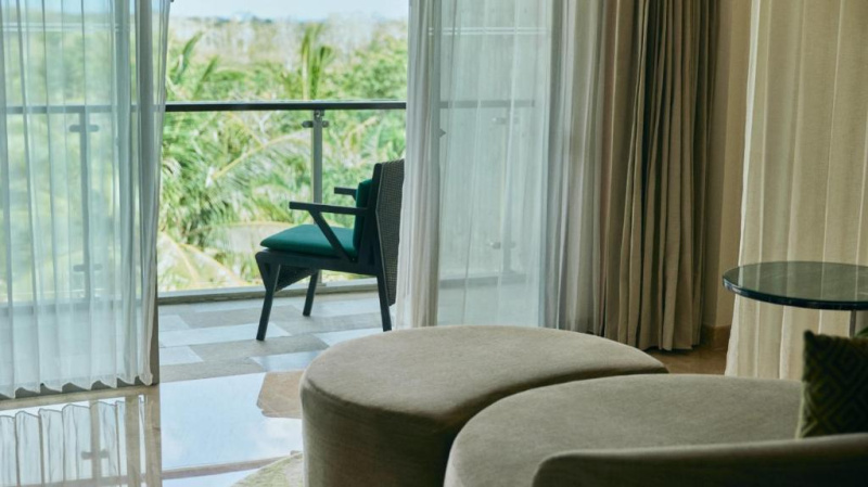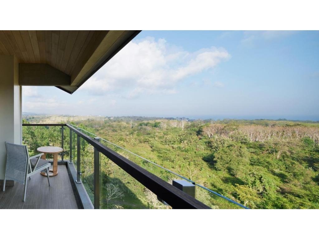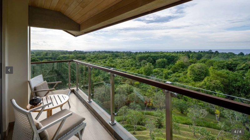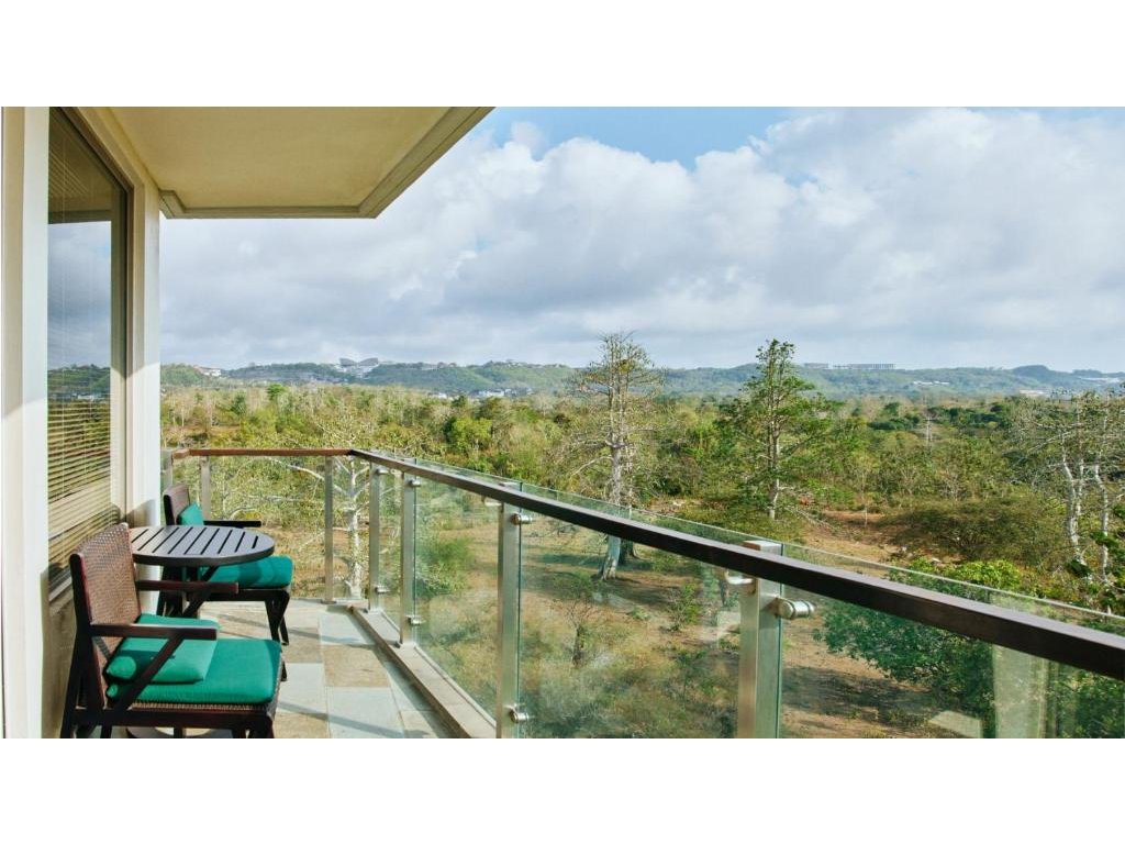42 m² | Pokoj orientovaný směrem k Jimbaran Bay; vzdušný interiér, klidná zóna, balkon/terasa.