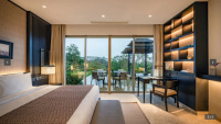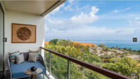 cca 58–65 m² | Pokoj orientovaný směrem k Jimbaran Bay. Vzdušný interiér, posezení, balkon/terasa na západy slunce.