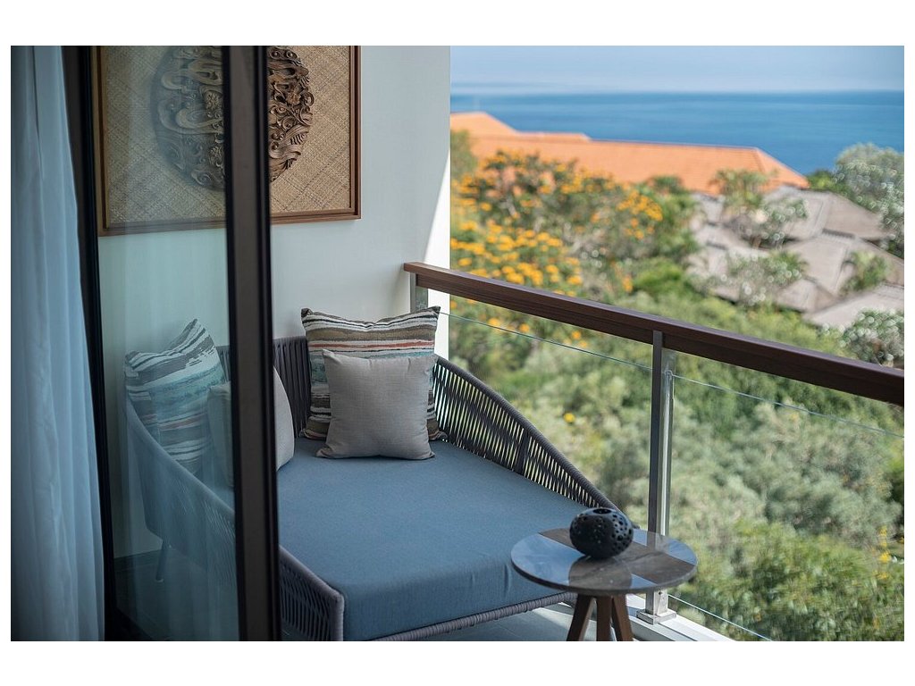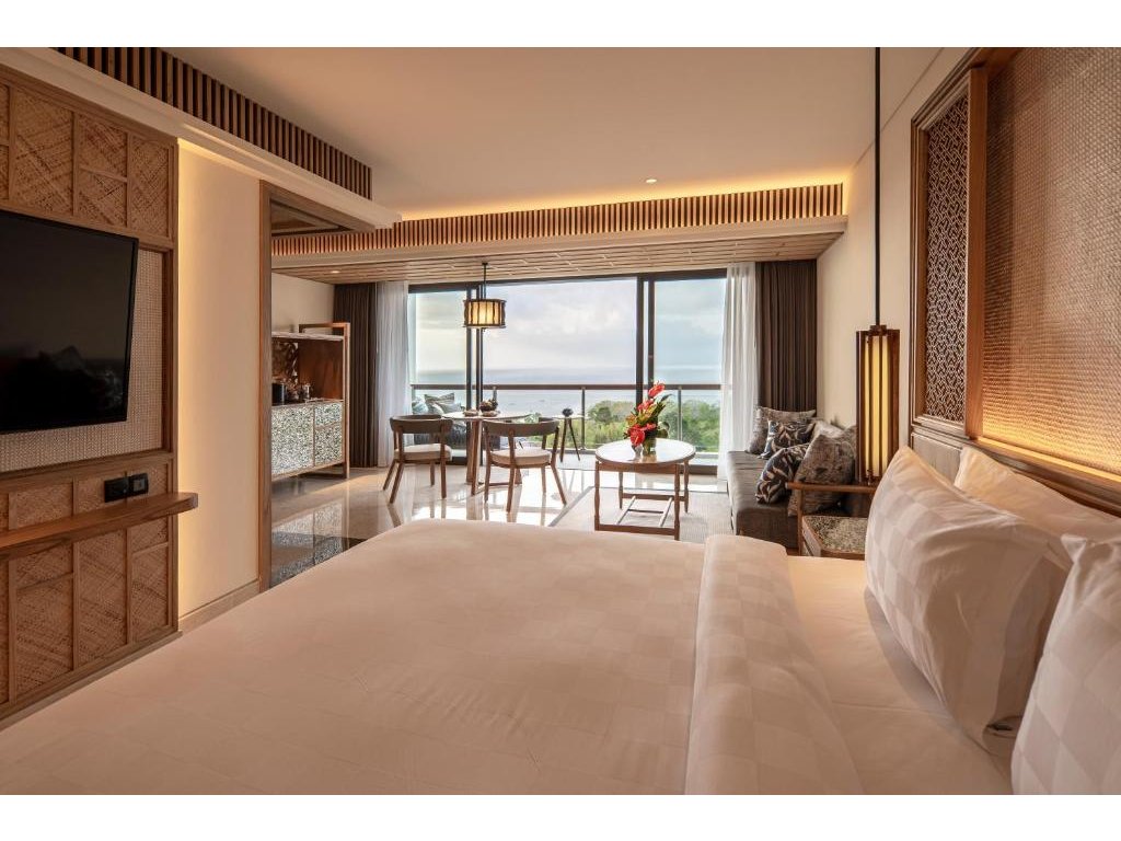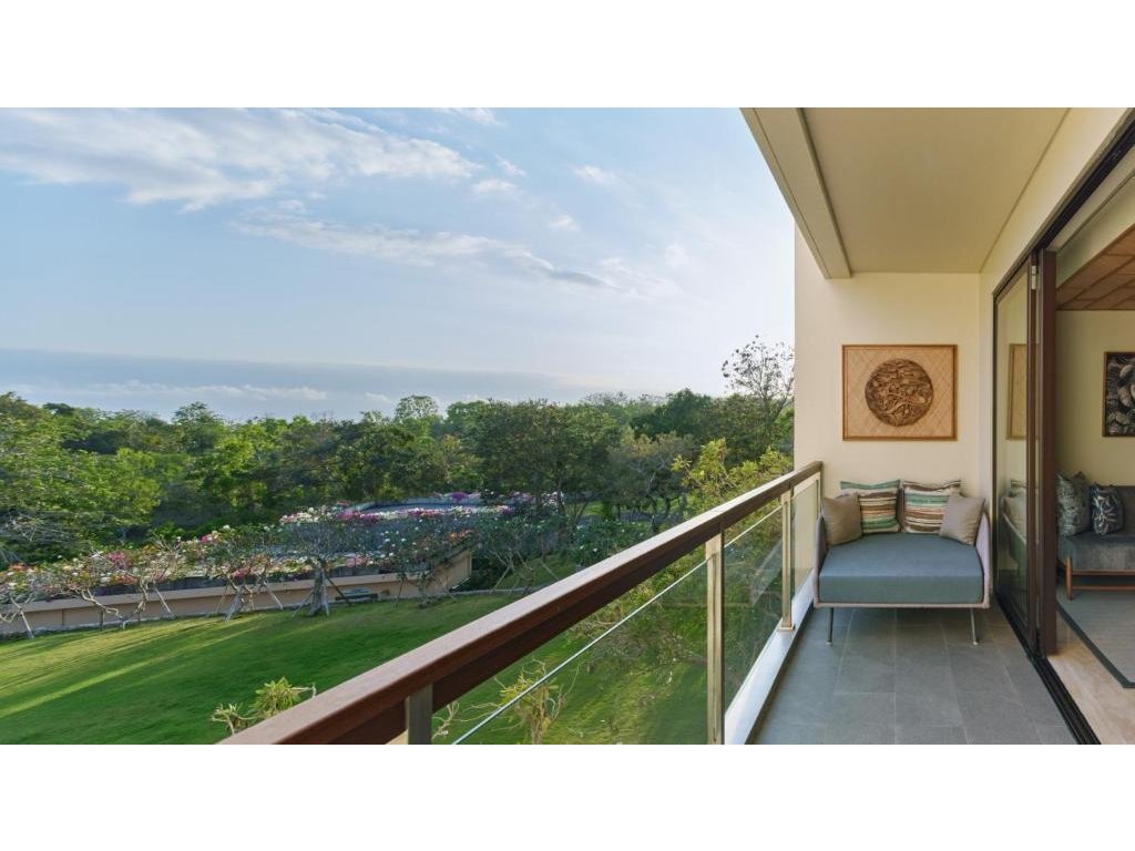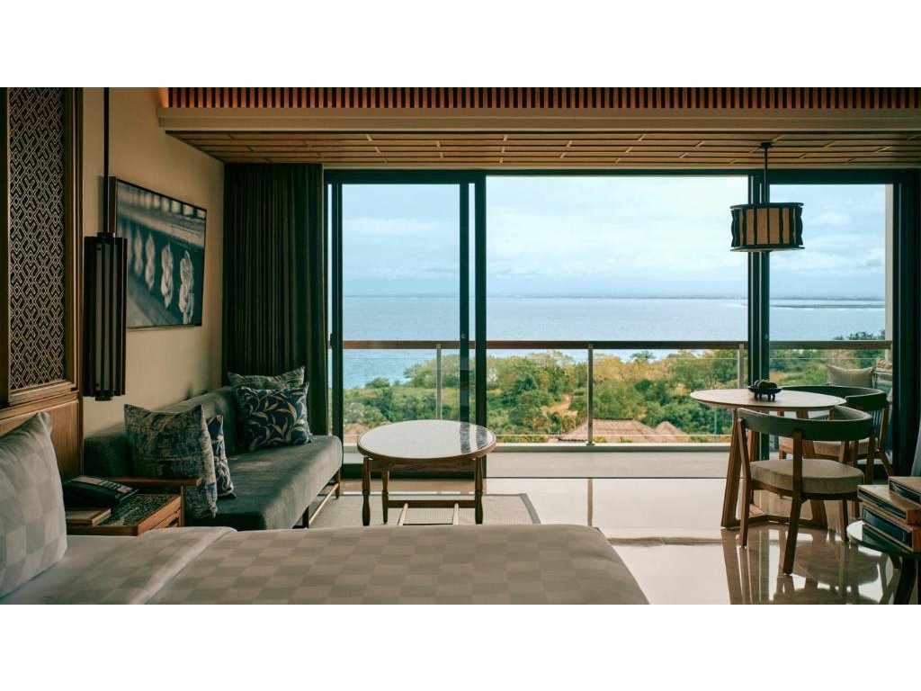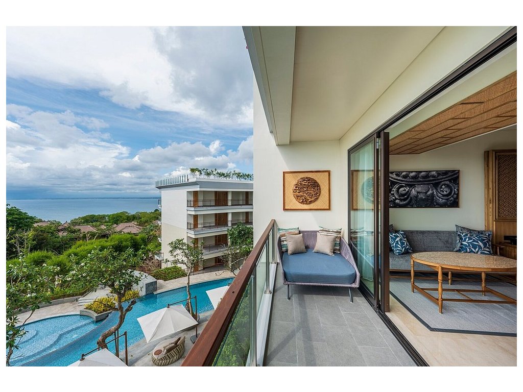 cca 58–65 m² | Pokoj orientovaný směrem k Jimbaran Bay. Vzdušný interiér, posezení, balkon/terasa na západy slunce.
