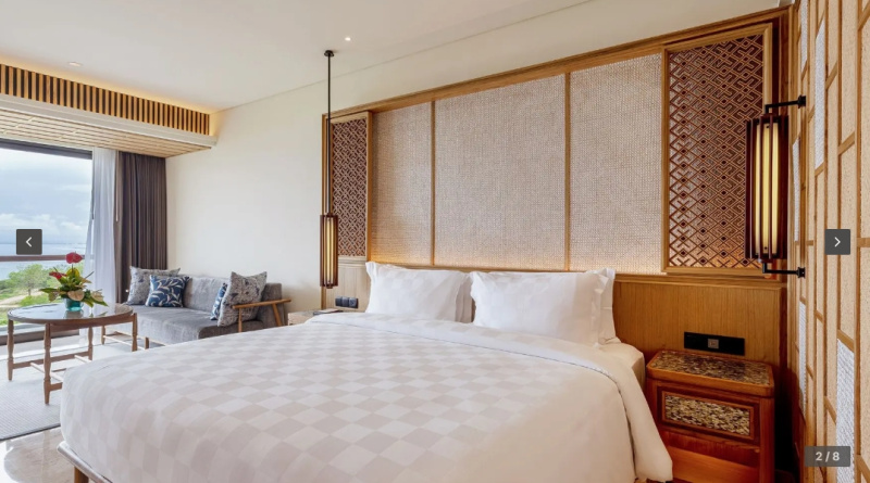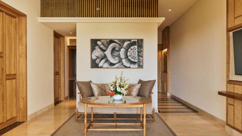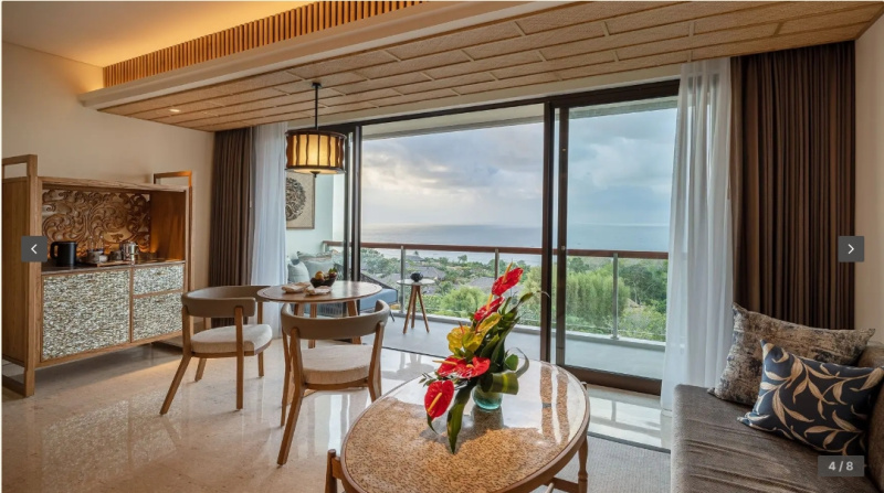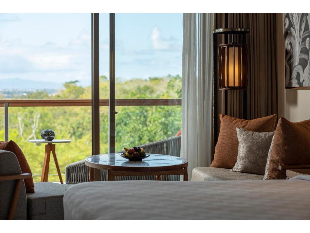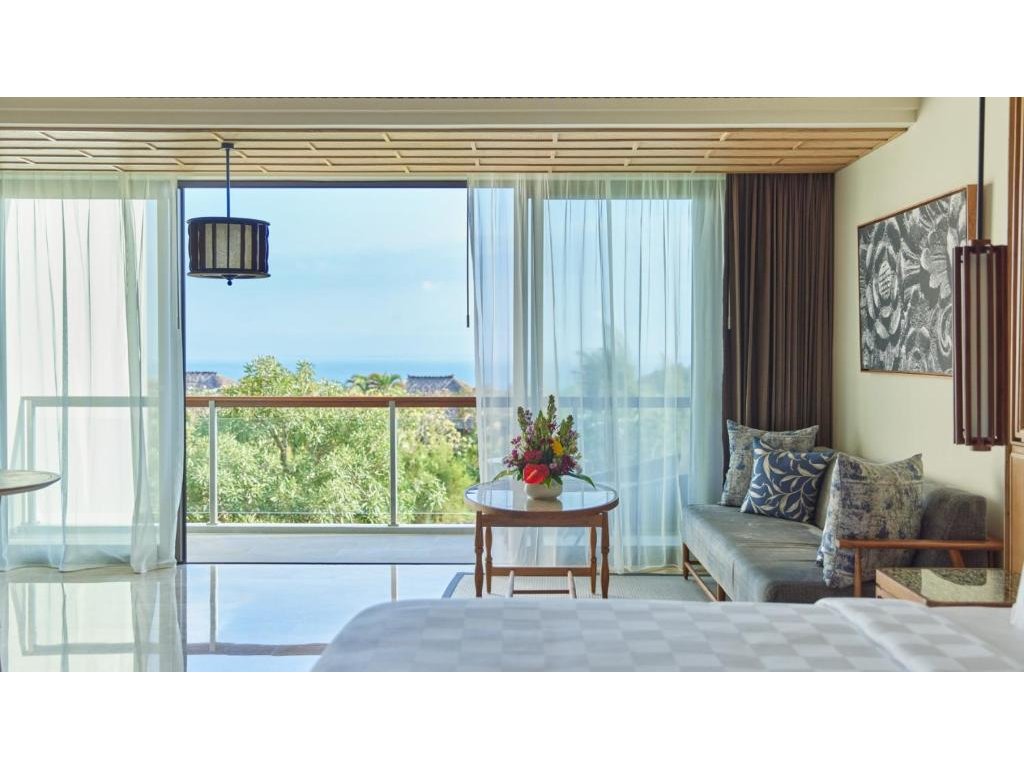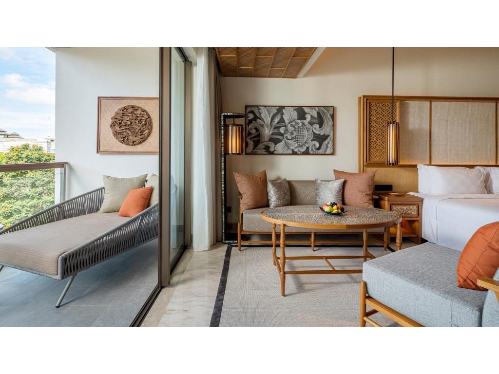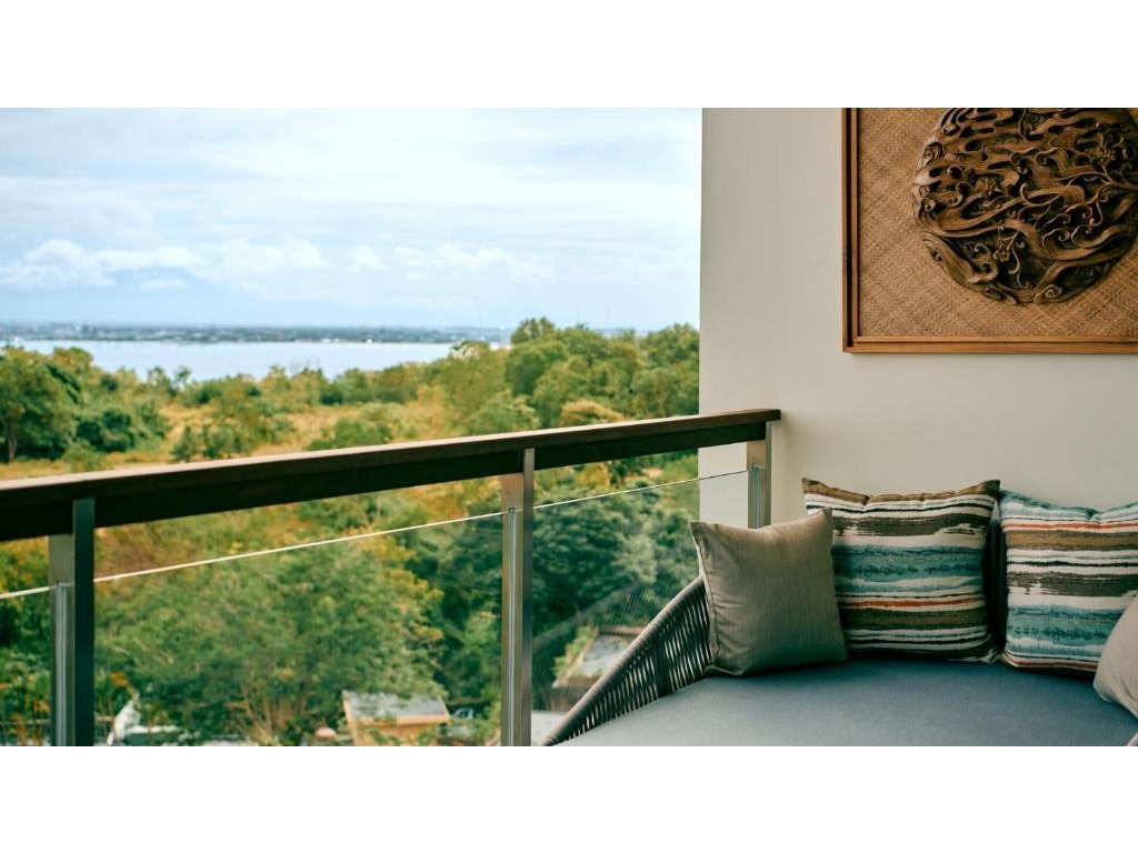 cca 58–65 m² | Pokoj orientovaný směrem k Jimbaran Bay. Vzdušný interiér, posezení, balkon/terasa na západy slunce.