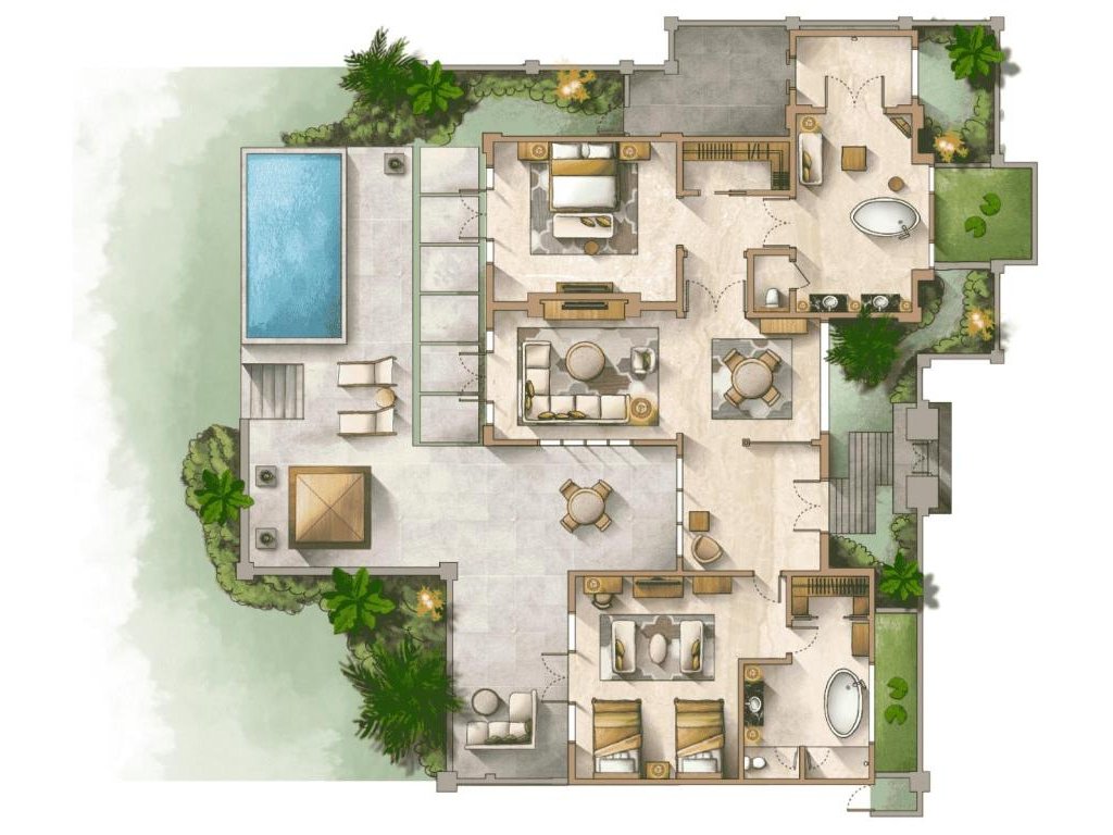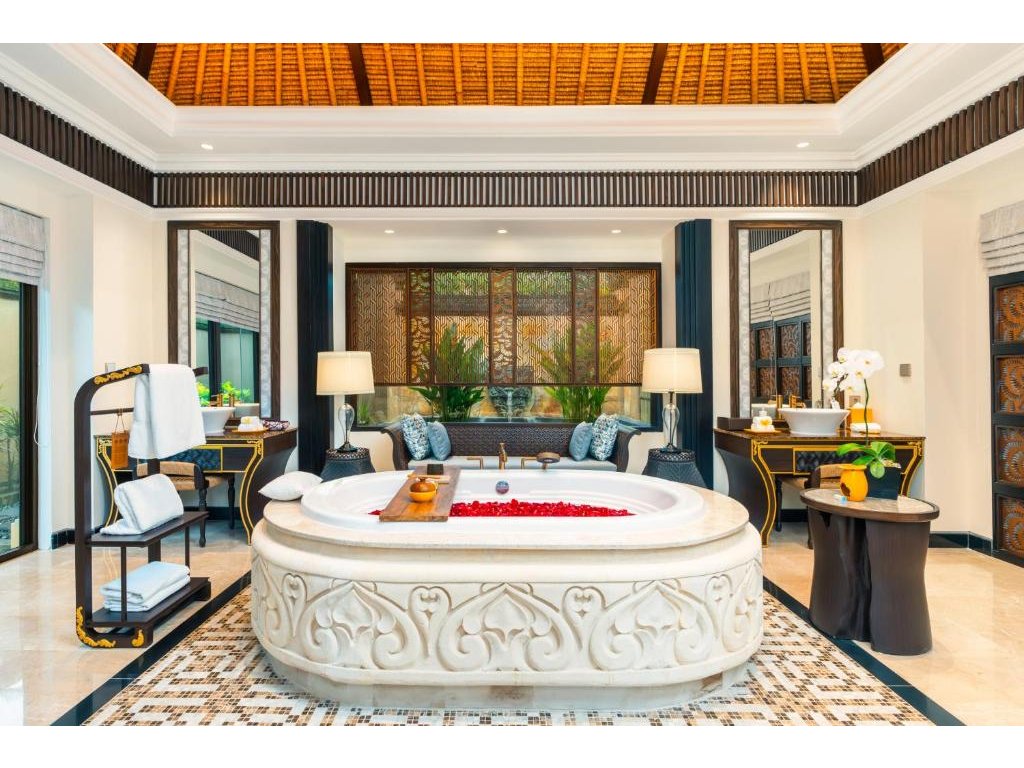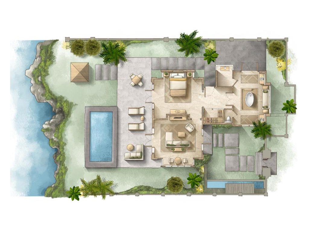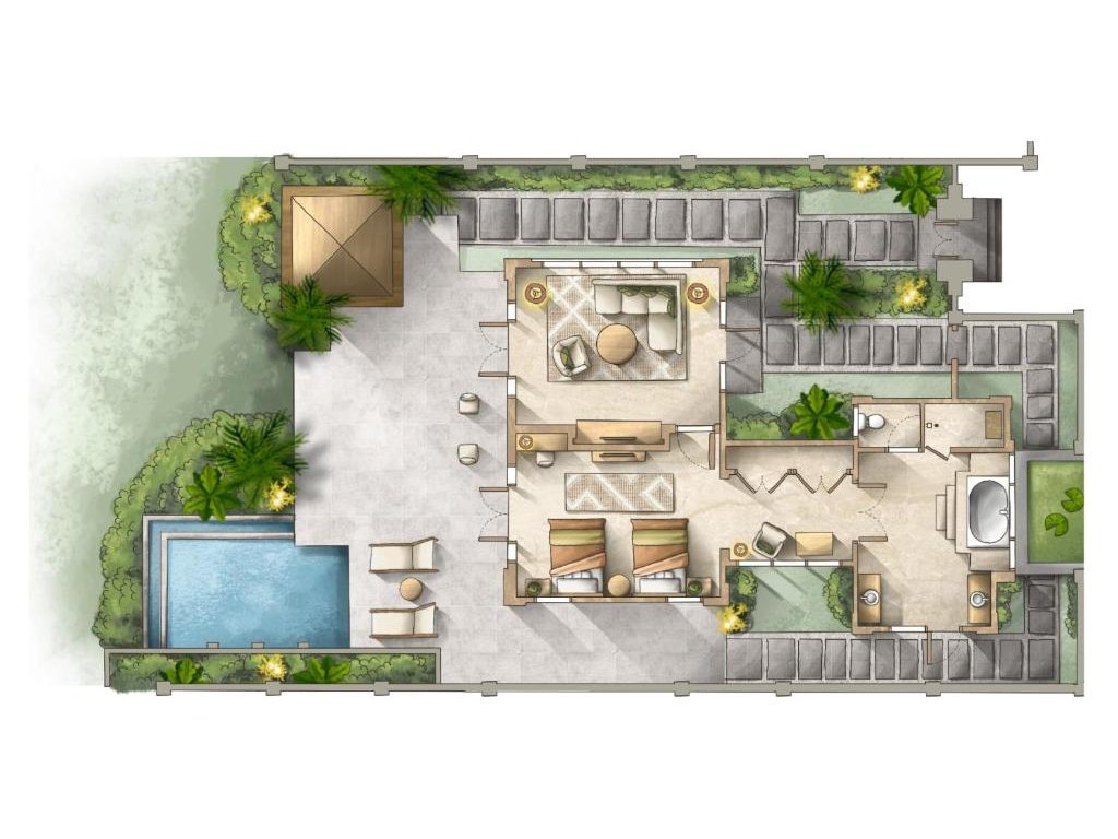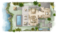 cca 298 m² | 1 ložnice s king bed, velkorysý obývací prostor, venkovní terasa a privátní bazén s výhledem do zahrady a na oceán. Koupelna s vanou/dešťovou sprchou, butler servis, in-villa dining.