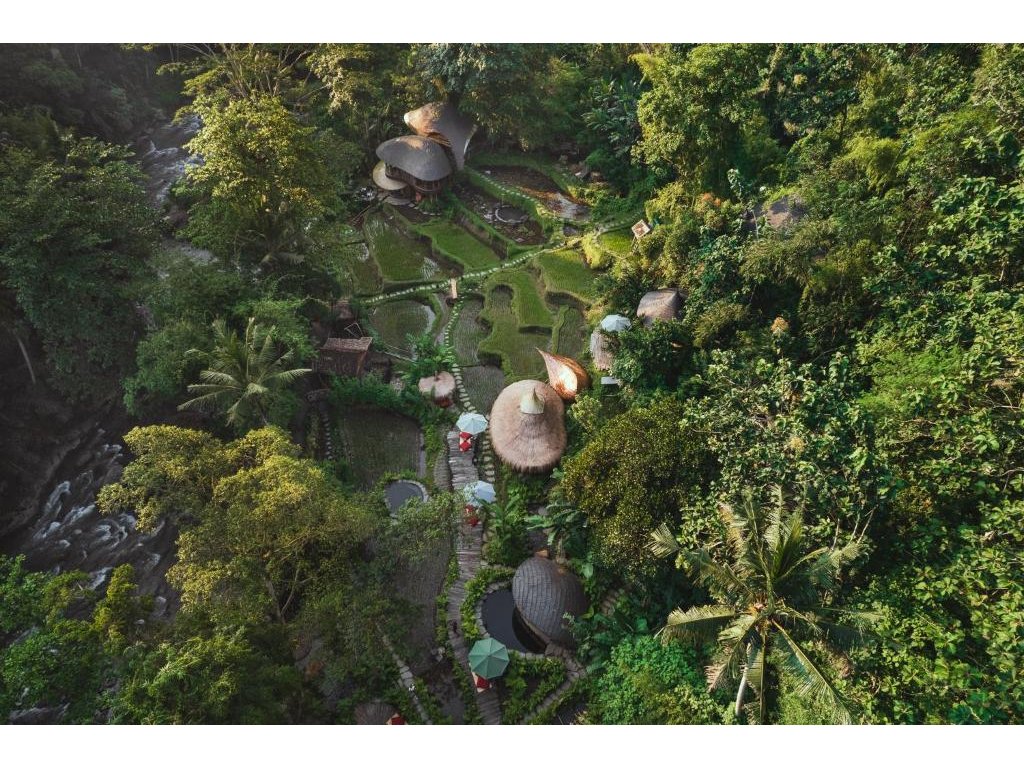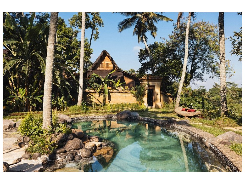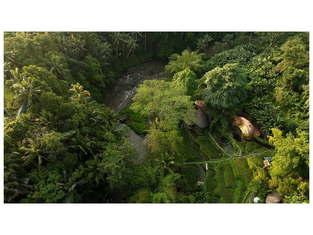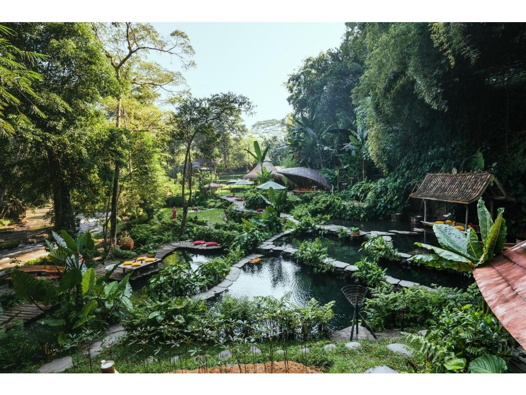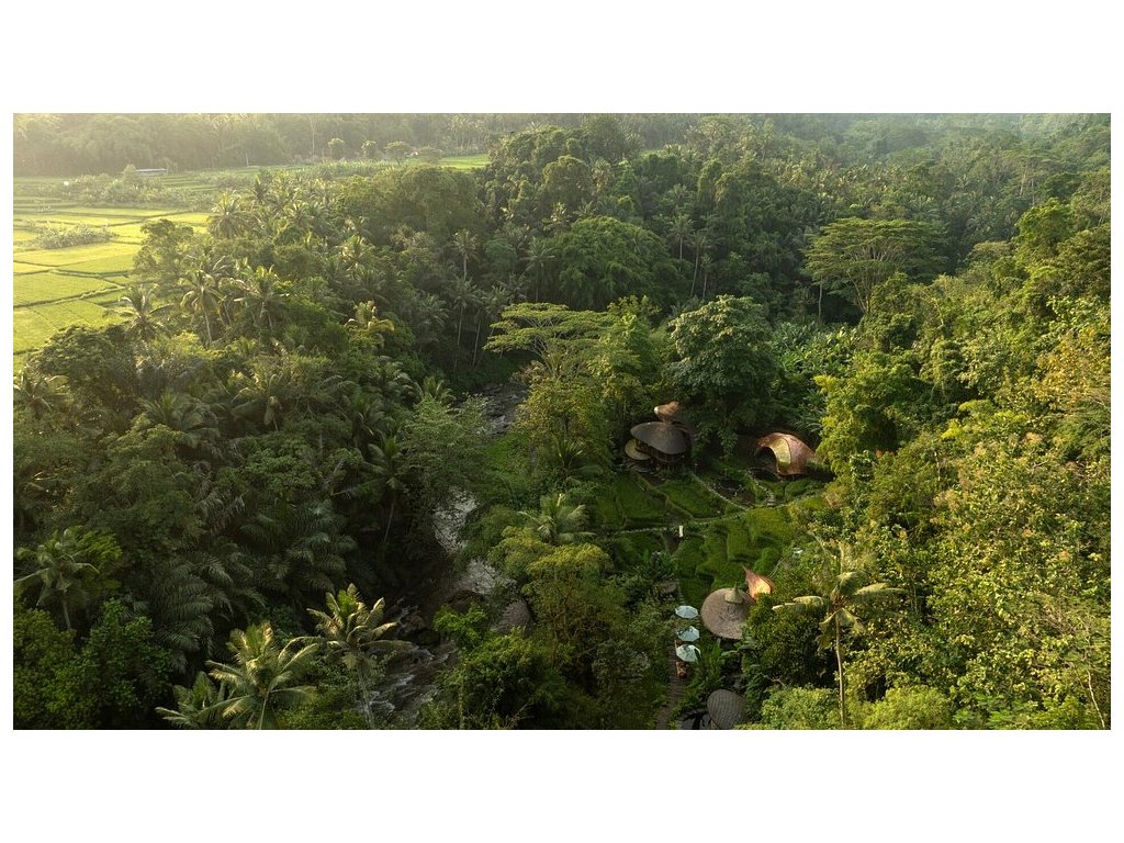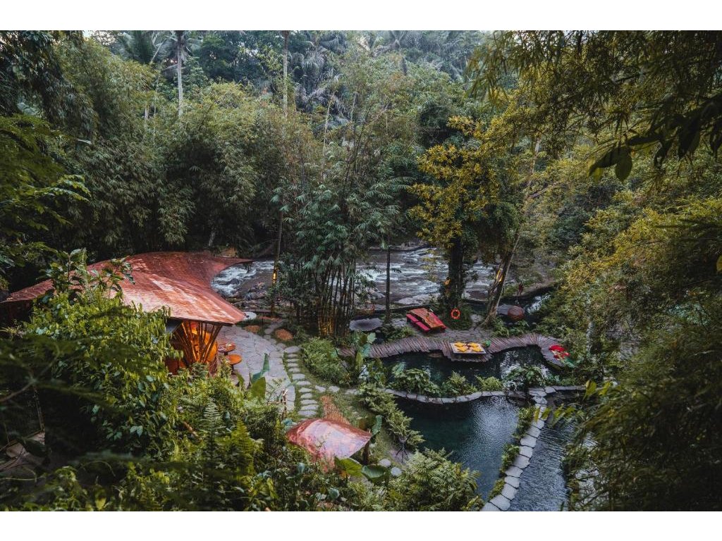 Eco-luxury boutique retreat na svahu údolí řeky Ayung (Sayan / Ubud). Ikonické teakové a bambusové domy citlivě zasazené do přírody, přírodní koupací jezírka bez chemie a důraz na udržitelnost, lokální řemeslo a klid. Ideální pro páry, milovníky designu a přírody i stylové „digital detox“ pobyty.