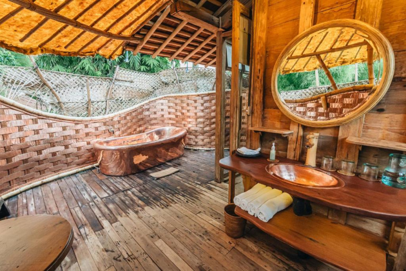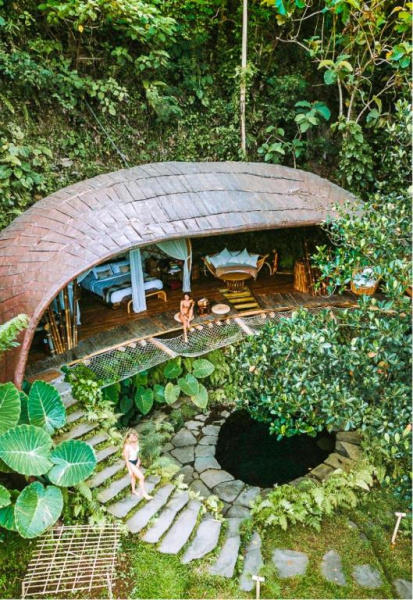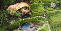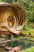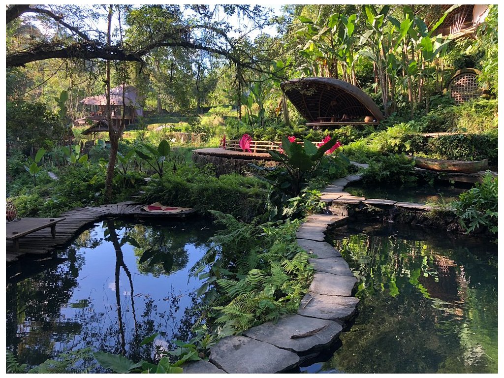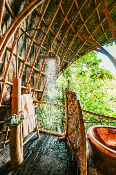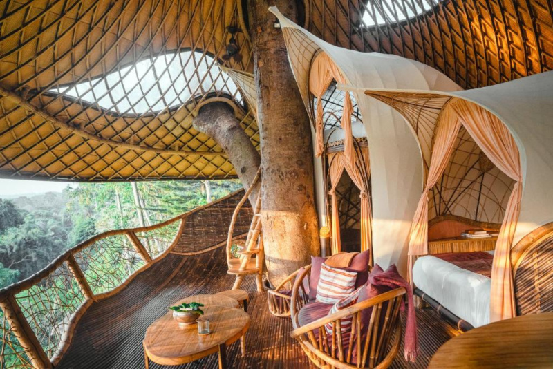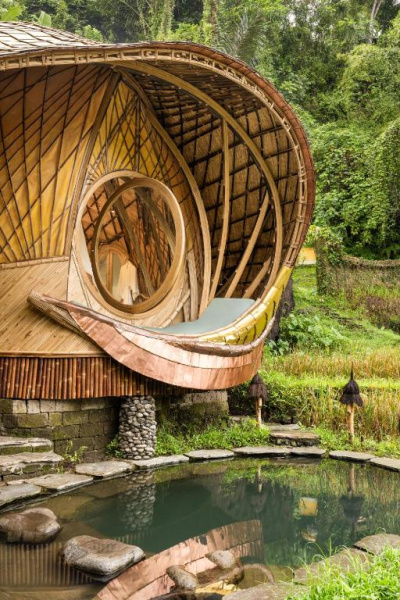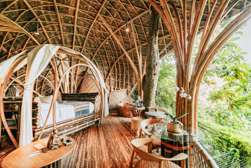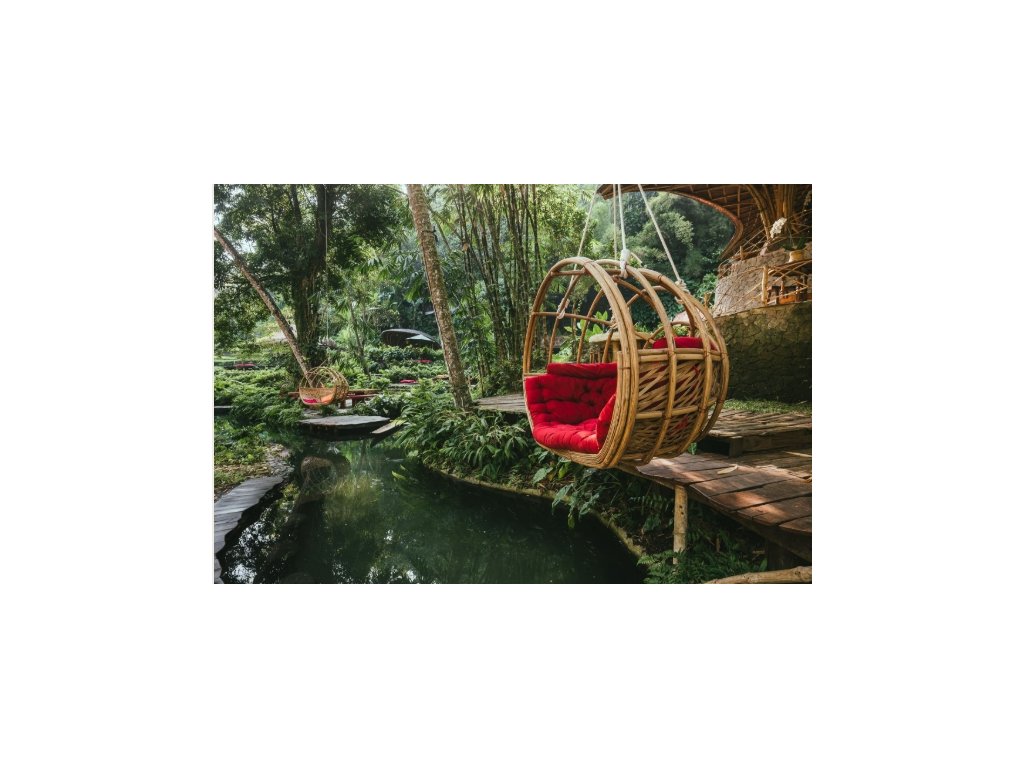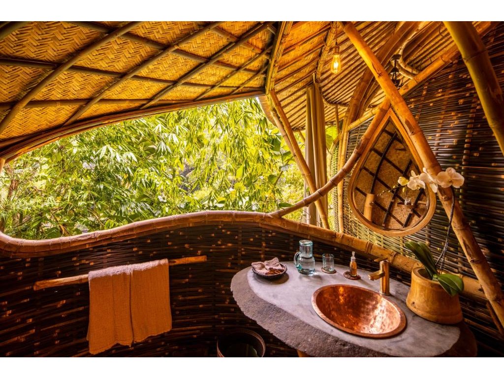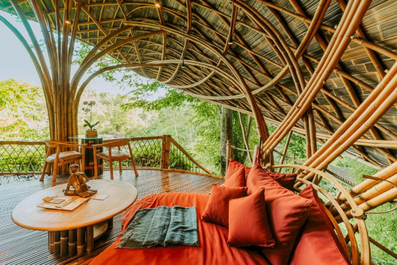 Eco-luxury boutique retreat na svahu údolí řeky Ayung (Sayan / Ubud). Ikonické teakové a bambusové domy citlivě zasazené do přírody, přírodní koupací jezírka bez chemie a důraz na udržitelnost, lokální řemeslo a klid. Ideální pro páry, milovníky designu a přírody i stylové „digital detox“ pobyty.