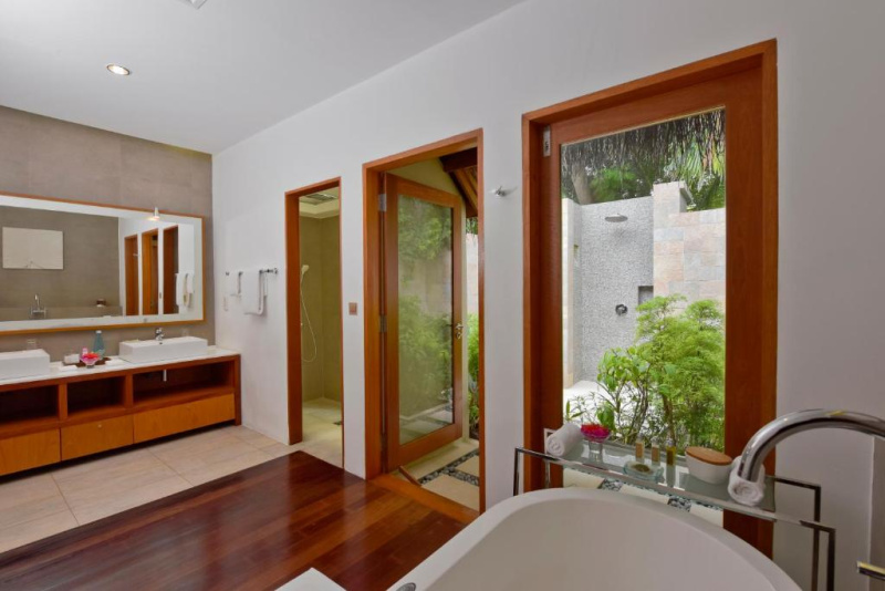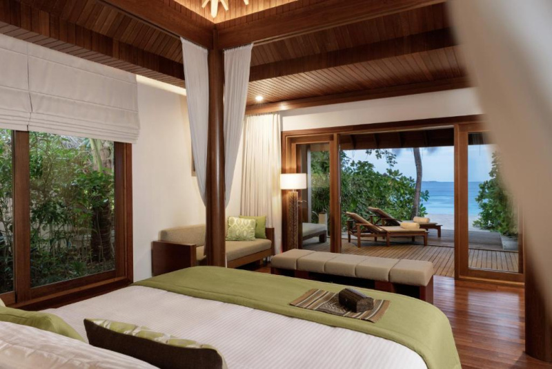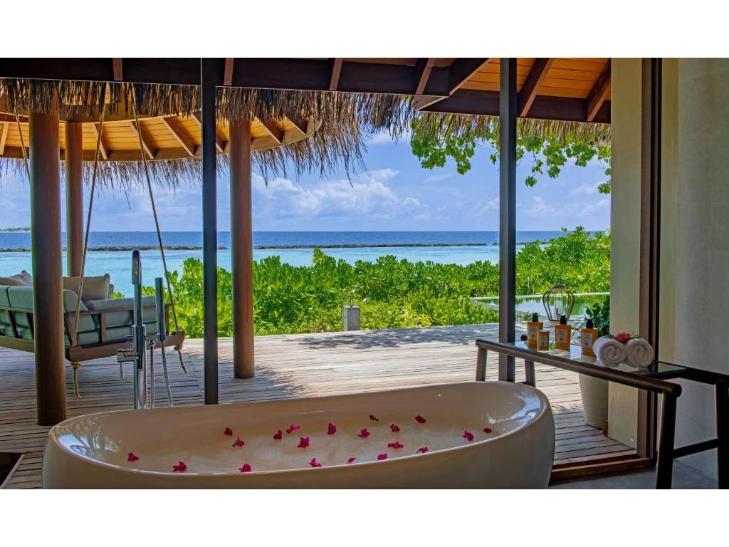103 m², prostornější než Deluxe Beach Villa, s luxusní koupelnou, lehátky a stylovou ložnicí.