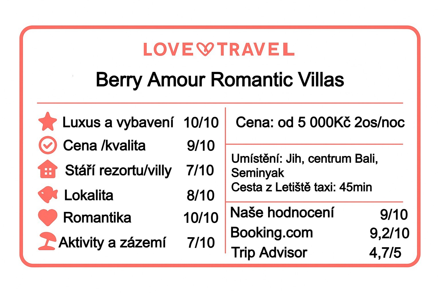 - Kritika: občas rušnější okolí Seminyaku; v tropech je nutný repelent (komáři); některým může chybět velké resortové zázemí.