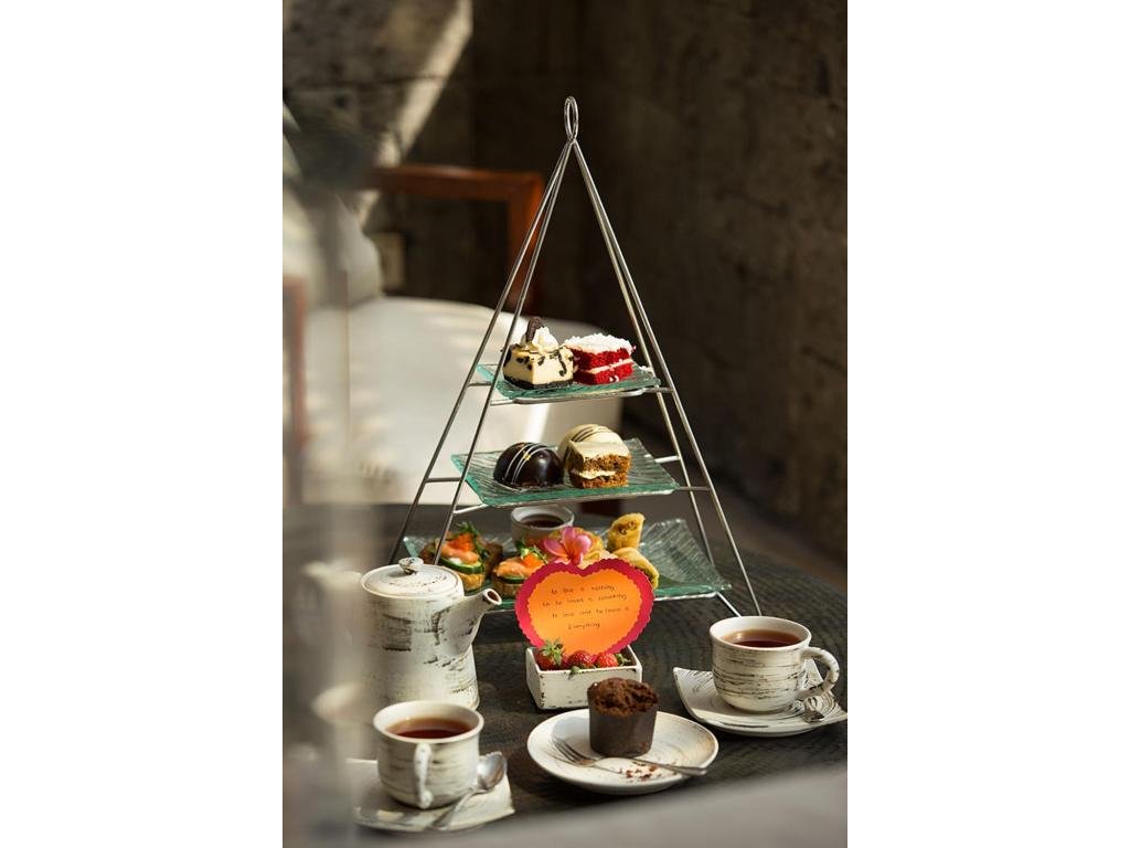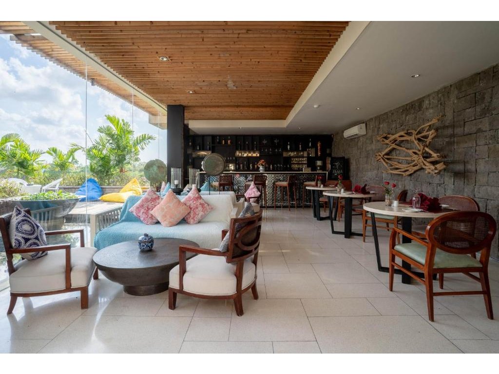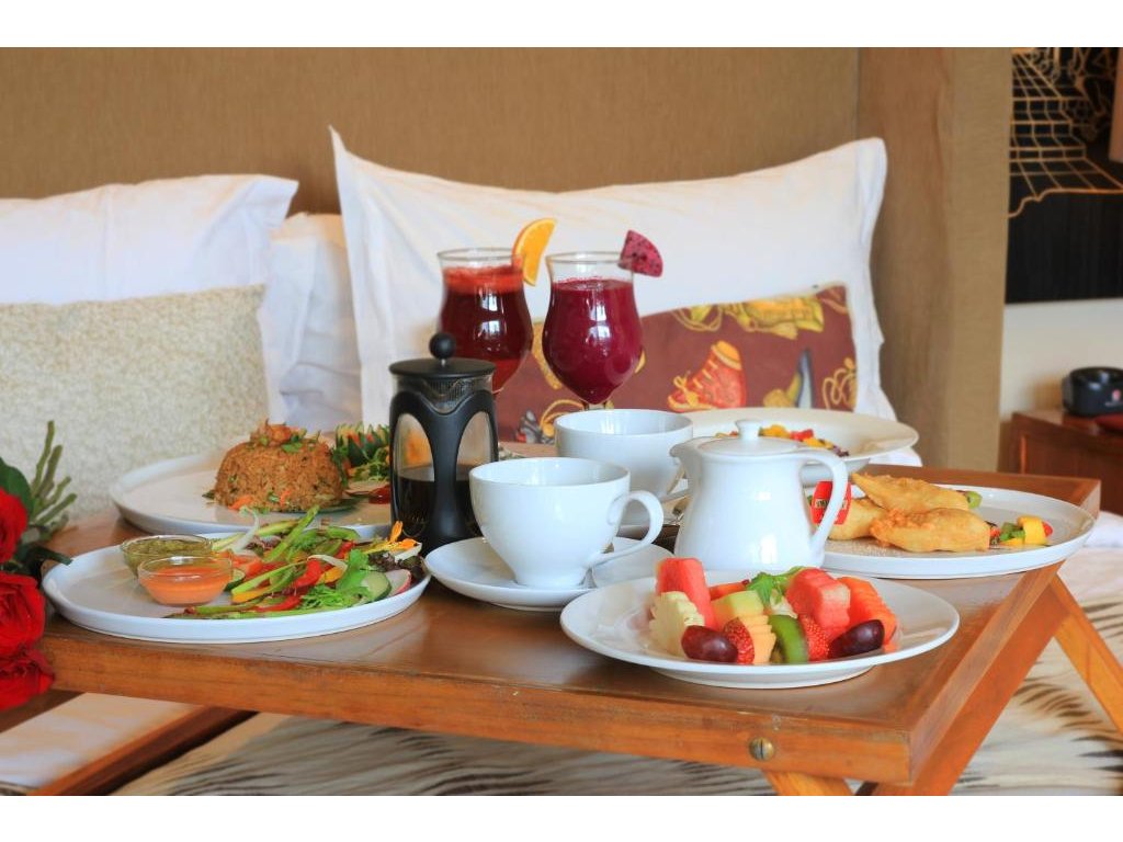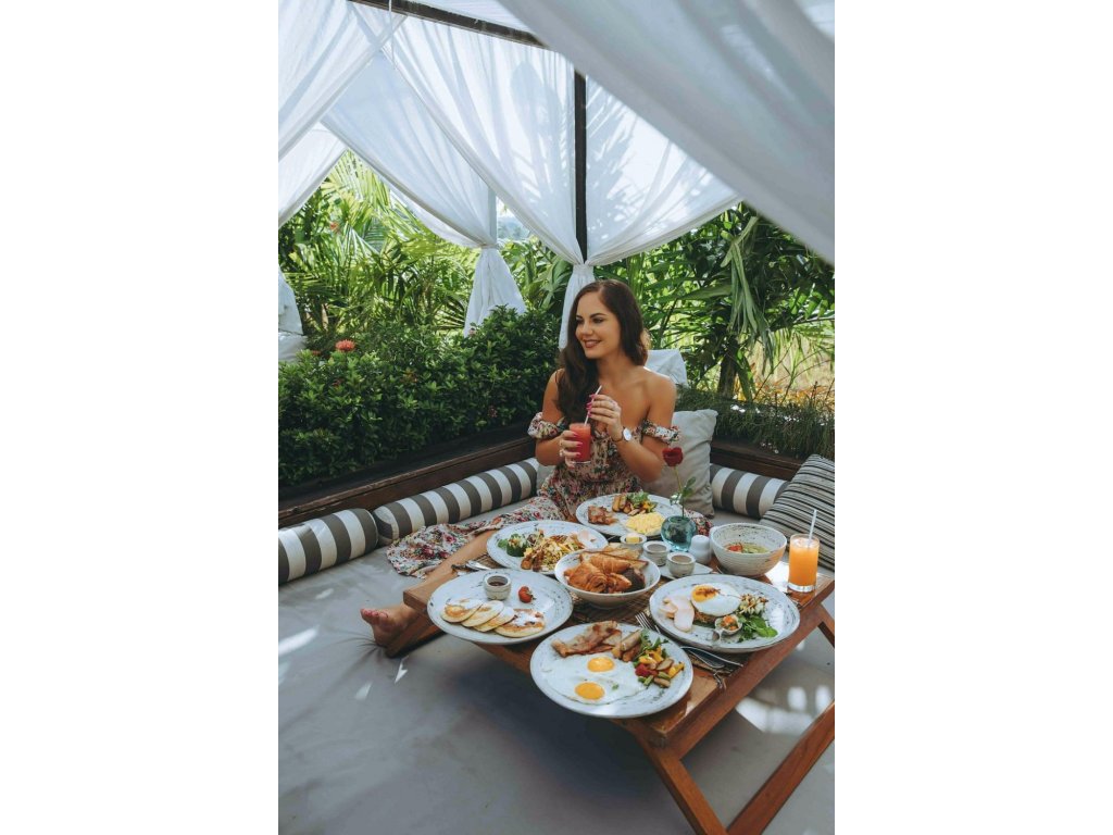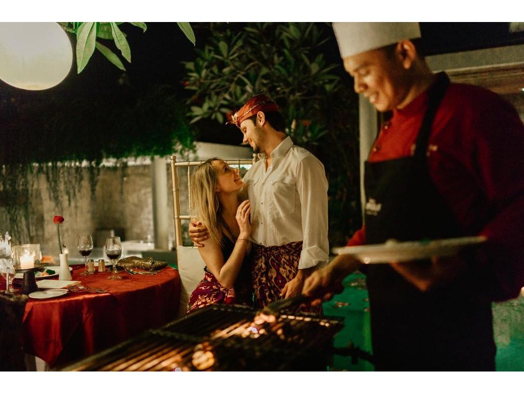 Snídaně servírovaná přímo do vily (možný floating tray), jednoduché in-villa menu přes den/večer. V okolí bohatá nabídka kaváren a restaurací (indonéské i mezinárodní kuchyně).