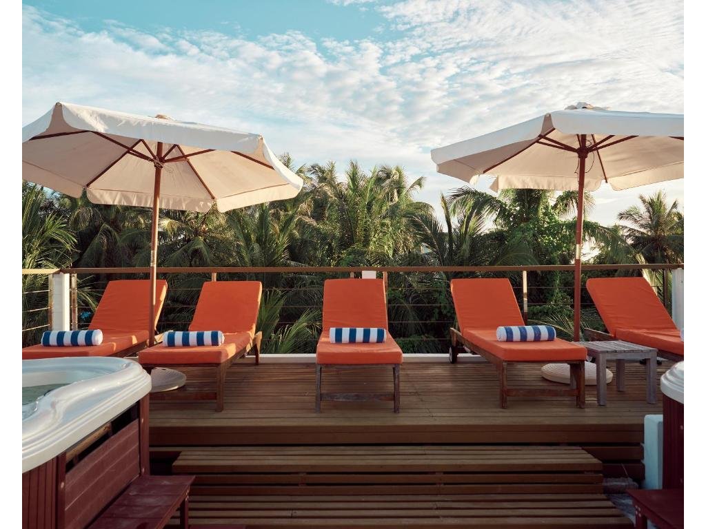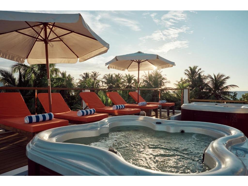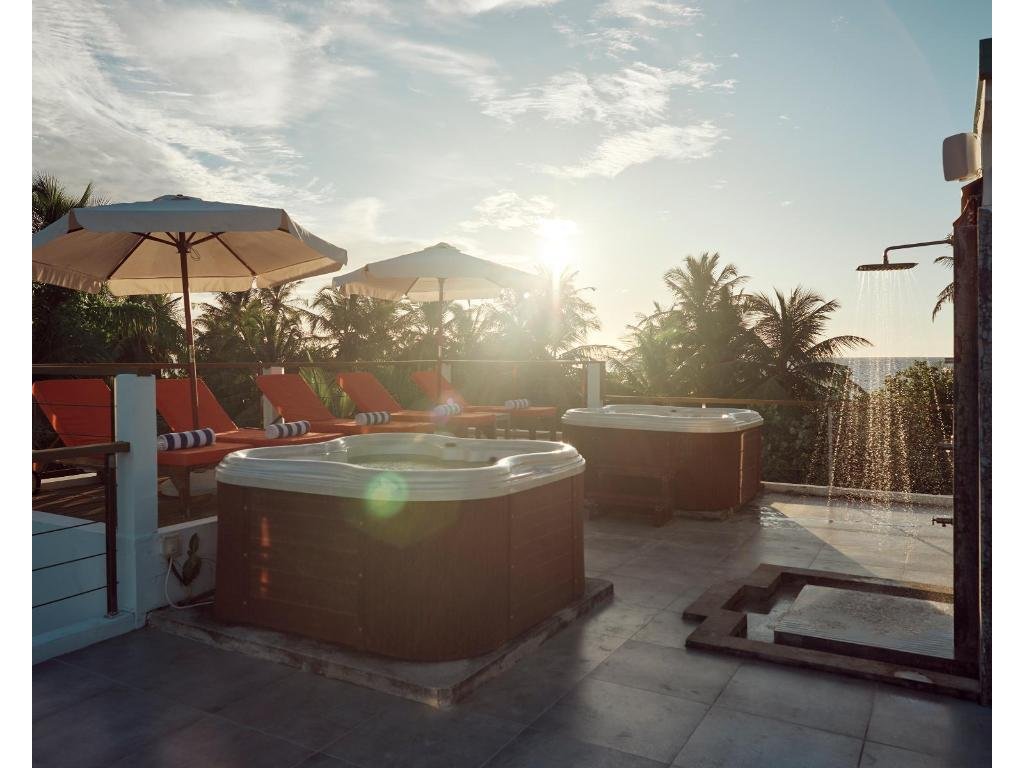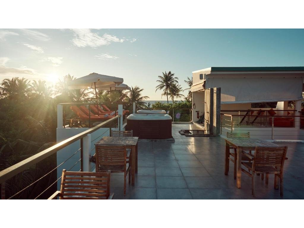 Střešní rooftop terasa s vířivkami a juice barem, sluneční lehátka, půjčovna kol, výlety (šnorchl, žraloci obrovští), pohodlné pokoje s klimatizací a moderní koupelnou; dostupné i rodinné varianty. (Zázemí rooftopu & Hermit's: snídaně pod palmami, rooftop bar, vířivky.)