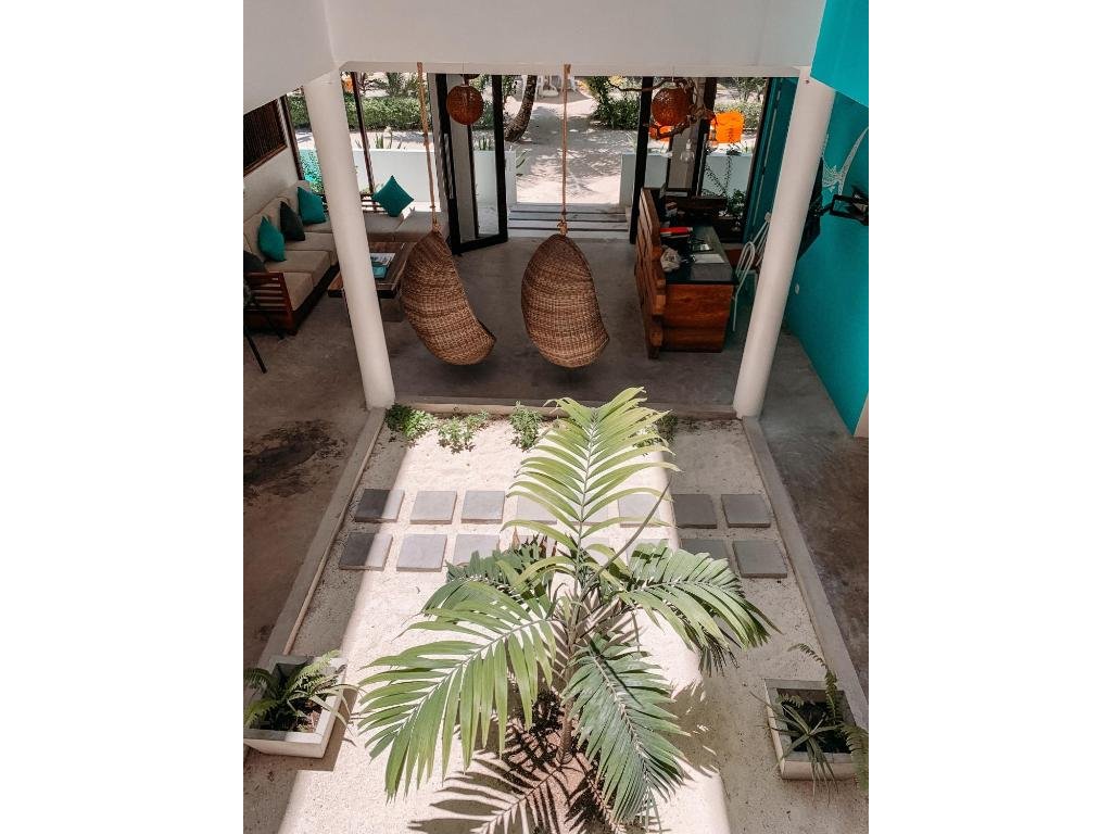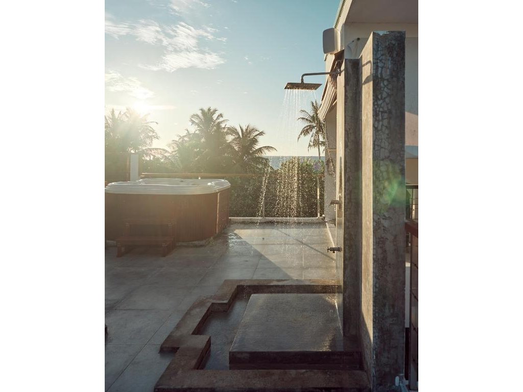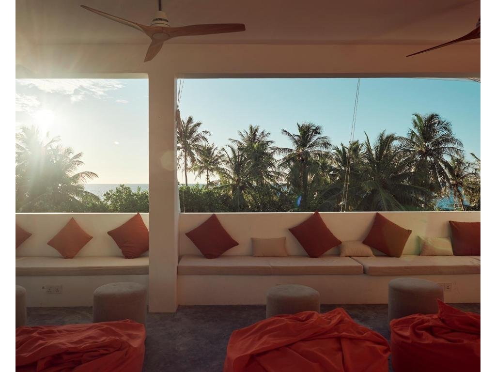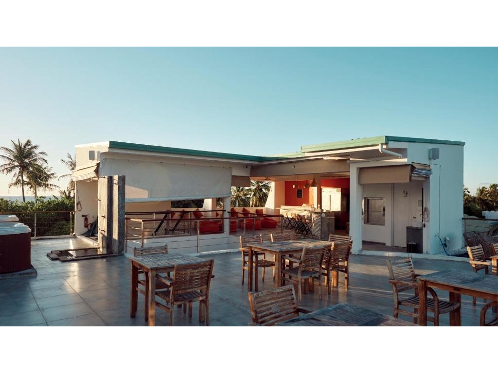 Střešní rooftop terasa s vířivkami a juice barem, sluneční lehátka, půjčovna kol, výlety (šnorchl, žraloci obrovští), pohodlné pokoje s klimatizací a moderní koupelnou; dostupné i rodinné varianty. (Zázemí rooftopu & Hermit's: snídaně pod palmami, rooftop bar, vířivky.)