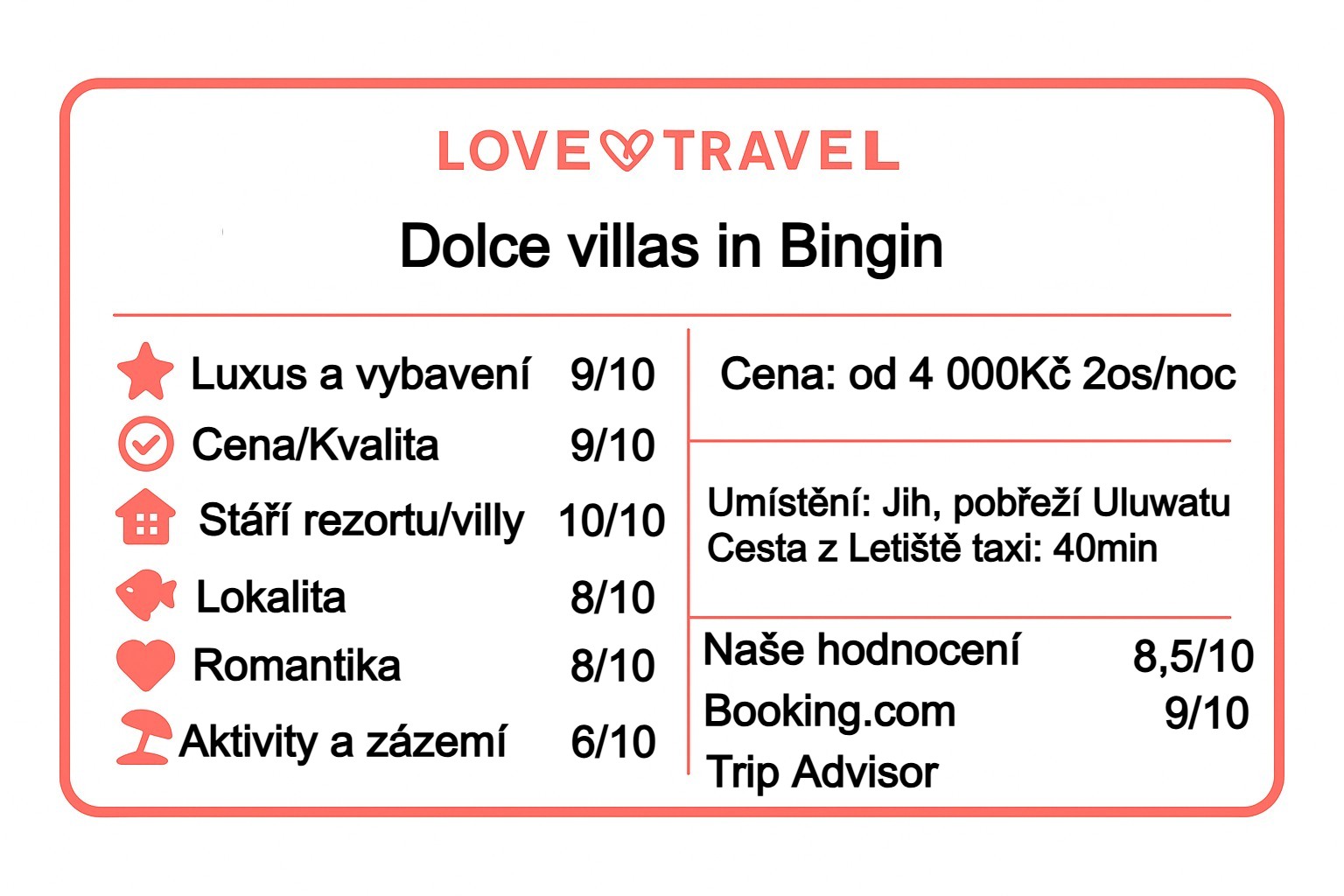 - Poměr cena/výkon: odpovídající privátním vilám v Bingin; nejvýhodnější ve vedlejší sezóně a při delších pobytech.