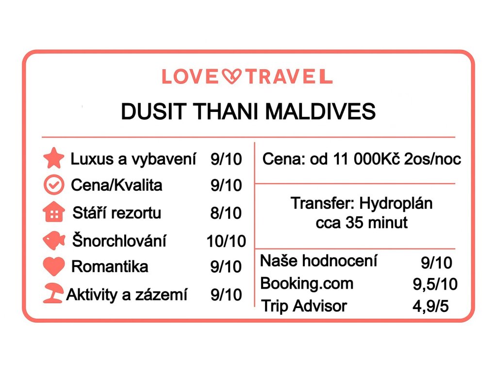 Dusit Thani je ideálním resortem pro ty, kdo chtějí kombinaci přírodní krásy, šnorchlování, vysokého komfortu a thajské elegance. Výborný poměr kvality a ceny v kategorii 5*, přístupný i pro rodiny, ale ideální hlavně pro páry a milovníky podmořského života.
