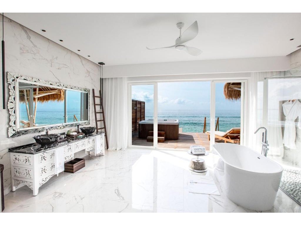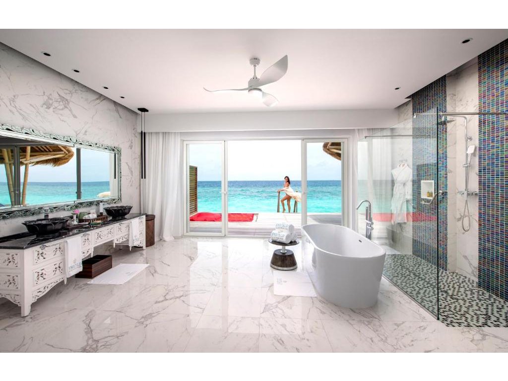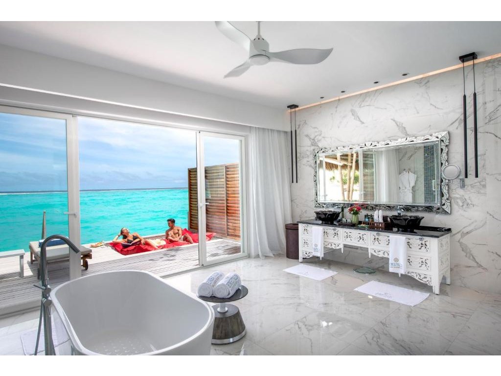 168 m², nadvodní ubytování s přímým vstupem do oceánu, výhled na východ slunce, terasa.