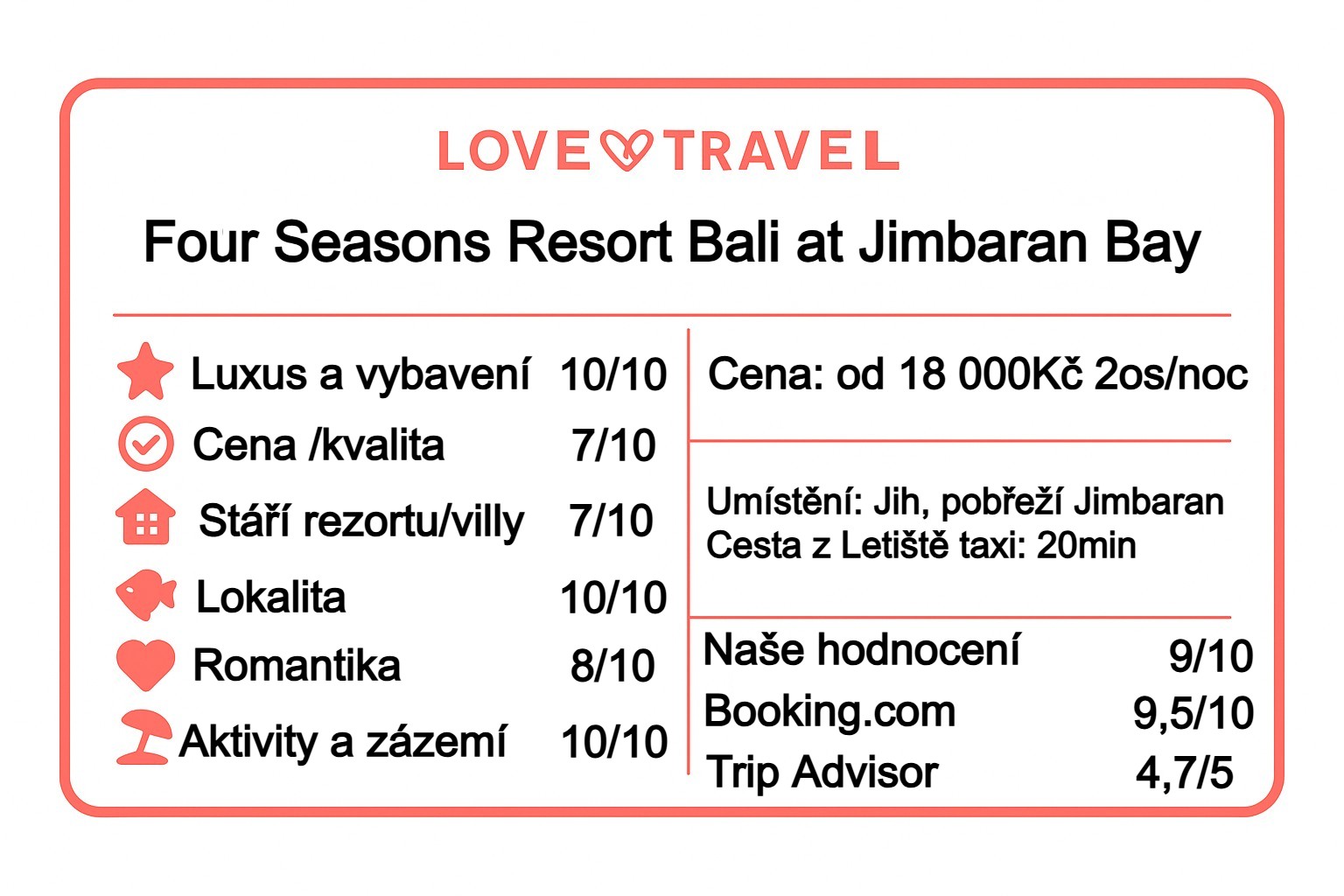 Poměr cena/výkon: velkorysé soukromé vily s bazénem, přímý přístup k pláži Jimbaran, špičková gastronomie a servis, široké zázemí aktivit pro dospělé i děti. Prémiová volba v kategorii world-class beachfront.