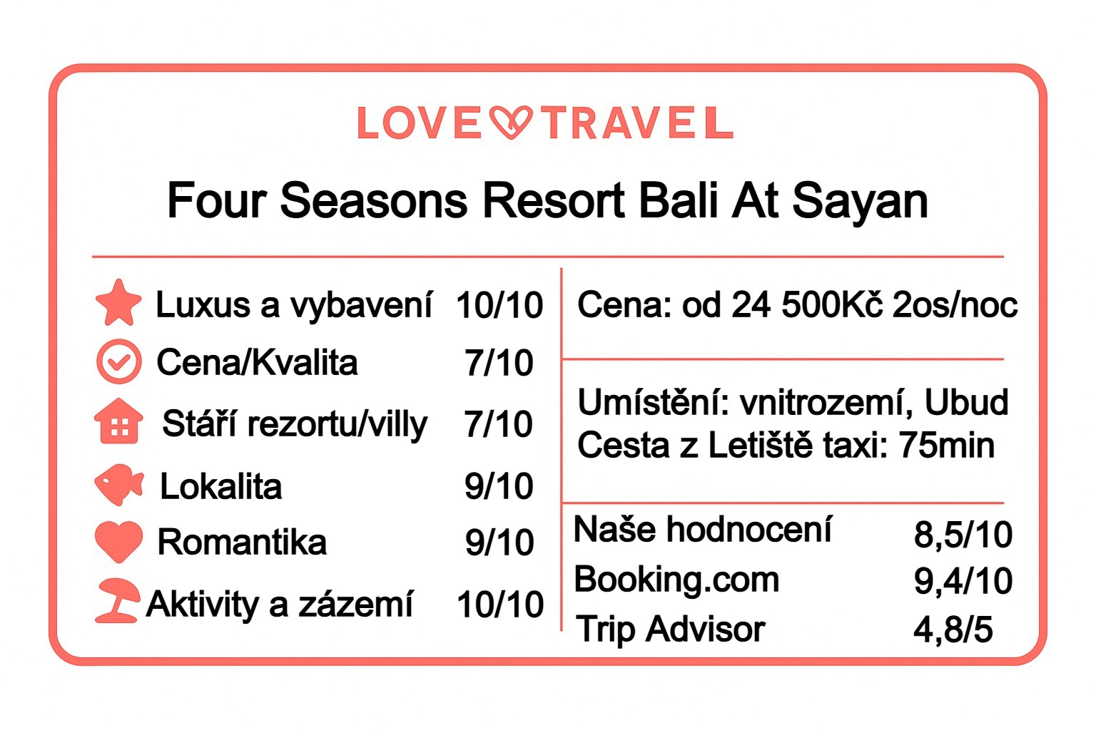 - Poměr cena/výkon: vysoká hodnota v soukromí vil s bazény, poloze nad řekou Ayung, špičkovém servisu a wellness programech.