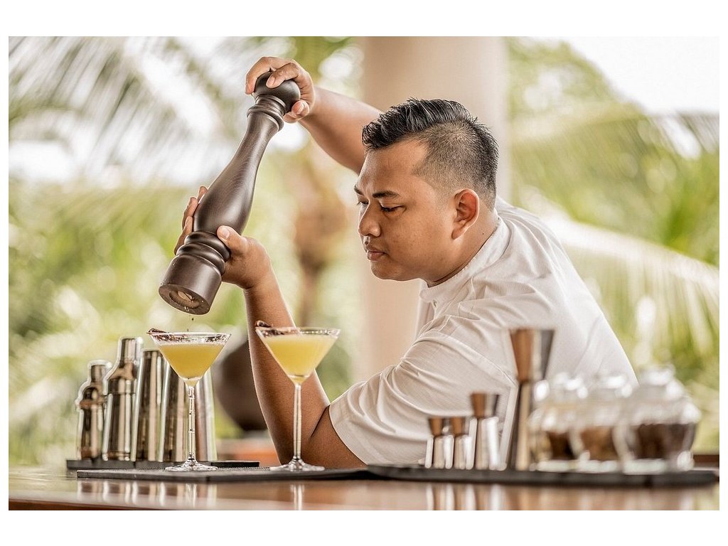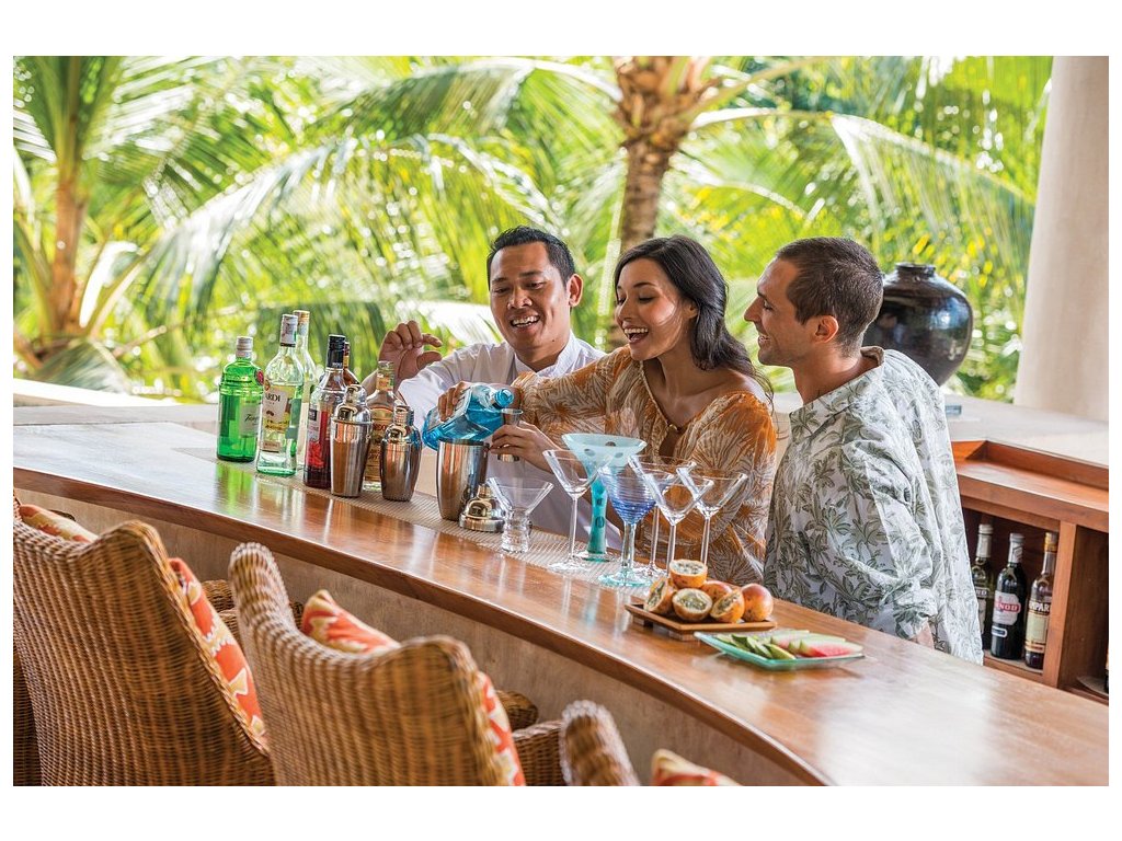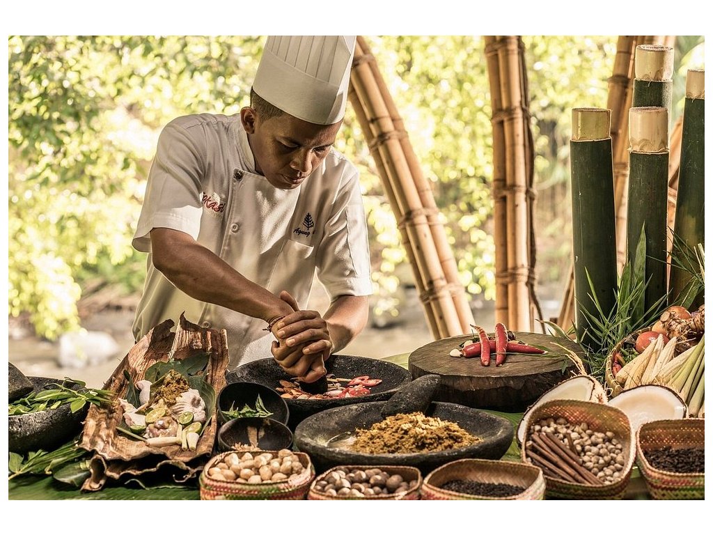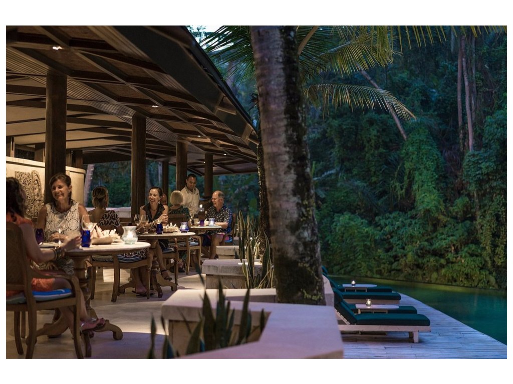 Ayung Terrace (indonéská a balijská kuchyně s výhledy), Riverside (u bazénu, středomořsky laděné all-day dining), Sokasi (Chef’s Table & Cooking Class) a Jati Bar (koktejly a lehké bite). Možná snídaně do vily.