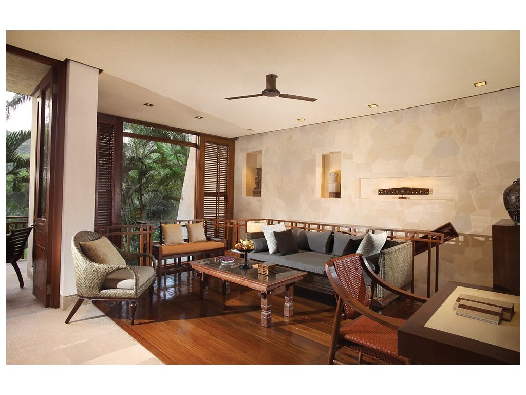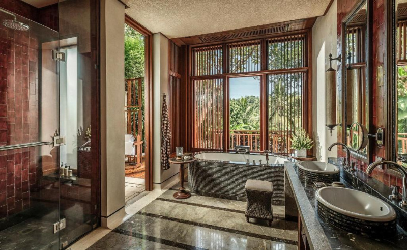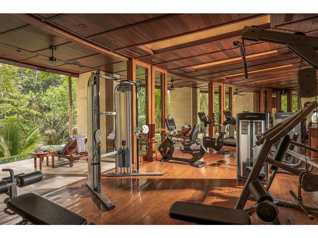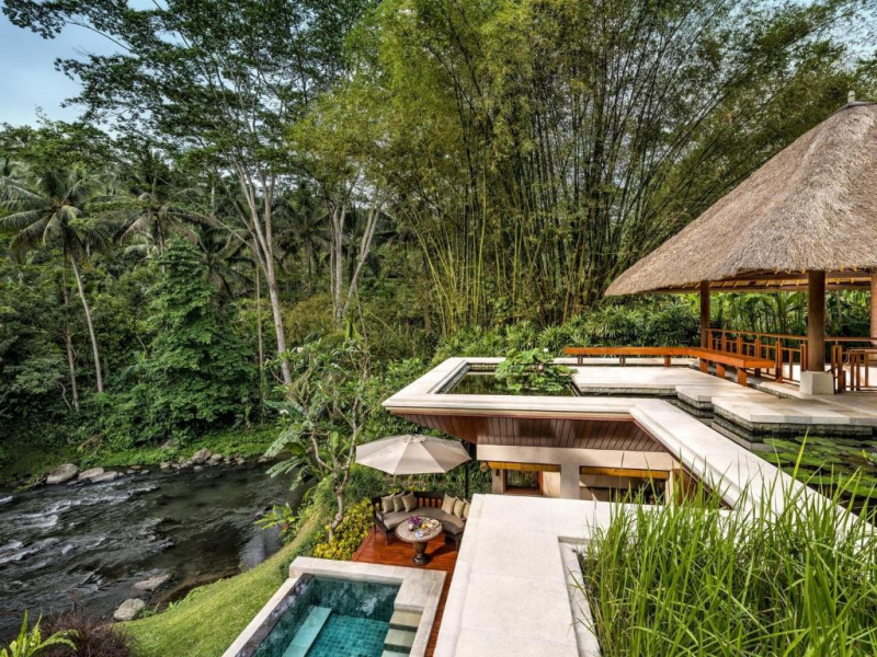 Vily se soukr. bazénem a terasami, rozlehlé zahrady, servis komorníků dle kategorie, tichý hlavní bazén, programy jógy a meditace. Sacred River Spa (balijské rituály, ajurvéda, holistické terapie), pavilony nad džunglí a u řeky.