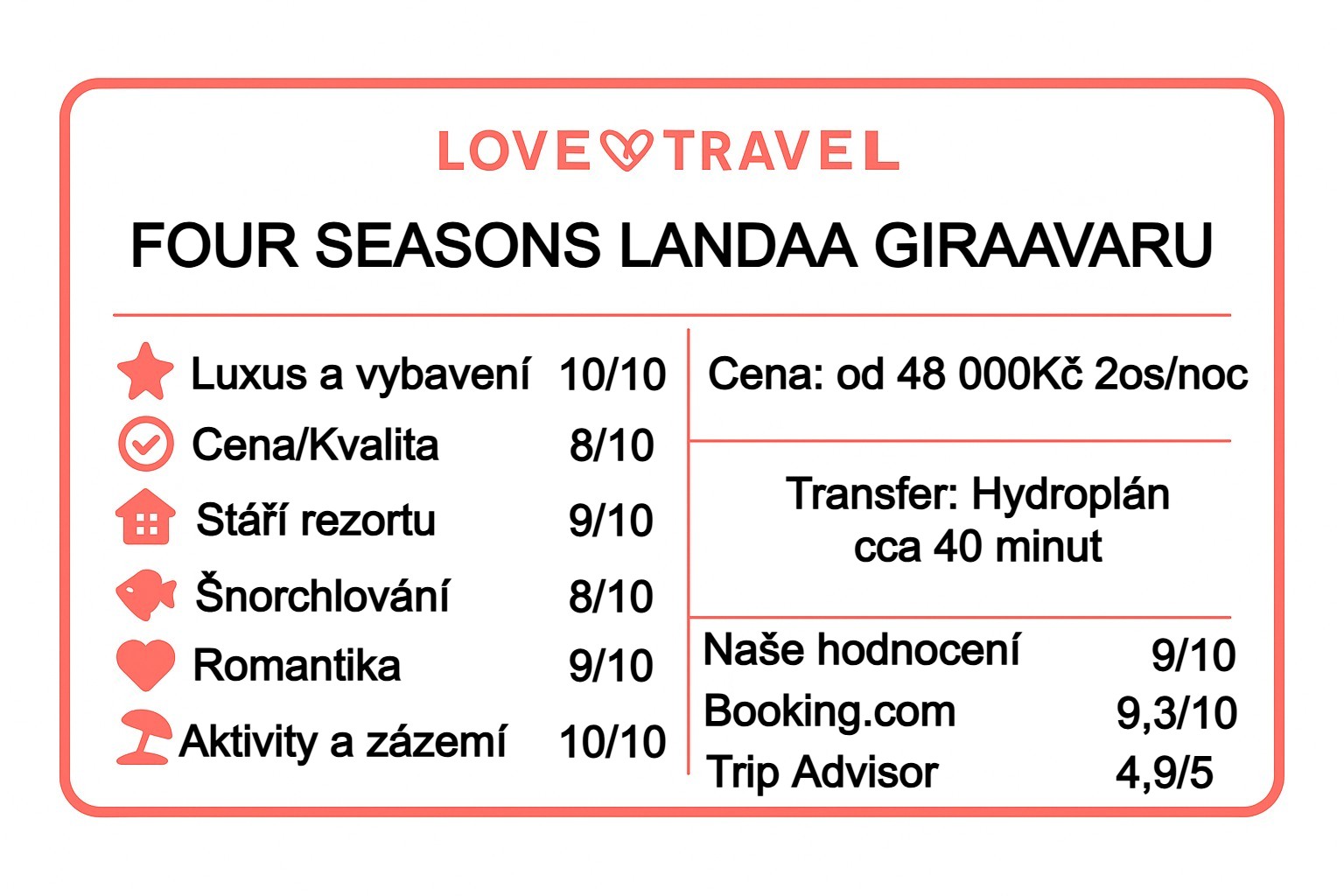 Four Seasons Landaa Giraavaru patří k absolutní špičce na Maledivách. Nabízí luxus bez okázalosti, špičkové zázemí, autentický servis a výjimečný kontakt s přírodou. Ideální pro náročné cestovatele, wellness nadšence, páry i rodiny. V porovnání s jinými luxusními resorty nabízí jeden z nejkomplexnějších zážitků vůbec.