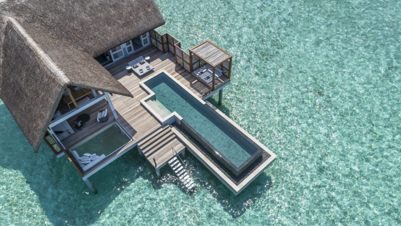 Nadvodní vila s částečným výhledem na oceán a bazénem. Moderní interiér, terasa nad vodou a přímý vstup do laguny.