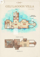 Cca 210 m², nadvodní vila s prostornou terasou, ložnicí, otevřeným obývacím prostorem a střešní terasou. Přímý vstup do laguny, venkovní koupelna a služby osobního komorníka. Ideální pro páry hledající soukromí a komfort.