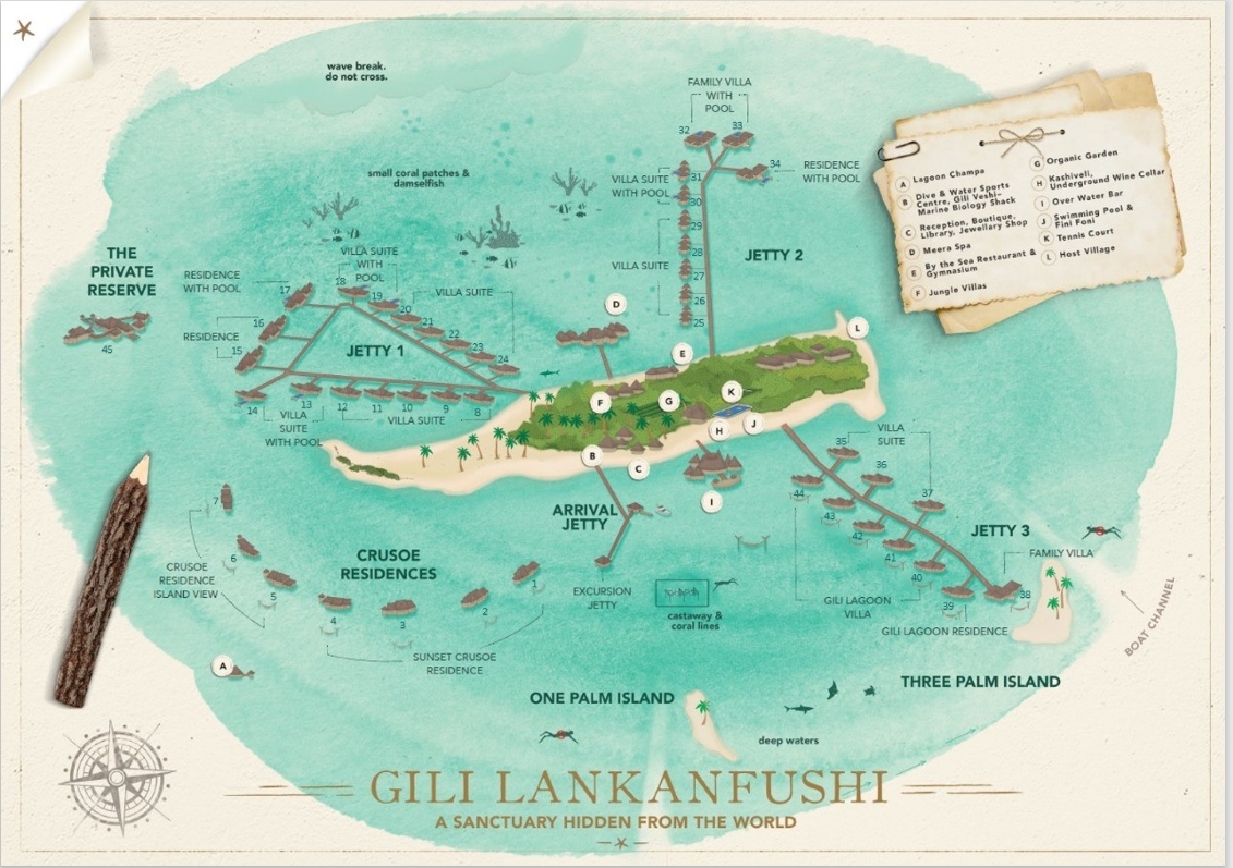 Celý resort funguje v duchu filozofie „No shoes – no news“ — hosté se pohybují bosí a v atmosféře naprostého uvolnění. Všechny vily jsou navrženy s důrazem na soukromí a propojení s přírodou, přičemž žádná z nich není vystavena přímému pohledu jiných hostů. Některé z vil stojí zcela samostatně na laguně a nabízejí maximální klid a exkluzivitu.