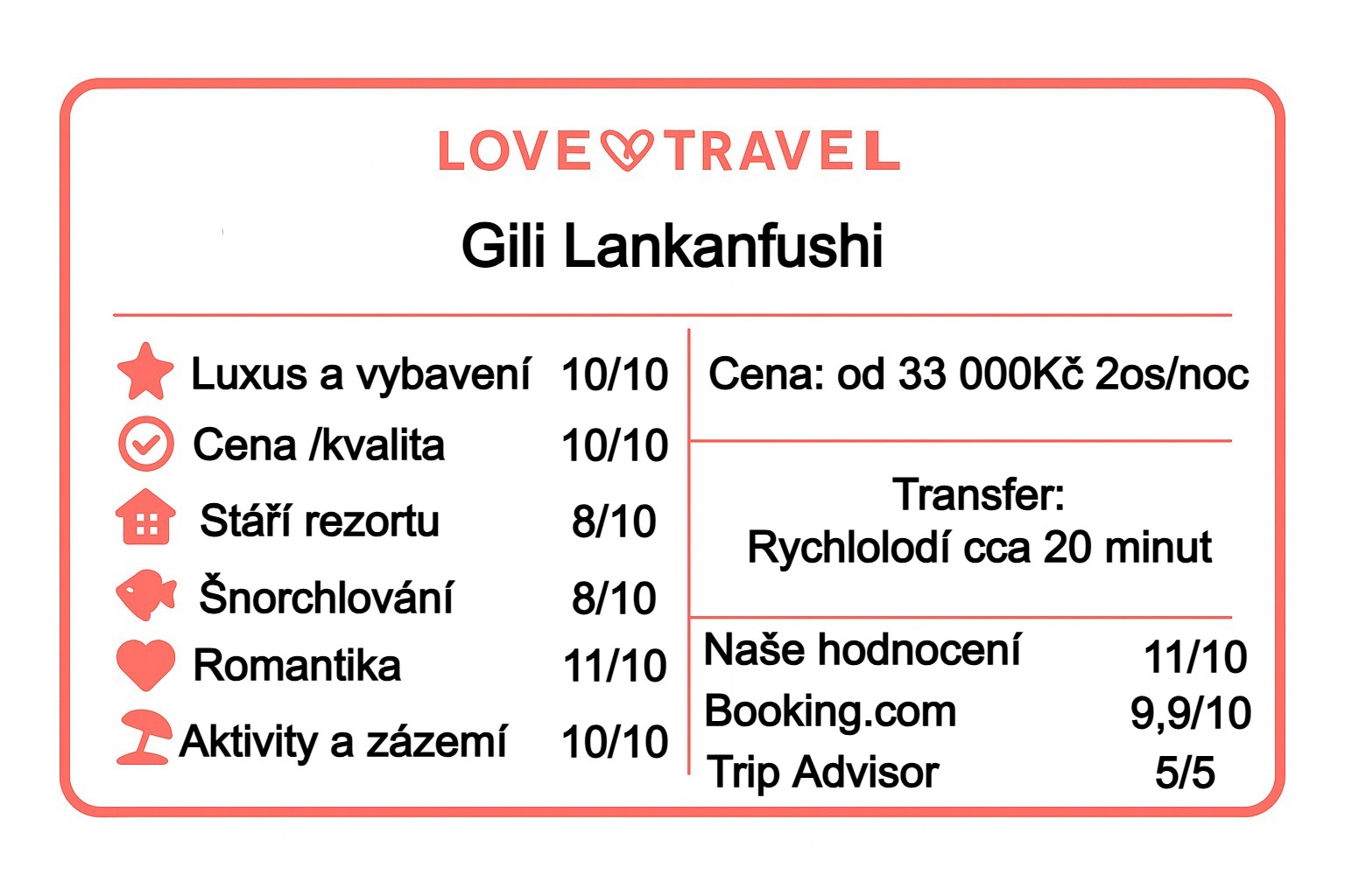 Celkově Gili Lankanfushi představuje butikový eco-luxus v pravém slova smyslu — jedinečný, přirozený a zaměřený na zážitek hosta. Bez zbytečné extravagance, ale s naprostou precizností ve všem, co dělá.