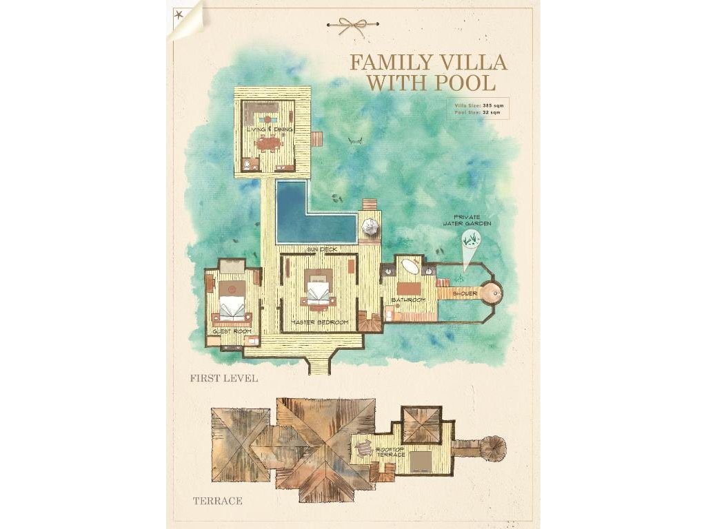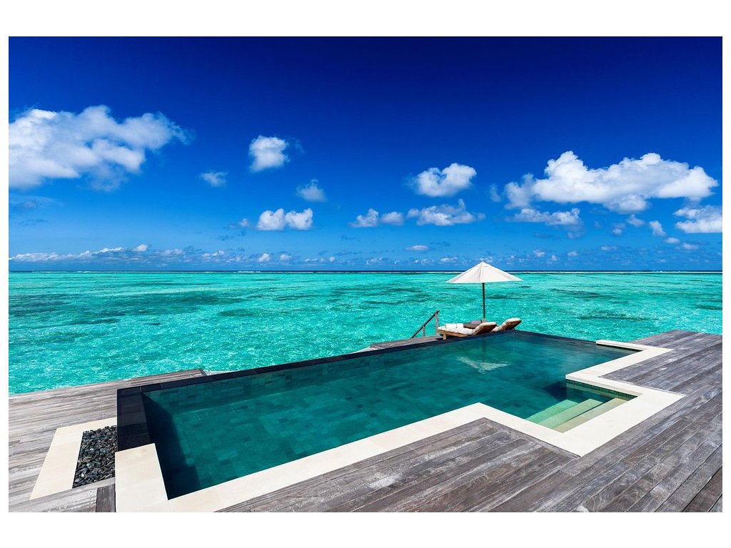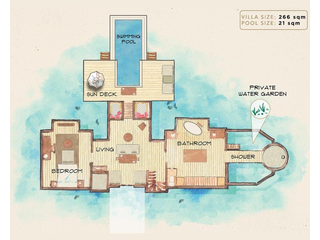 Cca 264 m², nadvodní vila s privátním sladkovodním bazénem na terase, prostorným obývacím prostorem, ložnicí, střešní terasou a venkovní koupelnou. Přímý vstup do laguny, maximální soukromí a služby osobního komorníka. Ideální pro páry hledající luxusní komfort a vlastní bazén nad mořem.