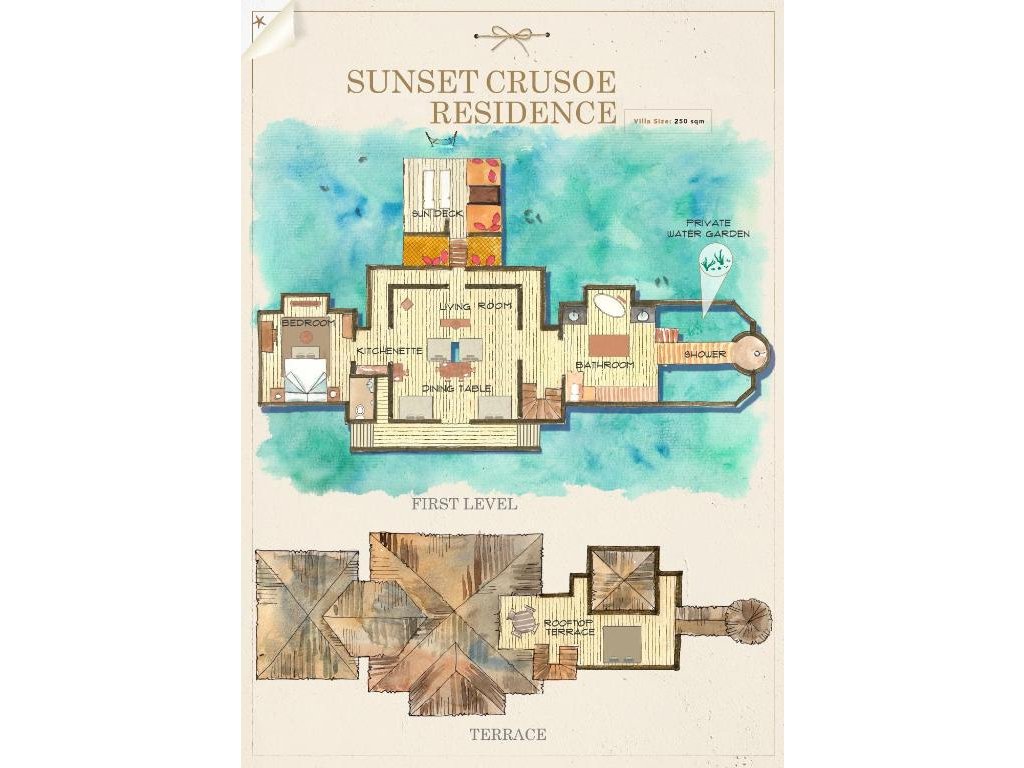 Cca 250 m², samostatně stojící nadvodní vila přístupná pouze lodí. Velká terasa, ložnice, obývací prostor, střešní terasa a venkovní koupelna. Přímý vstup do laguny, maximální soukromí a služby osobního komorníka. Ideální pro hosty hledající absolutní klid a exkluzivitu.