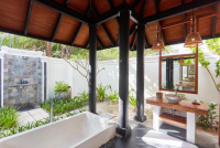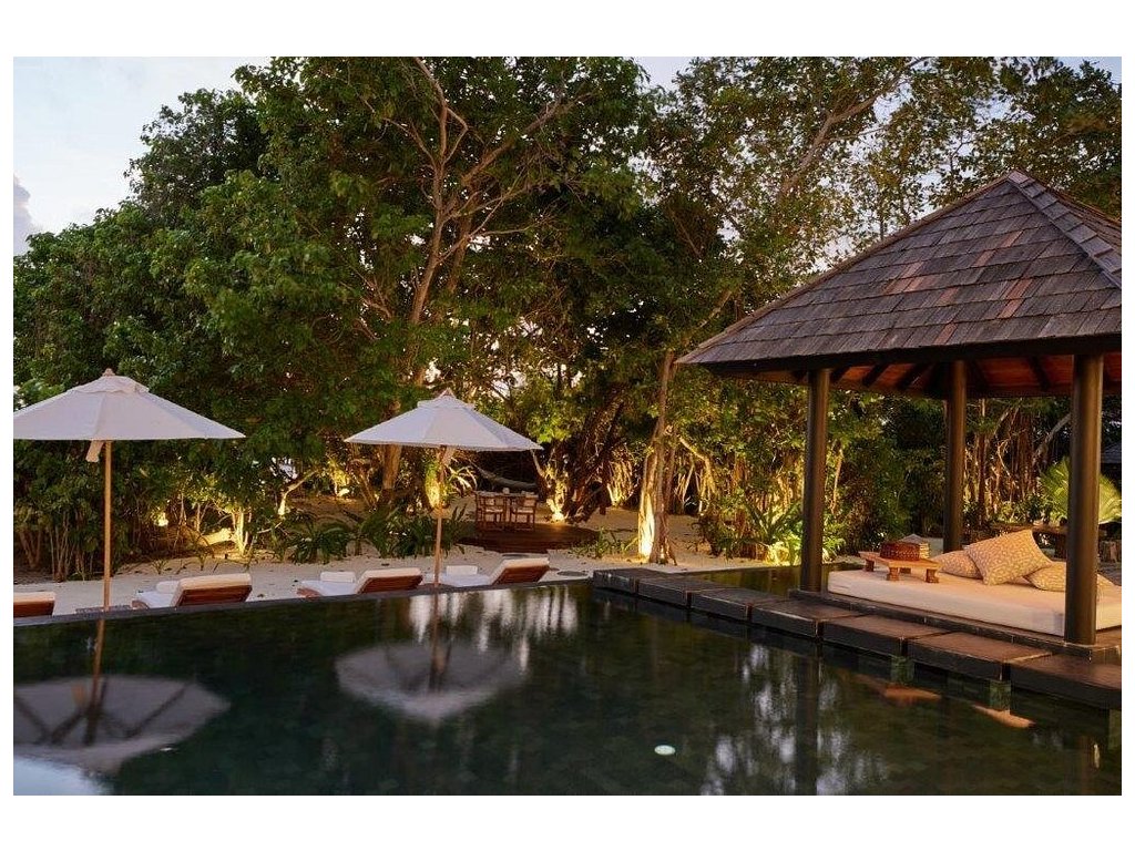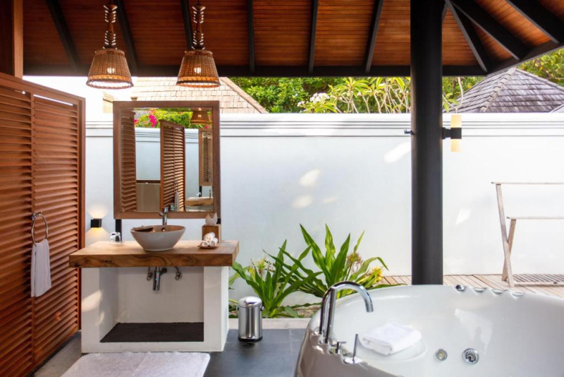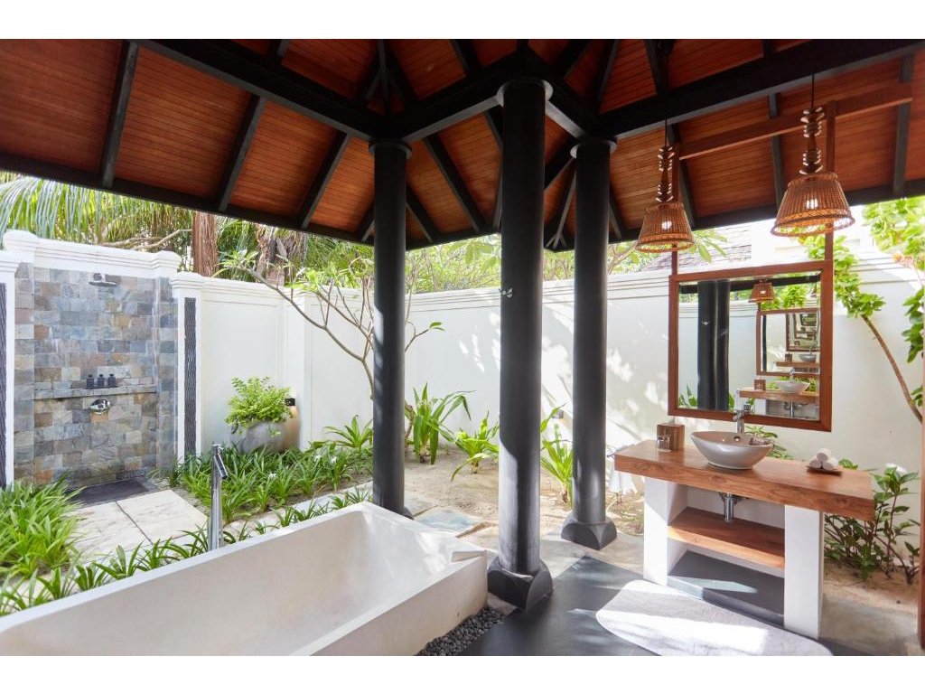 150 m², přímo u pláže, bazén, venkovní koupelna, soukromí, tropická zeleň.