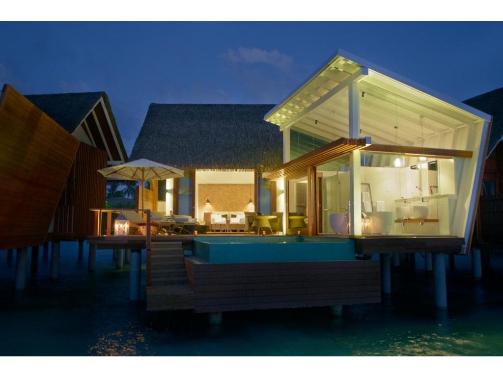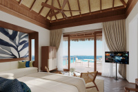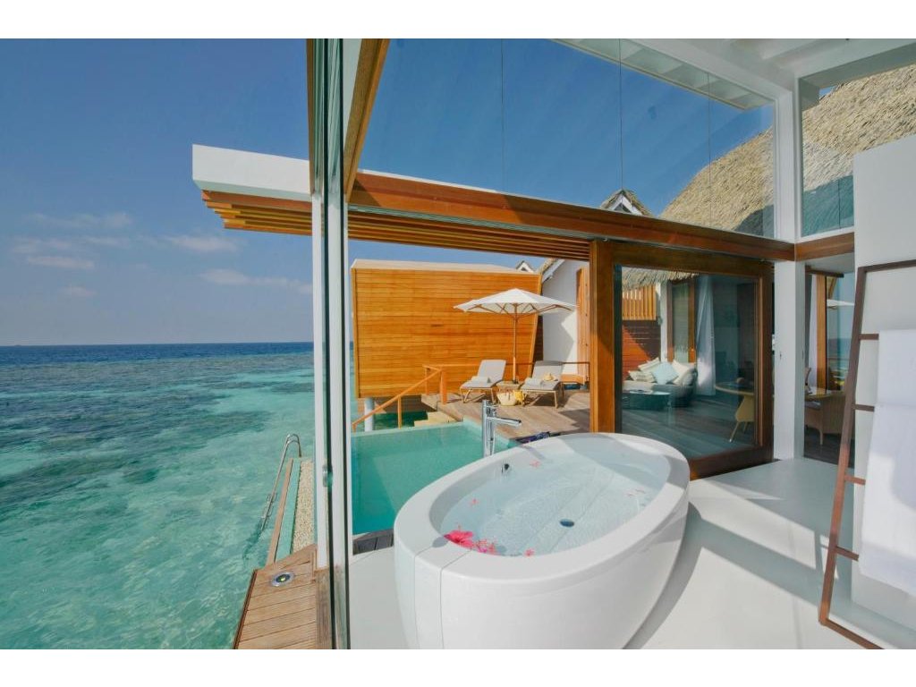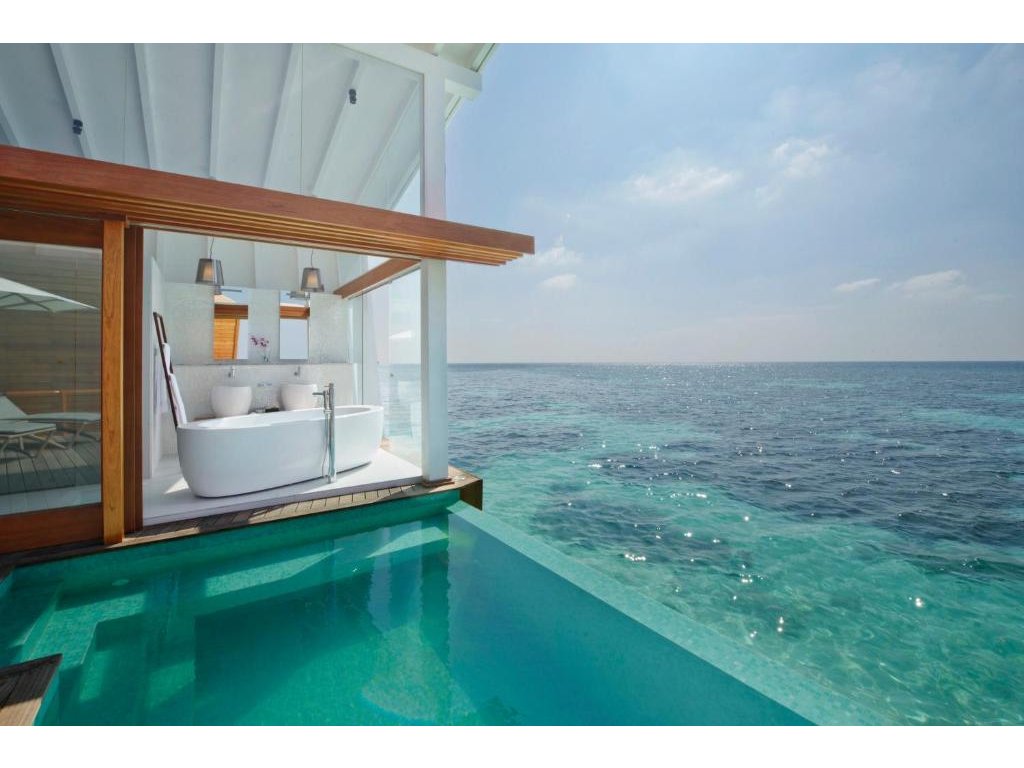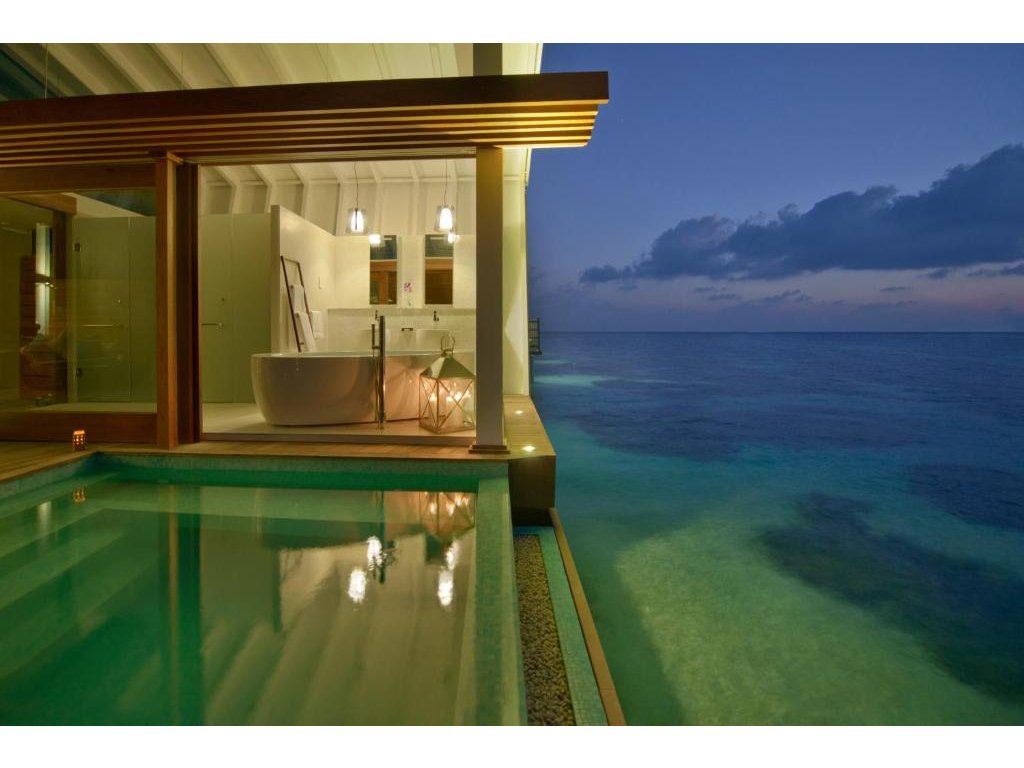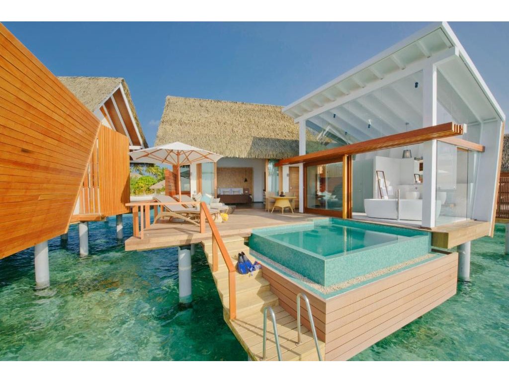 90 m², nadvodní vila s přímým vstupem do laguny, vlastním bazénem, sluneční terasou a výhledem na oceán.