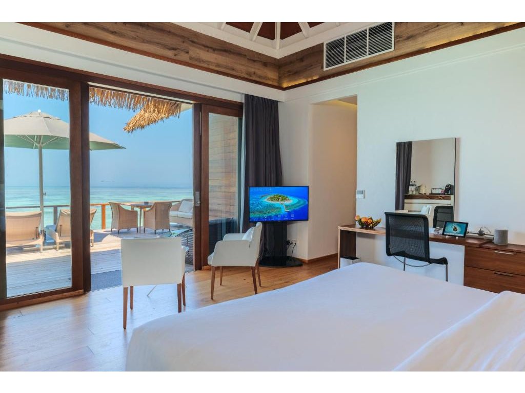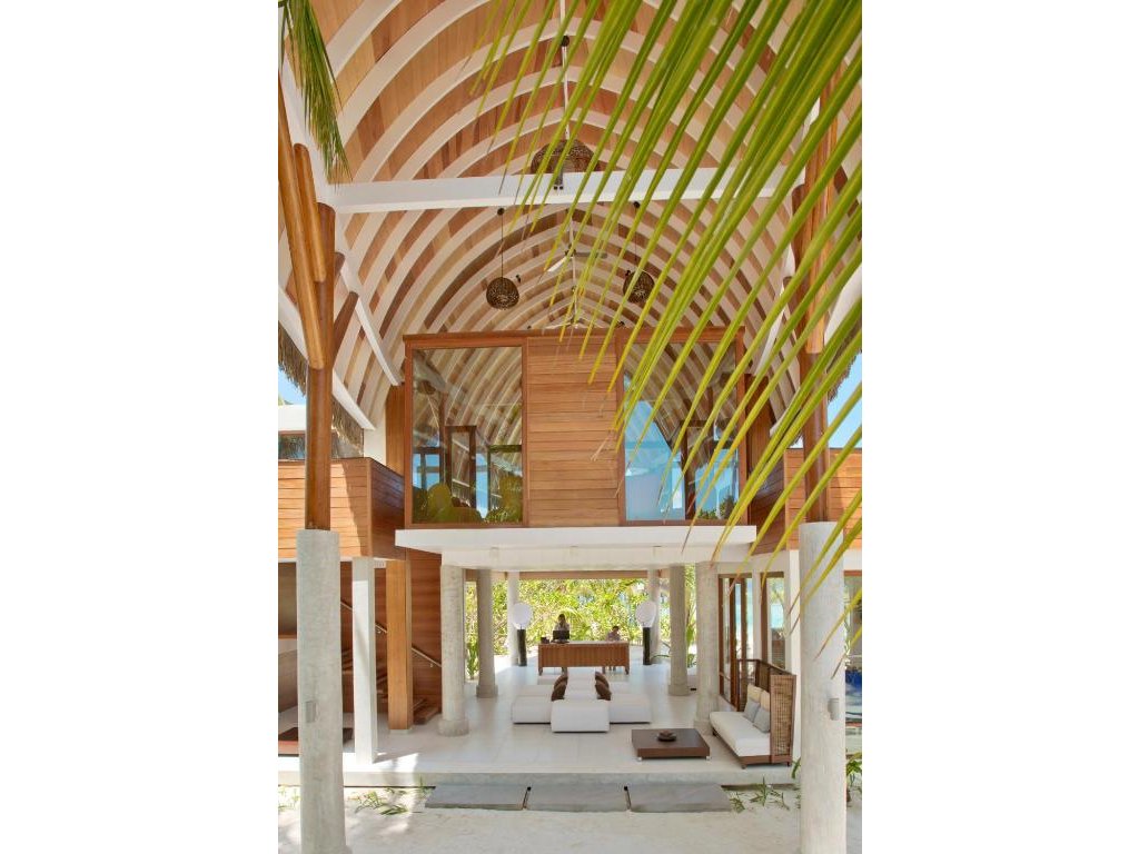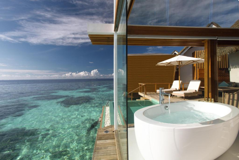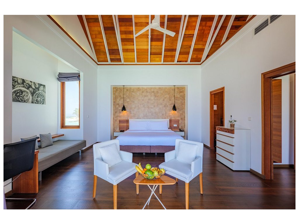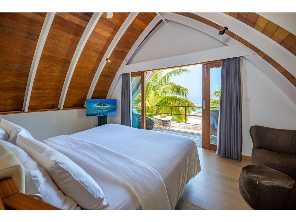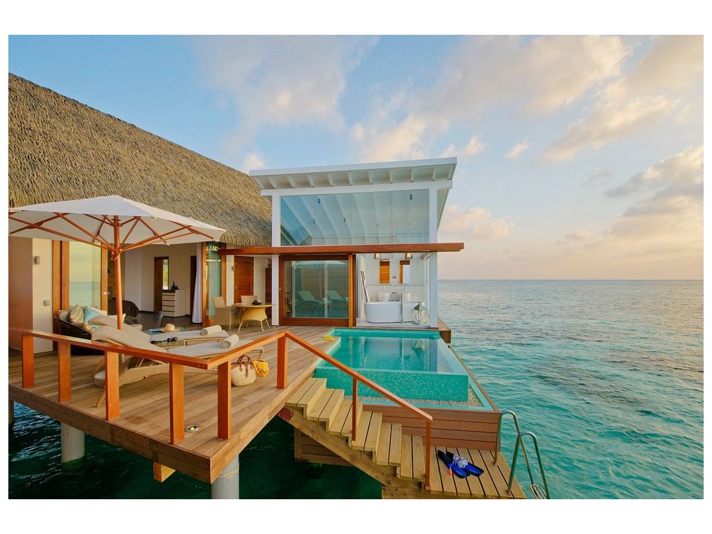 90 m², nadvodní vila s přímým vstupem do laguny, vlastním bazénem, sluneční terasou a výhledem na oceán.