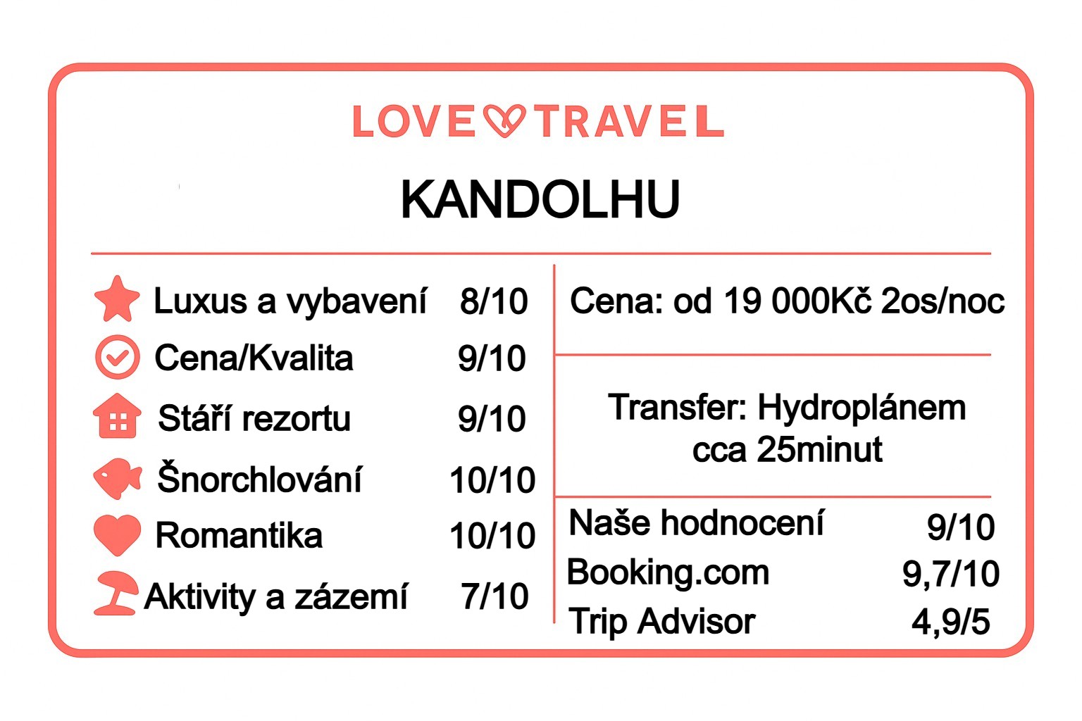 Kandolhu Maldives patří mezi nejlepší boutique resorty na Maledivách – ideální volba pro páry hledající klid, romantiku a špičkovou gastronomii. Vyniká kombinací krásného house reefu, komorní atmosféry a vynikajícího poměru cena/výkon. V porovnání s většími resorty nabízí více soukromí a osobní přístup, a to vše v kombinaci s výbornou kuchyní a luxusními vilami. Díky tomu je často řazen mezi top destinace pro páry a svatební cesty.