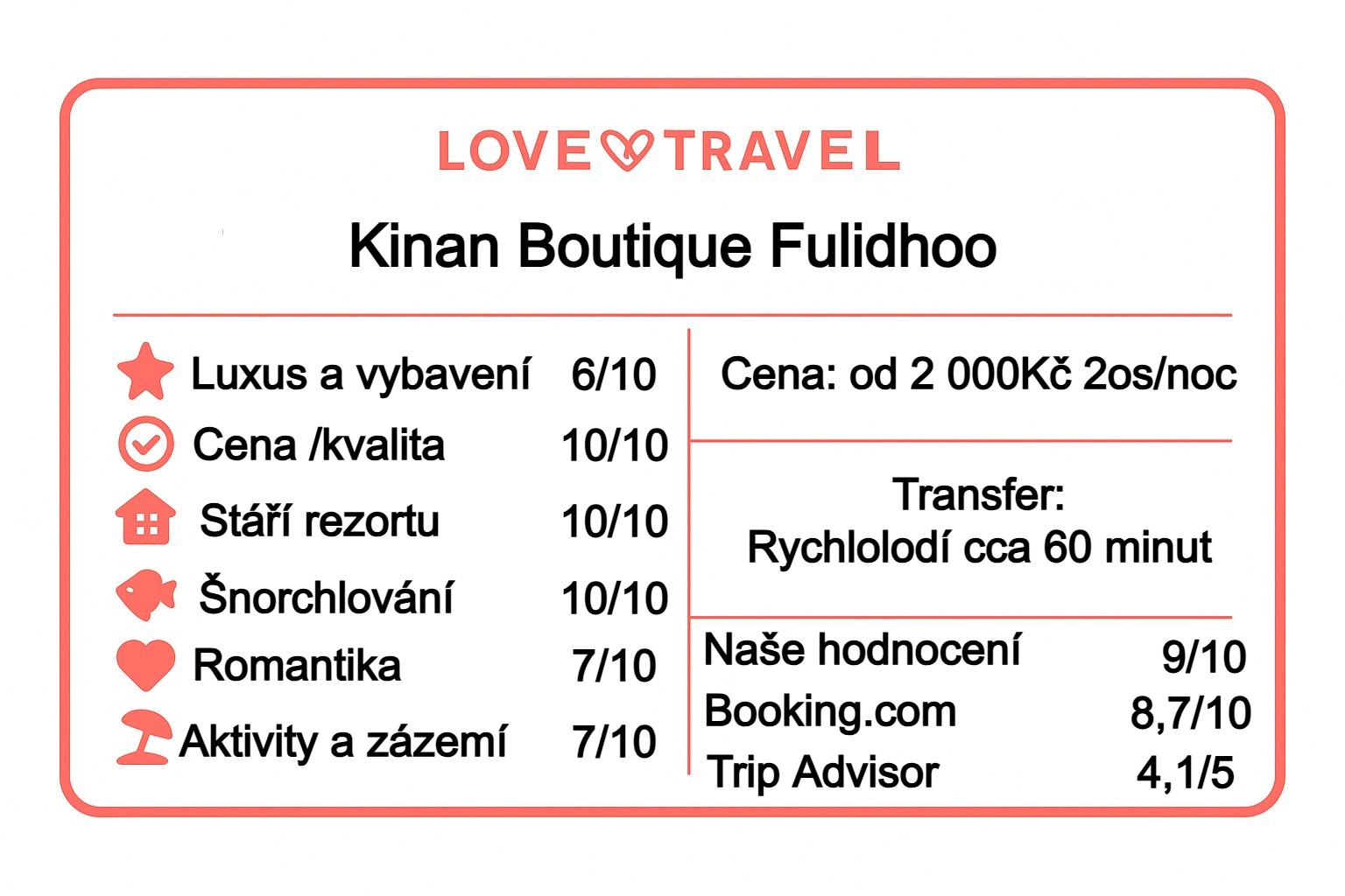 Kinan Boutique je výborná volba pro cenově rozumnou dovolenou na lokálním ostrově s krásnou pláží a možností skvělého šnorchlování. Ideální pro páry i kamarády, kteří nehledají plný servis pětihvězdičkového resortu, ale čisté a moderní ubytování v top lokaci.