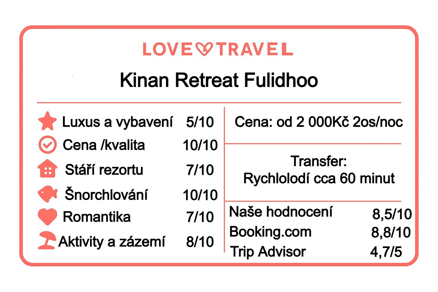- Kritika: menší ubytování bez „velkých“ resortových vymožeností; nabídka je závislá na obsazenosti ostrova.