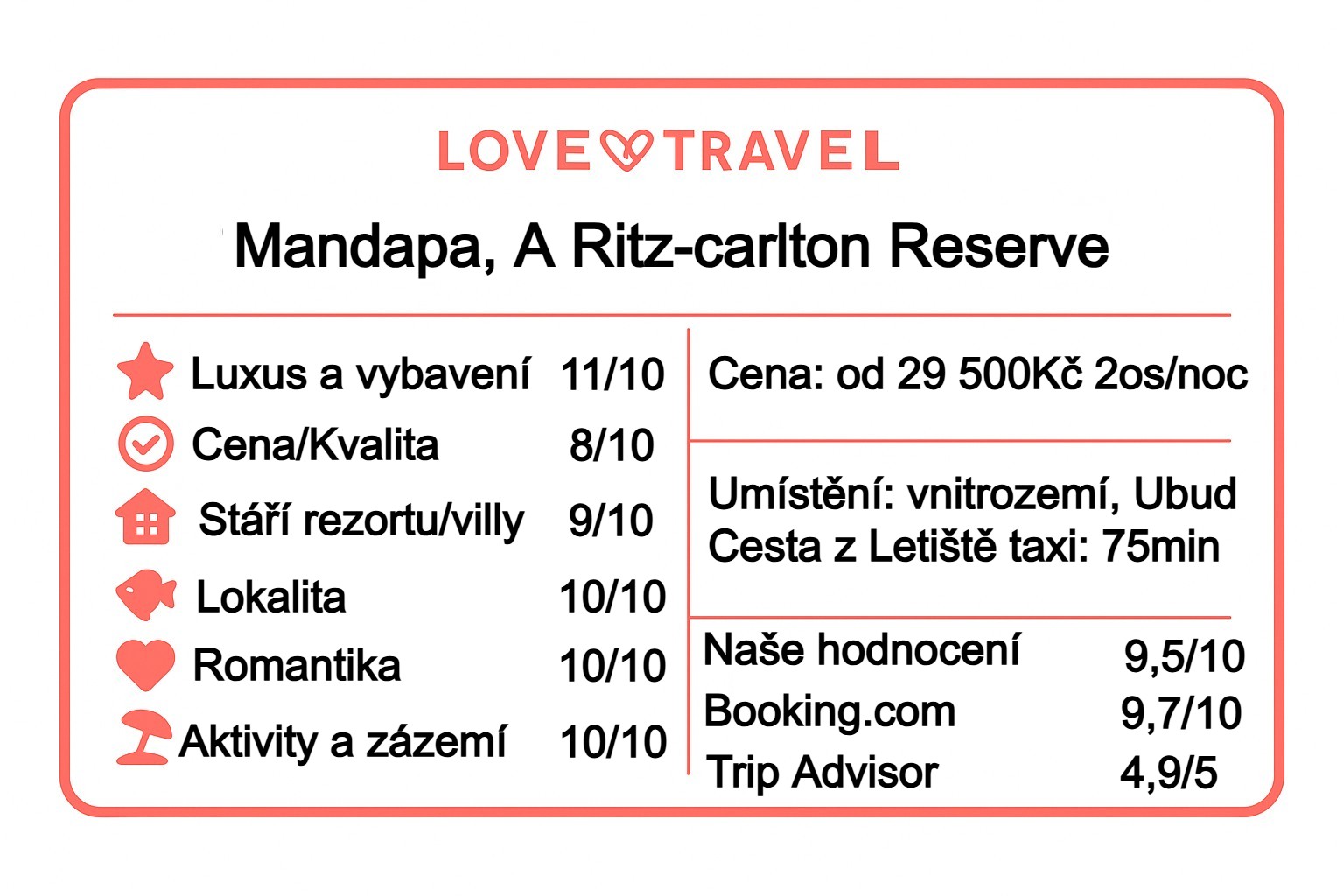 Mandapa patří do nejužší světové špičky balijského luxusu. Vyniká mystickým prostředím u řeky, originální architekturou a velmi osobním, nenápadným servisem. Wellness & spa je hluboce založené na místních rituálech, gastronomie (Kubu, Sawah Terrace) je špičková. Zážitek je intimní a kultivovaný – bez davů a bez kompromisů.
