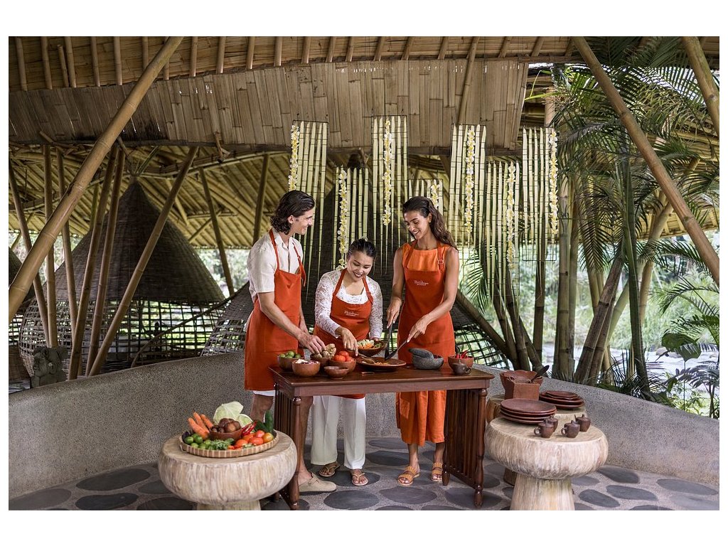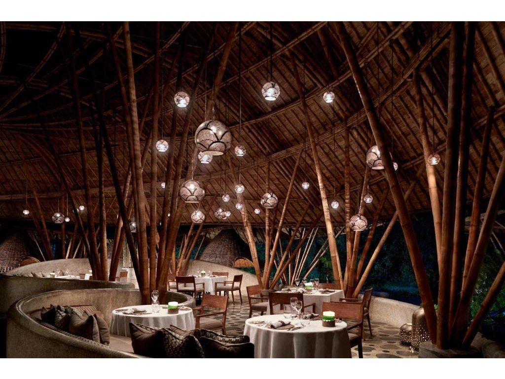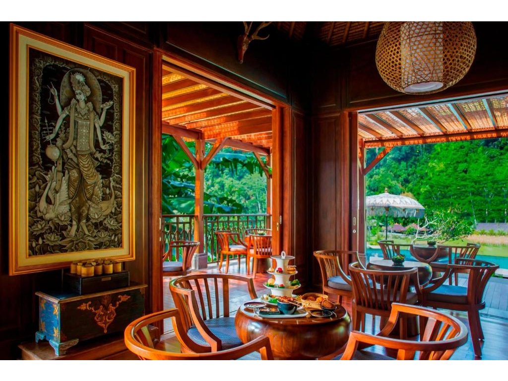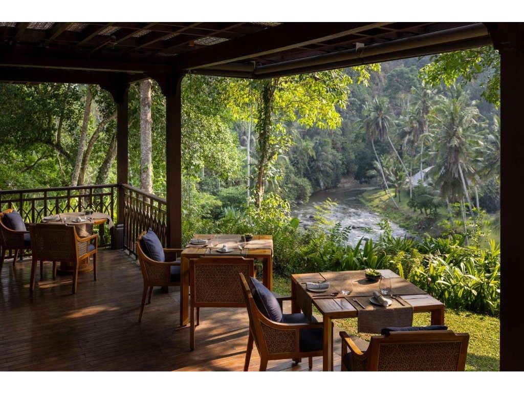 Signaturní Kubu at Mandapa (intimní bambusové „kokony“, středomořsko-evropská kuchyně) a Sawah Terrace (balijské & asijské chutě s panoramaty řeky). Dále The Library lounge a Pool Bar. Možnost privátního stolování v přírodě.