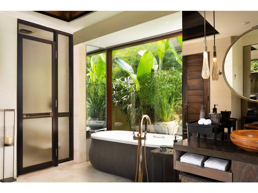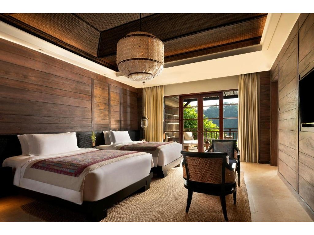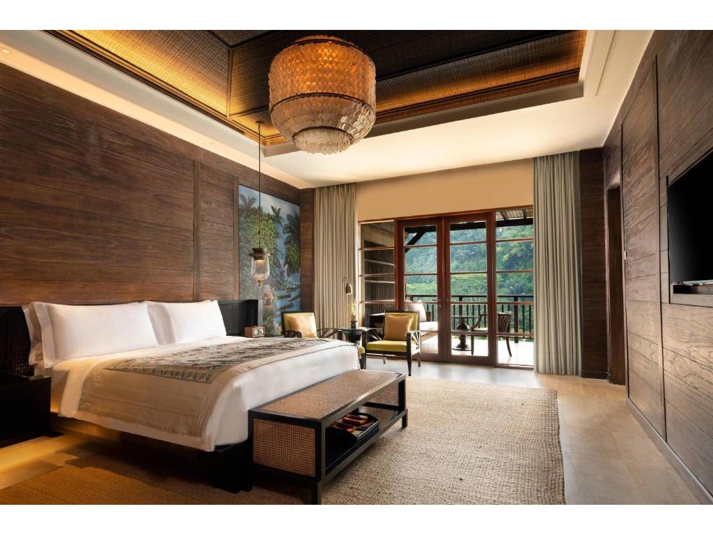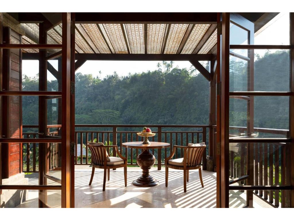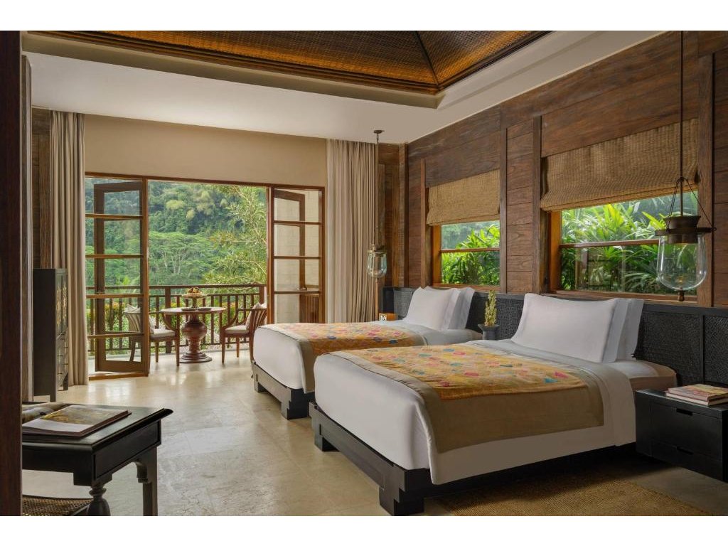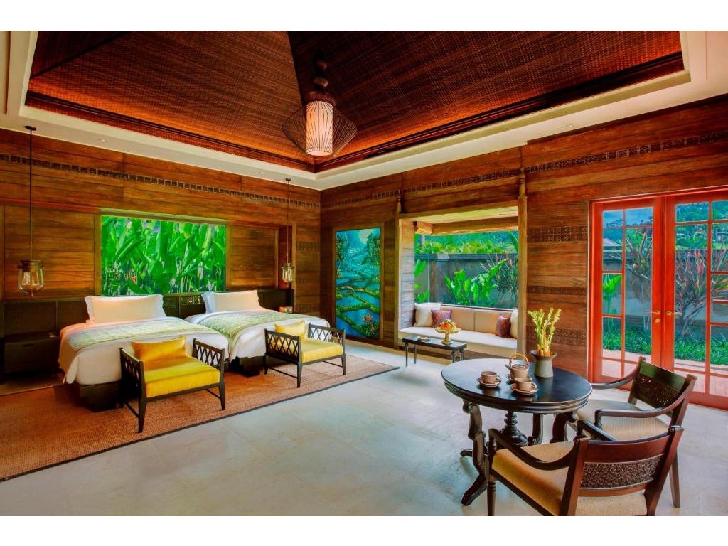 Velkorysé suity a vily (mnohé s privátním bazénem), vyhlídky do údolí řeky a rýžových polí, butler Patih 24/7, ikonické Kubu a Sawah Terrace, Mandapa Spa (vitality pool, sauny, jóga), fitness a kultivované společné prostory.
