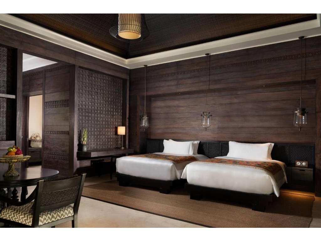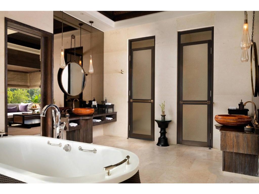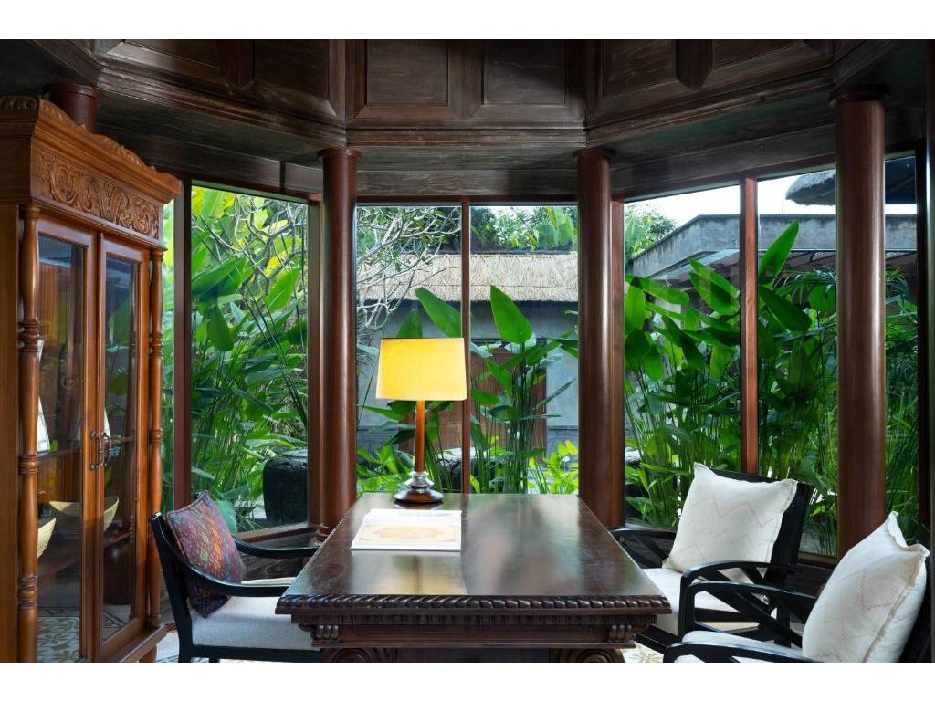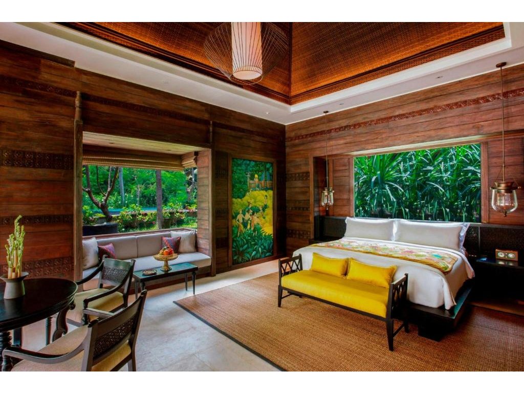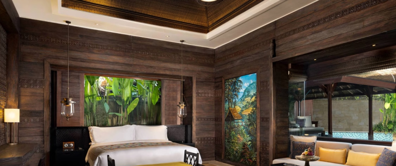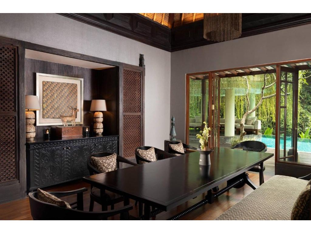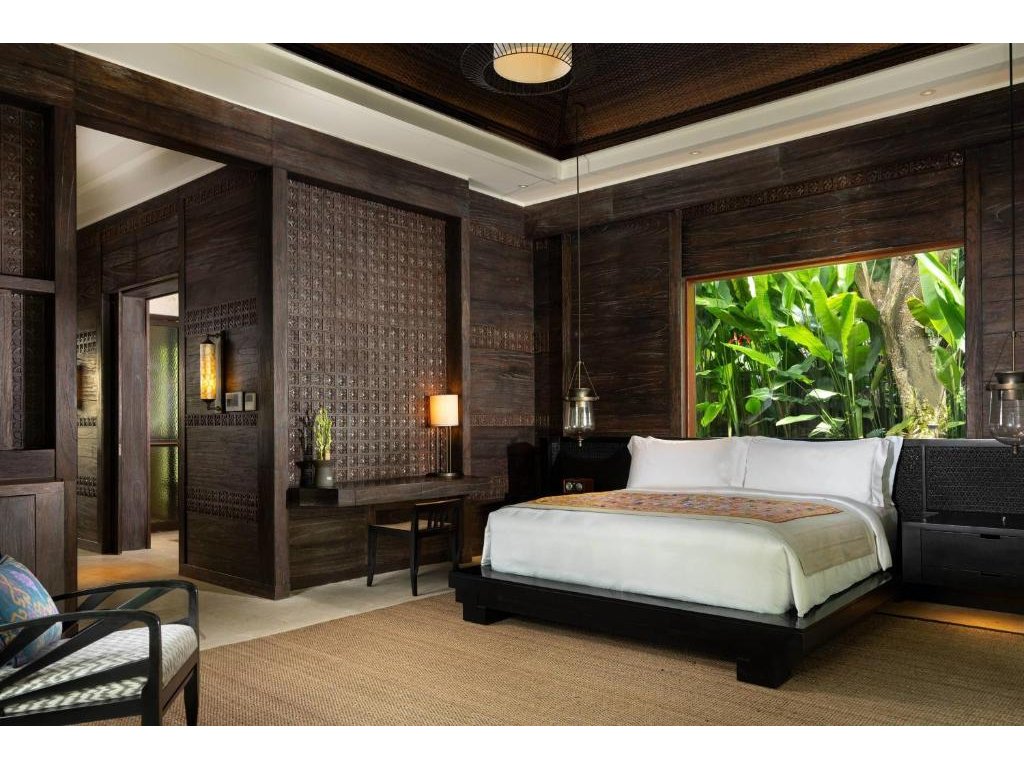 Velkorysé suity a vily (mnohé s privátním bazénem), vyhlídky do údolí řeky a rýžových polí, butler Patih 24/7, ikonické Kubu a Sawah Terrace, Mandapa Spa (vitality pool, sauny, jóga), fitness a kultivované společné prostory.
