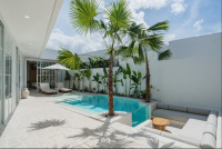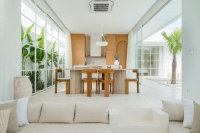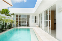 Novější/moderní vilový projekt v oblasti Bingin s průběžnou údržbou zahrad, bazénů a interiérů. Styl čistý, svěží, s přírodními materiály (dřevo, kámen, beton).