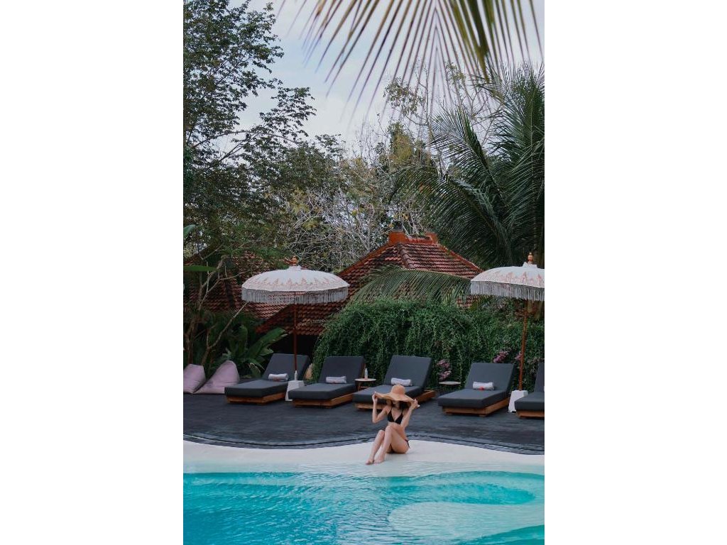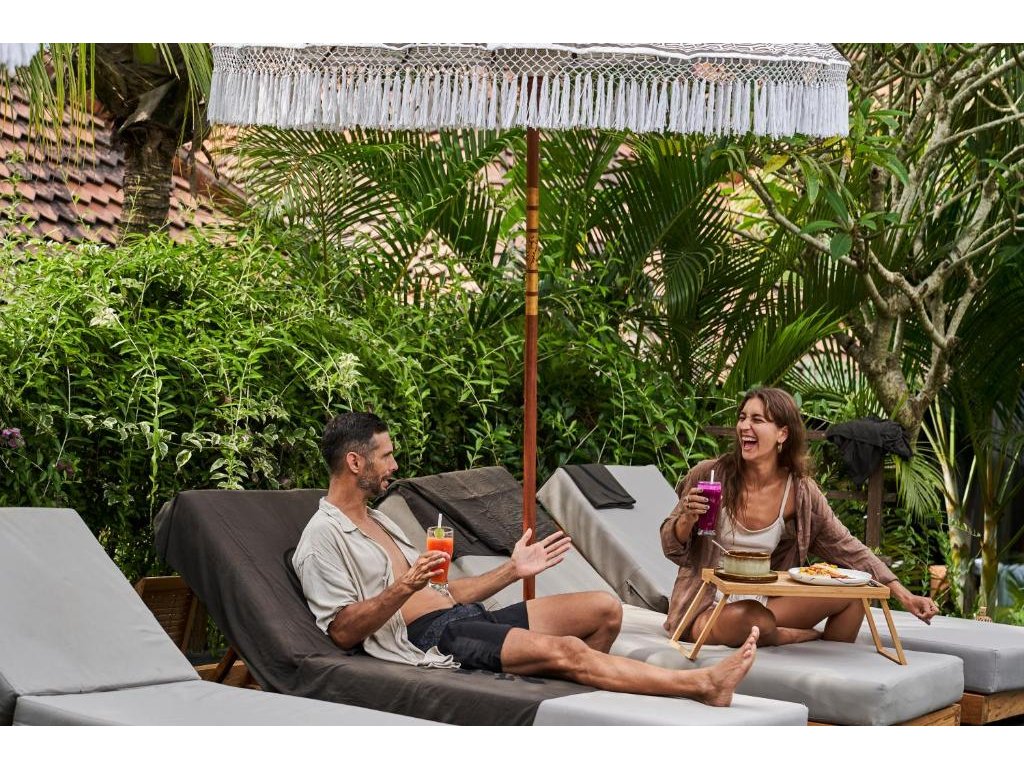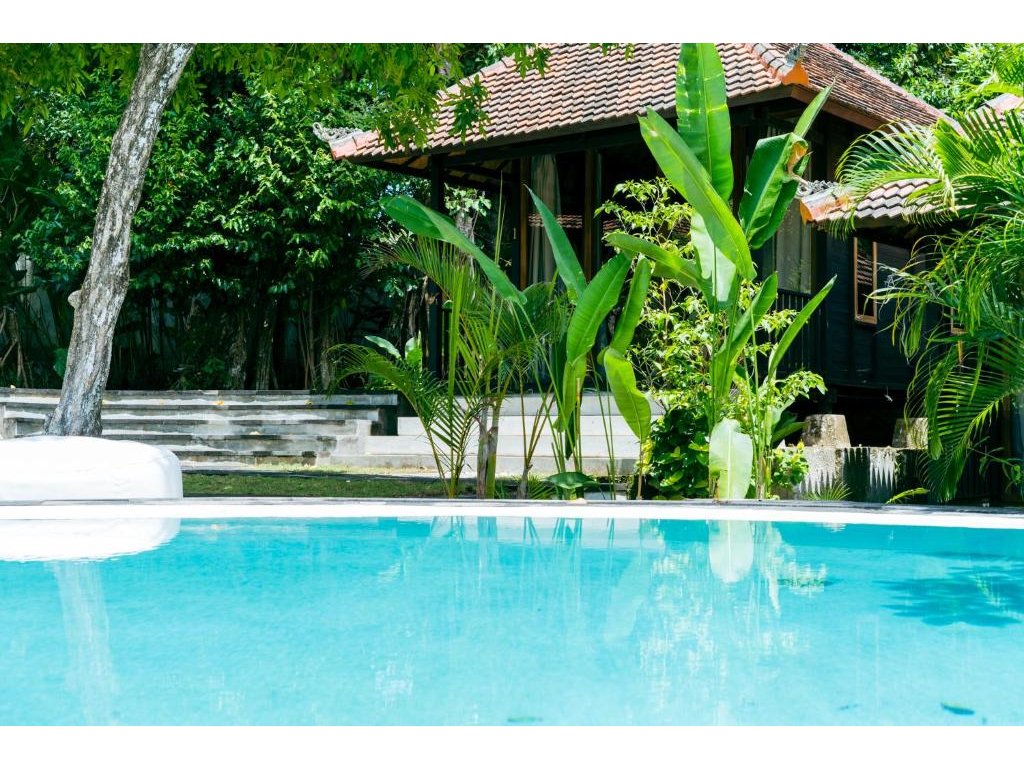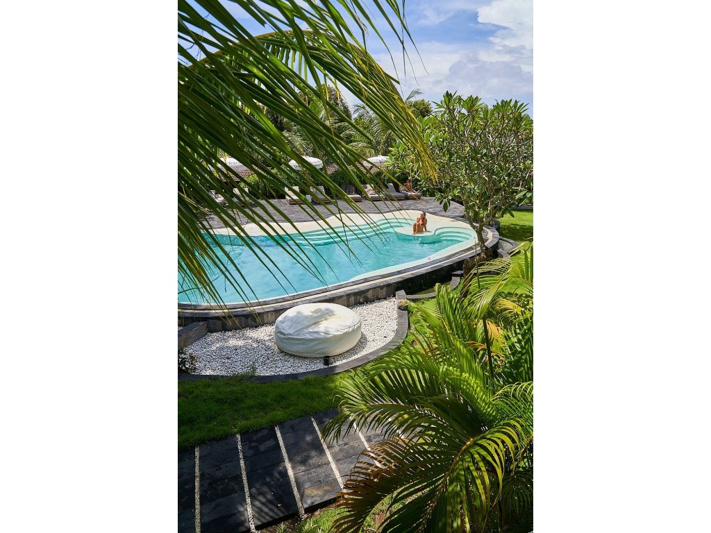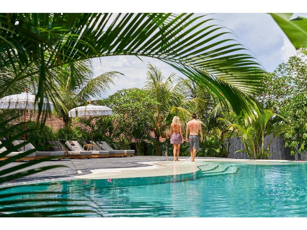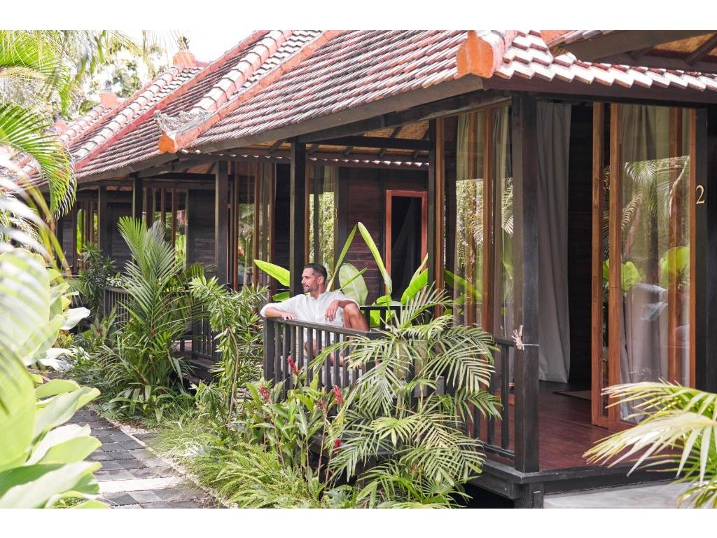 Stylové bungalovy a pokoje v tropické zahradě, hlavní bazén se sluneční terasou, útulná restaurace/bar, možnost jógy a masáží (dle nabídky). Adults-only klid, pohodová komunita hostů, snadný přístup k plážím a kavárnám v Bingin.