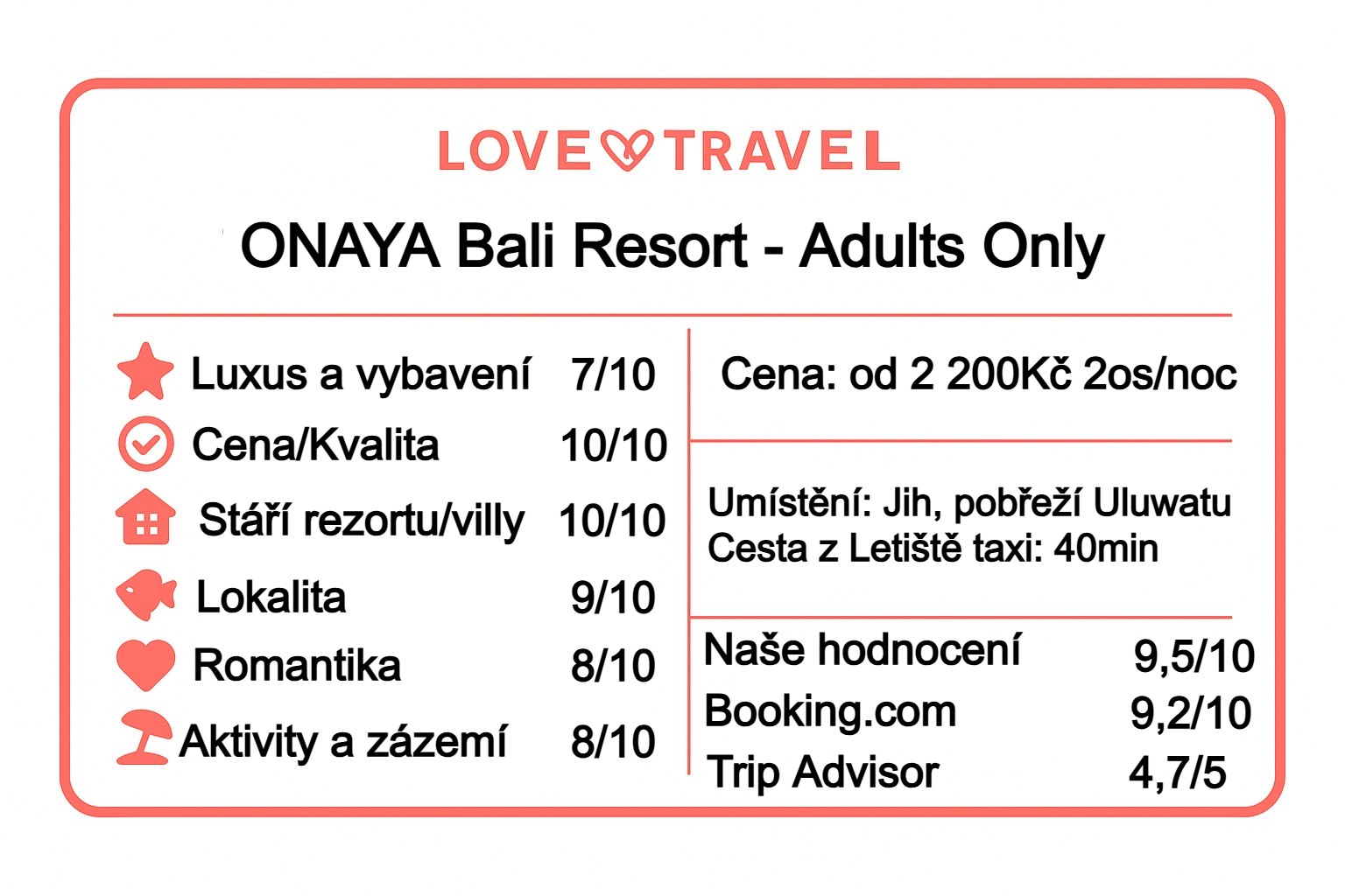 ONAYA Bali Resort – Adults Only je komorní volba v srdci Uluwatu: skvělá základna pro pláže a surf, přitom dost klidu na odpočinek. Oproti velkým cliff resortům nabízí dostupnější cenu a uvolněnou atmosféru; oproti rušným zónám (Canggu, Kuta) je prostředí klidnější a romantičtější.