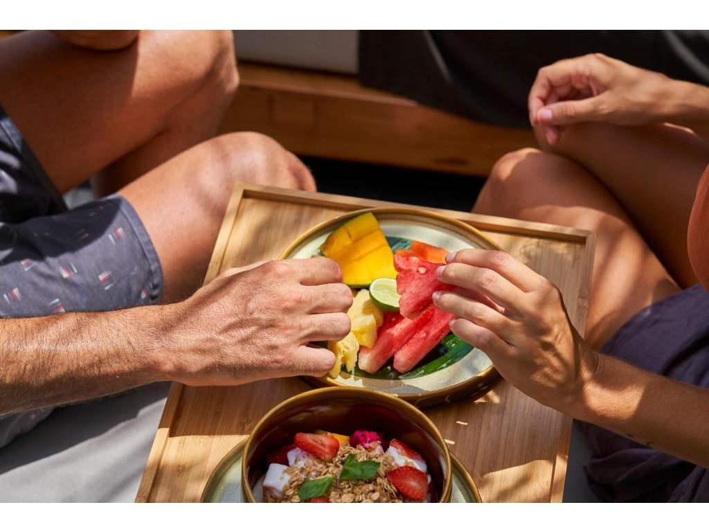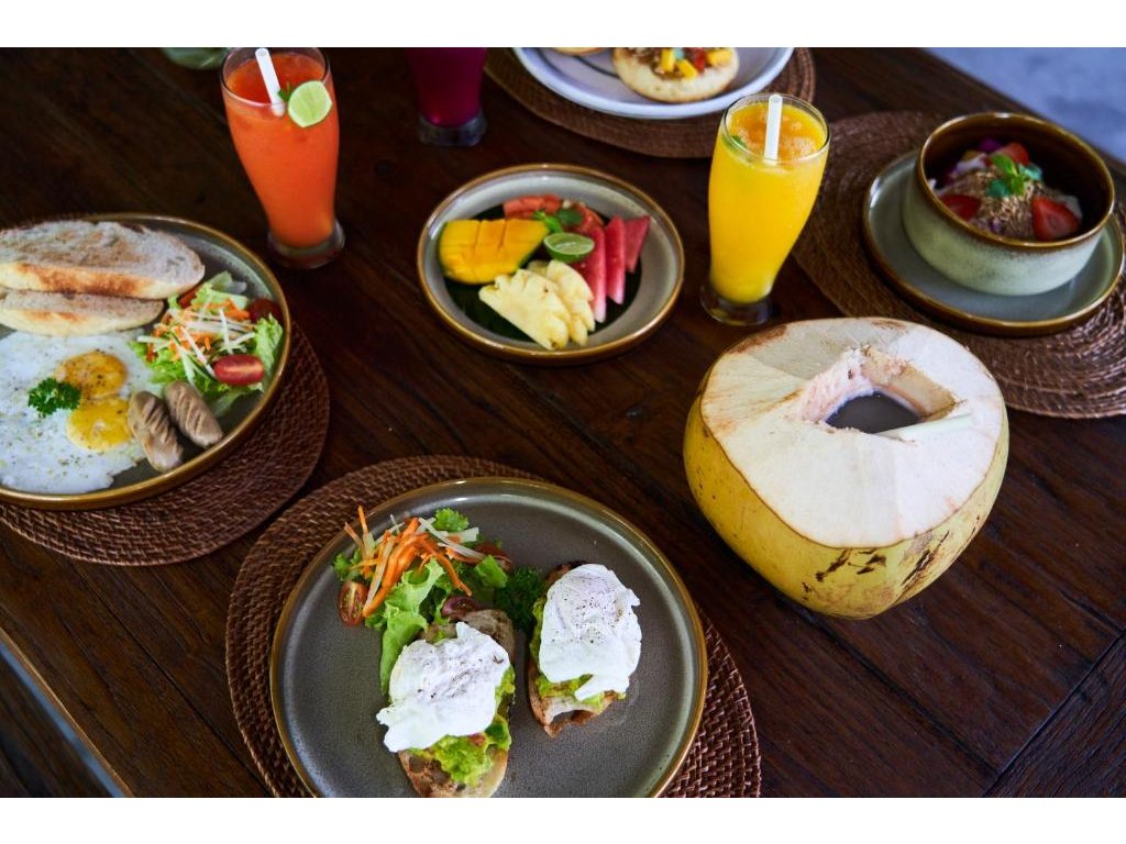 Resortová restaurace/bar se snídaněmi a lehkými jídly během dne; v pěším dosahu je bohatý výběr kaváren a bister v Bingin (zdravá kuchyně, smoothie bowls, seafood na útesu).